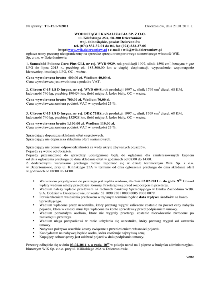Nr sprawy : TT-15.1-7/2011 DzierŜoniów, dnia 21.01.2011 r. WODOCIĄGI I KANALIZACJA SP. Z O.O. ul. Kilińskiego 25A, 58-200 DzierŜoniów woj. dolnośląskie, powiat DzierŜoniów tel. (074) 832-37-01 do 04, fax (074) 832-37-05 http://www.wik.dzierzoniow.pl ; e-mail : [email protected] ogłasza ustny przetarg nieograniczony na sprzedaŜ sprzętu transportowego stanowiącego własność WiK Sp. z o.o. w DzierŜoniowie: 1. Samochód Polonez Caro Plus GLI, nr rej. WYD 9929, rok produkcji 1997, silnik 1598 cm3, benzyna + gaz LPG do lipca 2013 r., przebieg ok. 183.500,00 km w ciągłej eksploatacji, wyposaŜenie: wspomaganie kierownicy, instalacja LPG, OC - waŜne. Cena wywoławcza brutto 400,00 zł. Wadium 40,00 zł. Cena wywoławcza jest zwolniona z podatku VAT. 2. Citroen C-15 1,8 D furgon, nr rej. WYD 6048, rok produkcji 1997 r., silnik 1769 cm3 diesel, 68 KM, ładowność 740 kg, przebieg 190454 km, ilość miejsc 5, kolor biały, OC – waŜne. Cena wywoławcza brutto 700,00 zł. Wadium 70,00 zł. Cena wywoławcza zawiera podatek VAT w wysokości 23 %. 3. Citroen C-15 1,8 D furgon, nr rej. DDZ 73HS, rok produkcji 1997 r., silnik 1769 cm3 diesel, 68 KM, ładowność 740 kg, przebieg 152928 km, ilość miejsc 5, kolor biały, OC – waŜne. Cena wywoławcza brutto 1.100,00 zł. Wadium 110,00 zł. Cena wywoławcza zawiera podatek VAT w wysokości 23 %. Sprzedający dopuszcza składania ofert częściowych. Sprzedający nie dopuszcza składania ofert wariantowych. Sprzedający nie ponosi odpowiedzialności za wady ukryte zbywanych pojazdów. Pojazdy są wolne od obciąŜeń. Pojazdy przeznaczone do sprzedaŜy udostępnione będą do oglądania dla zainteresowanych kupnem od dnia ogłoszenia przetargu do dnia składania ofert w godzinach od 08:00 do 14:00. Z dodatkowymi warunkami przetargu moŜna zapoznać się w dziale technicznym WiK Sp. z o.o. w DzierŜoniowie, przy ul. Kilińskiego 25A w terminie od dnia ogłoszenia przetargu do dnia składania ofert w godzinach od 08:00 do 14:00. Warunkiem przystąpienia do przetargu jest wpłata wadium, do dnia 03.02.2011 r. do godz. 930. Dowód wpłaty wadium naleŜy przedłoŜyć Komisji Przetargowej przed rozpoczęciem przetargu. Wadium naleŜy wpłacić przelewem na rachunek bankowy Sprzedającego w Banku Zachodnim WBK S.A. Oddział w DzierŜoniowie, nr konta: 52 1090 2301 0000 0005 9000 0079. Potwierdzeniem wniesienia przelewem w Ŝądanym terminie będzie data wpływu środków na konto Sprzedającego. Wadium wpłacone przez uczestnika, który przetarg wygrał zaliczone zostanie na poczet ceny nabycia pojazdu, która w całości musi być wpłacona na konto sprzedawcy przed podpisaniem umowy. Wadium pozostałym osobom, które nie wygrały przetargu zostanie niezwłocznie zwrócone po zamknięciu przetargu. Wadium ulega przepadkowi w razie uchylenia się uczestnika, który przetarg wygrał od zawarcia umowy. Nabywca pokrywa wszelkie koszty związane z przeniesieniem własności pojazdu. Kandydatem na nabywcę będzie osoba, która zaoferuje najwyŜszą cenę. Kupujący zobowiązany jest odebrać pojazd w dniu podpisania umowy. Przetarg odbędzie się w dniu 03.02.2011 r. o godz. 1000 w pokoju narad na I piętrze w budynku administracyjnobiurowym WiK Sp. z o.o. przy ul. Kilińskiego 25A w DzierŜoniowie. verte Przetarg uwaŜa się za zakończony z wynikiem negatywnym, jeŜeli Ŝaden z uczestników nie zaoferuje ceny wyŜszej od ceny wywoławczej. Osobami ze strony Zamawiającego, upowaŜnionymi do porozumiewania się z Wykonawcami w celu udzielania wyjaśnień są: - w sprawach formalnych – Małgorzata Kowalska Maź – Inspektor ds. Technicznych WiK Sp. z o.o. w DzierŜoniowie w godz. 800 do 1400, tel. (074) 832-20-73 lub 74. - w sprawach szczegółowych pojazdów– Władysław Karaszewski – Kierownik Działu Utrzymania Ruchu Wodociągów i Kanalizacji Sp. z o.o. w DzierŜoniowie w godz. 800 do 1400, tel. (074) 832-20-76. Sprzedającemu przysługuje prawo zamknięcia przetargu bez wybrania którejkolwiek z ofert. ZATWIERDZAM Prezes Zarządu WiK Sp. z o.o. w DzierŜoniowie
