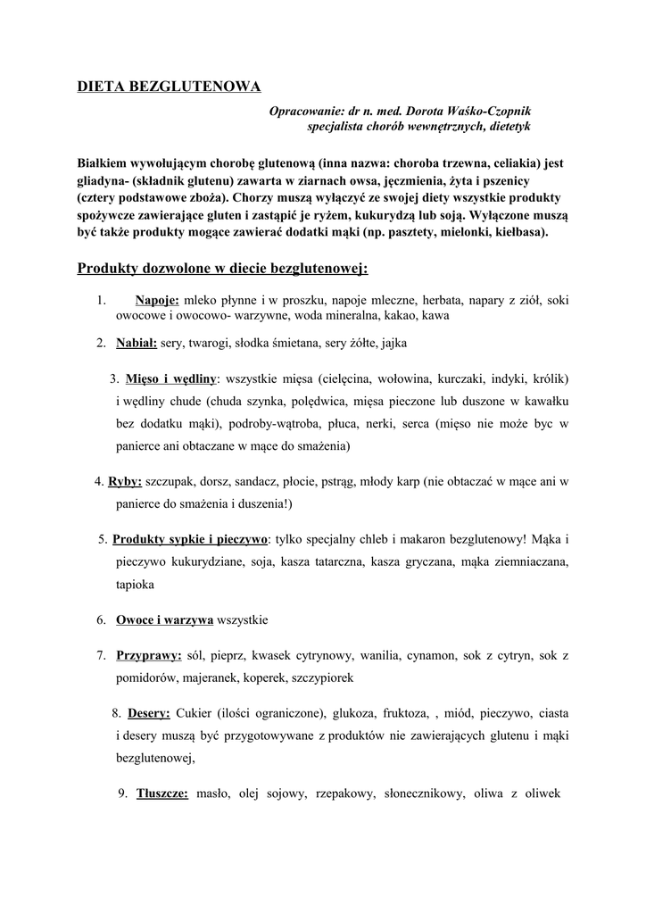 DIETA BEZGLUTENOWA Opracowanie: dr n. med. Dorota Waśko-Czopnik specjalista chorób wewnętrznych, dietetyk Białkiem wywołującym chorobę glutenową (inna nazwa: choroba trzewna, celiakia) jest gliadyna- (składnik glutenu) zawarta w ziarnach owsa, jęczmienia, żyta i pszenicy (cztery podstawowe zboża). Chorzy muszą wyłączyć ze swojej diety wszystkie produkty spożywcze zawierające gluten i zastąpić je ryżem, kukurydzą lub soją. Wyłączone muszą być także produkty mogące zawierać dodatki mąki (np. pasztety, mielonki, kiełbasa). Produkty dozwolone w diecie bezglutenowej: 1. Napoje: mleko płynne i w proszku, napoje mleczne, herbata, napary z ziół, soki owocowe i owocowo- warzywne, woda mineralna, kakao, kawa 2. Nabiał: sery, twarogi, słodka śmietana, sery żółte, jajka 3. Mięso i wędliny: wszystkie mięsa (cielęcina, wołowina, kurczaki, indyki, królik) i wędliny chude (chuda szynka, polędwica, mięsa pieczone lub duszone w kawałku bez dodatku mąki), podroby-wątroba, płuca, nerki, serca (mięso nie może byc w panierce ani obtaczane w mące do smażenia) 4. Ryby: szczupak, dorsz, sandacz, płocie, pstrąg, młody karp (nie obtaczać w mące ani w panierce do smażenia i duszenia!) 5. Produkty sypkie i pieczywo: tylko specjalny chleb i makaron bezglutenowy! Mąka i pieczywo kukurydziane, soja, kasza tatarczna, kasza gryczana, mąka ziemniaczana, tapioka 6. Owoce i warzywa wszystkie 7. Przyprawy: sól, pieprz, kwasek cytrynowy, wanilia, cynamon, sok z cytryn, sok z pomidorów, majeranek, koperek, szczypiorek 8. Desery: Cukier (ilości ograniczone), glukoza, fruktoza, , miód, pieczywo, ciasta i desery muszą być przygotowywane z produktów nie zawierających glutenu i mąki bezglutenowej, 9. Tłuszcze: masło, olej sojowy, rzepakowy, słonecznikowy, oliwa z oliwek Produkty zabronione w diecie bezglutenowej: 1. Napoje: mleko słodzone, słodkie wina, piwo, szampan 2. Produkty sypkie i pieczywo: mąka pszenna, żytnia, z owsa, jęczmienia i pszenicy, makarony, kluski, placki, ciasta, biszkopty, sucharki, kasza manna, jęczmienna, owsiana, wszelkie gatunki pieczywa rynkowego 3. Mięso i wędliny: tłuste gatunki mięsa (wieprzowe, baranie, pasztety, salcesony, konserwy mięsne i rybne, suszone kiełbasy) mięso smażone, peklowane, wędzone 4. Ryby: tłuste ryby: węgorz, łosoś, śledź wędzony 5. Warzywa: smażone ziemniaki, smażona kapusta, ogórki kiszone, groch, bób, rzepa, soczewica, pikle 6. Owoce mrożone, suszone, orzechy (wszystkie rodzaje) 7. Słodycze i wyroby ciastkarskie: dżemy i marmolady rynkowe, wyroby cukiernicze, ciastka, karmel, cukierki z mąką, chałwa, czekolada, marcepan oraz wszystkie słodycze zawierające dodatki z mąki i ww. zbóż 8. Tłuszcze i przyprawy: margaryna, boczek, majonezy, musztarda, ocet, curry, chilli, papryka, pieprz 9. Oraz wszystkie przetwory zawierający ww. rodzaje zbóż, produkty gotowe zawierające wyżej wymienione składniki, zasmażki, zawiesiste sosy podbijane mąką i śmietaną, wszystkie przetwory zawierające dodatki z zawartością glutenu