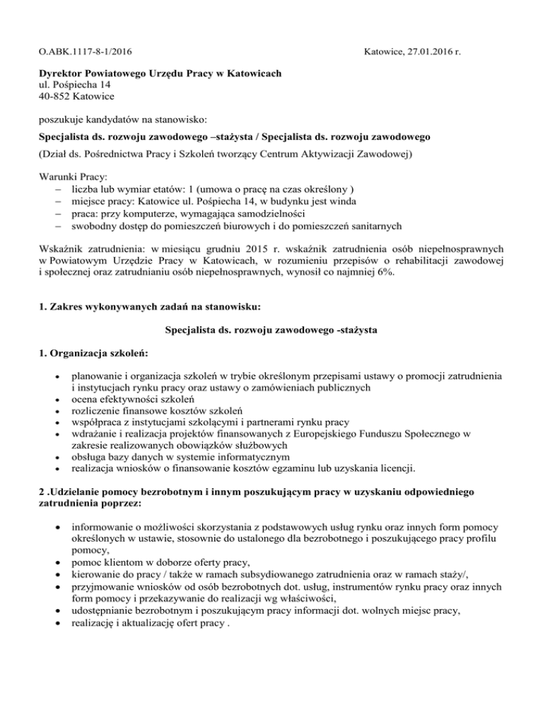 O.ABK.1117-8-1/2016 Katowice, 27.01.2016 r. Dyrektor Powiatowego Urzędu Pracy w Katowicach ul. Pośpiecha 14 40-852 Katowice poszukuje kandydatów na stanowisko: Specjalista ds. rozwoju zawodowego –stażysta / Specjalista ds. rozwoju zawodowego (Dział ds. Pośrednictwa Pracy i Szkoleń tworzący Centrum Aktywizacji Zawodowej) Warunki Pracy: liczba lub wymiar etatów: 1 (umowa o pracę na czas określony ) miejsce pracy: Katowice ul. Pośpiecha 14, w budynku jest winda praca: przy komputerze, wymagająca samodzielności swobodny dostęp do pomieszczeń biurowych i do pomieszczeń sanitarnych Wskaźnik zatrudnienia: w miesiącu grudniu 2015 r. wskaźnik zatrudnienia osób niepełnosprawnych w Powiatowym Urzędzie Pracy w Katowicach, w rozumieniu przepisów o rehabilitacji zawodowej i społecznej oraz zatrudnianiu osób niepełnosprawnych, wynosił co najmniej 6%. 1. Zakres wykonywanych zadań na stanowisku: Specjalista ds. rozwoju zawodowego -stażysta 1. Organizacja szkoleń: planowanie i organizacja szkoleń w trybie określonym przepisami ustawy o promocji zatrudnienia i instytucjach rynku pracy oraz ustawy o zamówieniach publicznych ocena efektywności szkoleń rozliczenie finansowe kosztów szkoleń współpraca z instytucjami szkolącymi i partnerami rynku pracy wdrażanie i realizacja projektów finansowanych z Europejskiego Funduszu Społecznego w zakresie realizowanych obowiązków służbowych obsługa bazy danych w systemie informatycznym realizacja wniosków o finansowanie kosztów egzaminu lub uzyskania licencji. 2 .Udzielanie pomocy bezrobotnym i innym poszukującym pracy w uzyskaniu odpowiedniego zatrudnienia poprzez: informowanie o możliwości skorzystania z podstawowych usług rynku oraz innych form pomocy określonych w ustawie, stosownie do ustalonego dla bezrobotnego i poszukującego pracy profilu pomocy, pomoc klientom w doborze oferty pracy, kierowanie do pracy / także w ramach subsydiowanego zatrudnienia oraz w ramach staży/, przyjmowanie wniosków od osób bezrobotnych dot. usług, instrumentów rynku pracy oraz innych form pomocy i przekazywanie do realizacji wg właściwości, udostępnianie bezrobotnym i poszukującym pracy informacji dot. wolnych miejsc pracy, realizację i aktualizację ofert pracy . Specjalista ds. rozwoju zawodowego 1. Organizacja szkoleń planowanie i organizacja szkoleń oraz przygotowania zawodowego dorosłych w trybie określonym przepisami ustawy o promocji zatrudnienia i instytucjach rynku pracy oraz ustawy o zamówieniach publicznych ocena efektywności szkoleń i przygotowania zawodowego dorosłych rozliczenie finansowe kosztów szkoleń i przygotowania zawodowego dorosłych współpraca z instytucjami szkolącymi i partnerami rynku pracy wdrażanie i realizacja projektów finansowanych z Europejskiego Funduszu Społecznego w zakresie realizowanych obowiązków służbowych obsługa bazy danych w systemie informatycznym realizacja wniosków o finansowanie kosztów egzaminu lub uzyskania licencji. 2. Pełnienie funkcji doradcy klienta w zakresie stałej opieki nad osobą bezrobotną lub poszukującą pracy, w szczególności : ustalanie profilu pomocy, ustalenie potrzeb klienta w aspekcie jego sytuacji zawodowej oraz sytuacji na rynku pracy, przygotowanie i nadzór nad realizacją Indywidualnego Planu Działania, informowanie o możliwości skorzystania z podstawowych usług rynku oraz innych form pomocy określonych w ustawie, stosownie do ustalonego dla bezrobotnego i poszukującego pracy profilu pomocy pomoc klientom w doborze oferty pracy, kierowanie do pracy / także w ramach subsydiowanego zatrudnienia oraz w ramach staży/, przyjmowanie wniosków od osób bezrobotnych dot. usług, instrumentów rynku pracy oraz innych form pomocy i przekazywanie do realizacji wg właściwości, udostępnianie bezrobotnym i poszukującym pracy informacji dot. wolnych miejsc pracy, realizacja i aktualizacja ofert pracy . 2. Wymagania niezbędne (konieczne do podjęcia pracy): a) wykształcenie: wyższe, preferowane kierunki wykształcenia : doradztwo zawodowe, zarządzanie i marketing, pedagogika, psychologia, zarządzanie zasobami ludzkimi, public relations b) staż pracy: - Specjalista ds. rozwoju zawodowego -stażysta: nie dotyczy - Specjalista ds. rozwoju zawodowego: 1 rok pracy w zakresie organizacji szkoleń w publicznych służbach zatrudnienia (należy udokumentować) c) znajomość przepisów ustawy o promocji zatrudnienia i instytucjach rynku pracy z dnia 20 kwietnia 2004 r./ z późn. zm./ oraz ustawy Prawo zamówień publicznych d) znajomość Kodeksu postępowania administracyjnego, Kodeksu Pracy, e) znajomość ustawy o samorządzie gminnym, f) znajomość ustawy o pracownikach samorządowych, ustawy o rehabilitacji zawodowej i społecznej oraz zatrudnianiu osób niepełnosprawnych g) niekaralność h) pełna zdolność do czynności prawnych oraz korzystanie z pełni praw publicznych i) brak skazania prawomocnym wyrokiem sądu za umyślne przestępstwo ścigane z oskarżenia publicznego lub umyślne przestępstwo skarbowe j) nieposzlakowana opinia 3. Wymagania dodatkowe (pozwalające na optymalne wykonywanie zadań): a) obsługa komputera - pakiet MS Office, b) komunikatywność, samodzielność, odpowiedzialność, umiejętność sprawnej organizacji pracy na stanowisku pracy, kreatywność, odporność na stres, dyspozycyjność. 4. Wymagane dokumenty: a) życiorys (CV) b) list motywacyjny c) kserokopie dyplomów, świadectw lub innych dokumentów potwierdzających wykształcenie d) kserokopie świadectw pracy lub zaświadczenie potwierdzający wymagany staż pracy e) kserokopie zaświadczeń o ukończonych kursach, szkoleniach, stażach f)oświadczenie o niekaralności (wg wzoru udostępnionego na stronie BIP) g) oświadczenie o wyrażaniu zgody na przetwarzanie danych osobowych do celów rekrutacji (wg wzoru udostępnionego na stronie BIP) h) oświadczenie kandydata o nieprowadzeniu działalności gospodarczej bądź o p