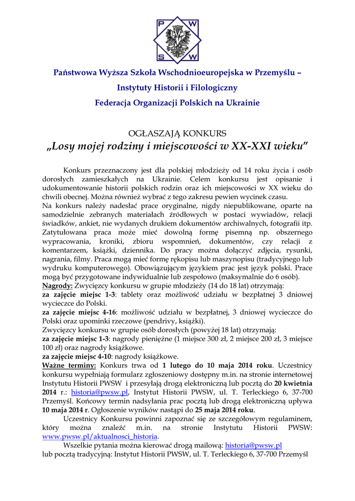 Państwowa Wyższa Szkoła Wschodnioeuropejska w Przemyślu – Instytuty Historii i Filologiczny Federacja Organizacji Polskich na Ukrainie OGŁASZAJĄ KONKURS „Losy mojej rodziny i miejscowości w XX-XXI wieku” Konkurs przeznaczony jest dla polskiej młodzieży od 14 roku życia i osób dorosłych zamieszkałych na Ukrainie. Celem konkursu jest opisanie i udokumentowanie historii polskich rodzin oraz ich miejscowości w XX wieku do chwili obecnej. Można również wybrać z tego zakresu pewien wycinek czasu. Na konkurs należy nadesłać prace oryginalne, nigdy niepublikowane, oparte na samodzielnie zebranych materiałach źródłowych w postaci wywiadów, relacji świadków, ankiet, nie wydanych drukiem dokumentów archiwalnych, fotografii itp. Zatytułowana praca może mieć dowolną formę pisemną np. obszernego wypracowania, kroniki, zbioru wspomnień, dokumentów, czy relacji z komentarzem, książki, dziennika. Do pracy można dołączyć zdjęcia, rysunki, nagrania, filmy. Praca mogą mieć formę rękopisu lub maszynopisu (tradycyjnego lub wydruku komputerowego). Obowiązującym językiem prac jest język polski. Prace mogą być przygotowane indywidualnie lub zespołowo (maksymalnie do 6 osób). Nagrody: Zwycięzcy konkursu w grupie młodzieży (14 do 18 lat) otrzymają: za zajęcie miejsc 1-3: tablety oraz możliwość udziału w bezpłatnej 3 dniowej wycieczce do Polski. za zajęcie miejsc 4-16: możliwość udziału w bezpłatnej, 3 dniowej wycieczce do Polski oraz upominki rzeczowe (pendrivy, książki). Zwycięzcy konkursu w grupie osób dorosłych (powyżej 18 lat) otrzymają: za zajęcie miejsc 1-3: nagrody pieniężne (1 miejsce 300 zł, 2 miejsce 200 zł, 3 miejsce 100 zł) oraz nagrody książkowe. za zajęcie miejsc 4-10: nagrody książkowe. Ważne terminy: Konkurs trwa od 1 lutego do 10 maja 2014 roku. Uczestnicy konkursu wypełniają formularz zgłoszeniowy dostępny m.in. na stronie internetowej Instytutu Historii PWSW i przesyłają drogą elektroniczną lub pocztą do 20 kwietnia 2014 r.: [email protected], Instytut Historii PWSW, ul. T. Terleckiego 6, 37-700 Przemyśl. Końcowy termin nadsyłania prac pocztą lub drogą elektroniczną upływa 10 maja 2014 r. Ogłoszenie wyników nastąpi do 25 maja 2014 roku. Uczestnicy Konkursu powinni zapoznać się ze szczegółowym regulaminem, który można znaleźć m.in. na stronie Instytutu Historii PWSW: www.pwsw.pl/aktualnosci_historia. Wszelkie pytania można kierować drogą mailową: [email protected] lub pocztą tradycyjną: Instytut Historii PWSW, ul. T. Terleckiego 6, 37-700 Przemyśl