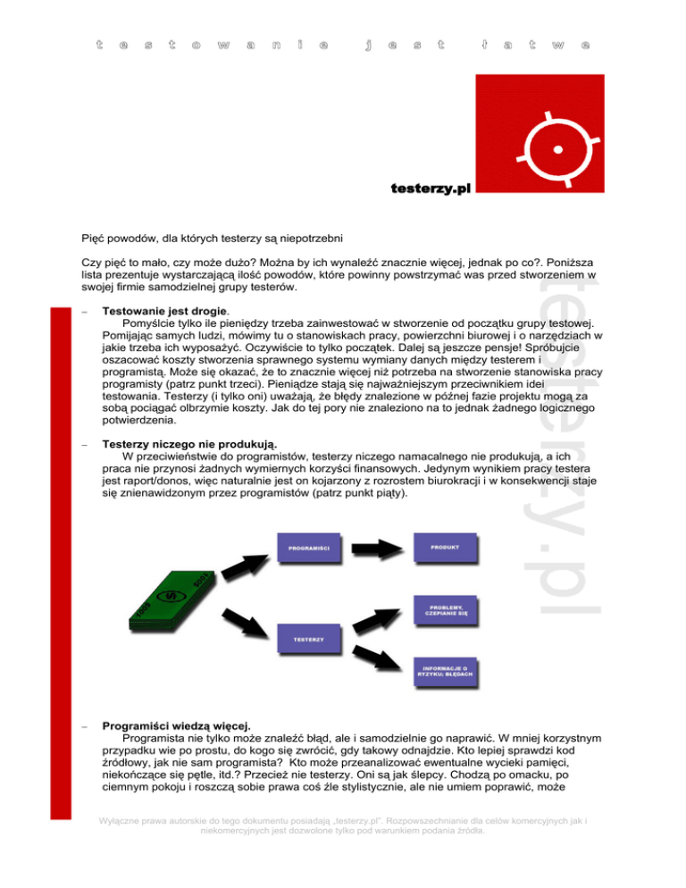 t e s t o w a n i e j e s t ł a t w e testerzy.pl Pięć powodów, dla których testerzy są niepotrzebni Czy pięć to mało, czy może dużo? Można by ich wynaleźć znacznie więcej, jednak po co?. Poniższa lista prezentuje wystarczającą ilość powodów, które powinny powstrzymać was przed stworzeniem w swojej firmie samodzielnej grupy testerów. − Testowanie jest drogie. Pomyślcie tylko ile pieniędzy trzeba zainwestować w stworzenie od początku grupy testowej. Pomijając samych ludzi, mówimy tu o stanowiskach pracy, powierzchni biurowej i o narzędziach w jakie trzeba ich wyposażyć. Oczywiście to tylko początek. Dalej są jeszcze pensje! Spróbujcie oszacować koszty stworzenia sprawnego systemu wymiany danych między testerem i programistą. Może się okazać, że to znacznie więcej niż potrzeba na stworzenie stanowiska pracy programisty (patrz punkt trzeci). Pieniądze stają się najważniejszym przeciwnikiem idei testowania. Testerzy (i tylko oni) uważają, że błędy znalezione w późnej fazie projektu mogą za sobą pociągać olbrzymie koszty. Jak do tej pory nie znaleziono na to jednak żadnego logicznego potwierdzenia. − Testerzy niczego nie produkują. W przeciwieństwie do programistów, testerzy niczego namacalnego nie produkują, a ich praca nie przynosi żadnych wymiernych korzyści finansowych. Jedynym wynikiem pracy testera jest raport/donos, więc naturalnie jest on kojarzony z rozrostem biurokracji i w konsekwencji staje się znienawidzonym przez programistów (patrz punkt piąty). − Programiści wiedzą więcej. Programista nie tylko może znaleźć błąd, ale i samodzielnie go naprawić. W mniej korzystnym przypadku wie po prostu, do kogo się zwrócić, gdy takowy odnajdzie. Kto lepiej sprawdzi kod źródłowy, jak nie sam programista? Kto może przeanalizować ewentualne wycieki pamięci, niekończące się pętle, itd.? Przecież nie testerzy. Oni są jak ślepcy. Chodzą po omacku, po ciemnym pokoju i roszczą sobie prawa coś źle stylistycznie, ale nie umiem poprawić, może Wyłączne prawa autorskie do tego dokumentu posiadają „testerzy.pl”. Rozpowszechnianie dla celów komercyjnych jak i niekomercyjnych jest dozwolone tylko pod warunkiem podania źródła. t e s t o w a n i e j e s t ł a t w e powinno być roszczą sobie prawo by... mówienia wskazówek ludziom, którzy znają to miejsce jak własną kieszeń. − Użytkownik jest testerem. Wynaleziono swego czasu ideę testowania przez użytkownika zwaną alfa i beta testowaniem. Kto lepiej niż użytkownik powie nam, co nie działa z jego punktu widzenia? Taki raport możemy uzyskać minimalnym kosztem. Użytkownicy - testerzy mogą wykonywać testy i w ramach nagrody dostawać za darmo nasz produkt pod koniec projektu. Mogą go mieć przed wszystkimi, co jest dodatkowym motywatorem. Nie zapomnijmy również o ich (pod)świadomości, że czym więcej błędów znajdą, tym lepszy sprzęt/oprogramowanie otrzymają w przyszłości. Kiedy już produkt wejdzie na rynek, dzięki erze Internetu, użytkownik łatwo może podzielić się z producentem uwagami o nim nabytymi. Takie spostrzeżenia to podstawa do stworzenia jeszcze lepszego towaru w przyszłości. Testerzy, choć nie chcą się do tego przyznać, w szybkim czasie wpadają w rutynę, w której zapominają, że to końcowy użytkownik jest najważniejszy, a nie oni sami. Jeśli przeanalizuje się ilość procesów, dokumentacji generowanej przez testerów, łatwo dochodzimy do wniosku, że nie da się w takim środowisku pracować dłużej i nie popaść w schematy prowadzące do omijania najbardziej krytycznych anomalii produktu. − Testerzy się czepiają. Pomyślmy o obciążeniu psychicznym i nienawiści, jaka wytwarza się między testerami i programistami. Nie da się ukryć, że jest to naturalna obrona przed ludźmi, którzy niczego nie wytwarzają. Ich jedynym celem jest wypominanie niedociągnięć (patrz punkt drugi). Trzeba tu zauważyć, że w wielu firmach stosuje się metodę mierzenia jakości testera, jako ilość znalezionych przez niego błędów. Wskaźnik ten przekłada się bezpośrednio na jego pensję. Jakież to ogromne pole do nadużyć! Z drugiej strony mierzy się słabość programisty jako ilość błędów znalezionych w wytworzonym przez niego oprogramowaniu. Stąd już tylko krok do napięć, wrogości i podgrzewania atmosfery w środowisku pracy. Efekt: szybko może spaść efektywność pracy i wzrosnąć opóźnienie w dostarczeniu produktu na rynek. Jeśli ciągle nie jesteś przekonany co do słuszności tej listy,zapytaj jakiegokolwiek testera o opinię. Czy może on rzeczywiście powiedzieć, że zawarte tu prawdy są do podważenia?!. Wątpię. Na koniec jeszcze jedno z podstawowych założeń testerów: Testowanie nigdy się nie kończy! Analizując to z punktu widzenia marketingu mamy tu do czynienia z przypadkiem, że nigdy nie uda się nam niczego wypuścić na rynek, jeśli chcemy żeby było to bezawaryjne. Jeśli spojrzymy na to z punktu widzenia testera, to nie ma nic lepszej pracy jak ta. Zawsze jesteś potrzebny!! Wyłączne prawa autorskie do tego dokumentu posiadają „testerzy.pl”. Rozpowszechnianie dla celów komercyjnych jak i niekomercyjnych jest dozwolone tylko pod warunkiem podania źródła.