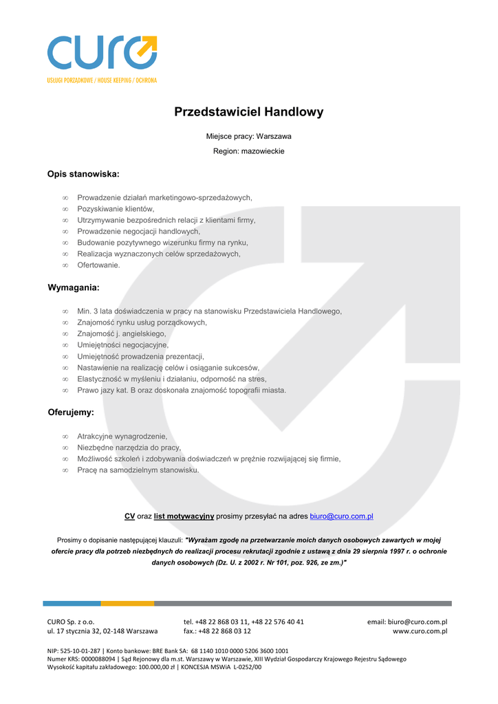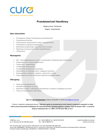 Przedstawiciel Handlowy Miejsce pracy: Warszawa Region: mazowieckie Opis stanowiska: • • • • • • • Prowadzenie działań marketingowo-sprzedażowych, Pozyskiwanie klientów, Utrzymywanie bezpośrednich relacji z klientami firmy, Prowadzenie negocjacji handlowych, Budowanie pozytywnego wizerunku firmy na rynku, Realizacja wyznaczonych celów sprzedażowych, Ofertowanie. Wymagania: • • • • • • • • Min. 3 lata doświadczenia w pracy na stanowisku Przedstawiciela Handlowego, Znajomość rynku usług porządkowych, Znajomość j. angielskiego, Umiejętności negocjacyjne, Umiejętność prowadzenia prezentacji, Nastawienie na realizację celów i osiąganie sukcesów, Elastyczność w myśleniu i działaniu, odporność na stres, Prawo jazy kat. B oraz doskonała znajomość topografii miasta. Oferujemy: • • • • Atrakcyjne wynagrodzenie, Niezbędne narzędzia do pracy, Możliwość szkoleń i zdobywania doświadczeń w prężnie rozwijającej się firmie, Pracę na samodzielnym stanowisku. CV oraz list motywacyjny prosimy przesyłać na adres [email protected] Prosimy o dopisanie następującej klauzuli: "Wyrażam zgodę na przetwarzanie moich danych osobowych zawartych w mojej ofercie pracy dla potrzeb niezbędnych do realizacji procesu rekrutacji zgodnie z ustawą z dnia 29 sierpnia 1997 r. o ochronie danych osobowych (Dz. U. z 2002 r. Nr 101, poz. 926, ze zm.)" CURO Sp. z o.o. ul. 17 stycznia 32, 02-148 Warszawa tel. +48 22 868 03 11, +48 22 576 40 41 fax.: +48 22 868 03 12 email: [email protected] www.curo.com.pl NIP: 525-10-01-287 | Konto bankowe: BRE Bank SA: 68 1140 1010 0000 5206 3600 1001 Numer KRS: 0000088094 | Sąd Rejonowy dla m.st. Warszawy w Warszawie, XIII Wydział Gospodarczy Krajowego Rejestru Sądowego Wysokość kapitału zakładowego: 100.000,00 zł | KONCESJA MSWiA L-0252/00