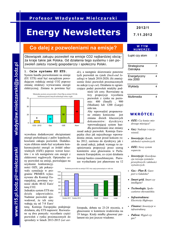 www.I15.pl.lodz.pl/~mielczarski [email protected] Profesor Władysław Mielczarski 2012/1 Energy Newsletters 7.11.2012 Co dalej z pozwoleniami na emisje? W TYM NUMERZE: Obowiązek zakupu pozwoleń na emisje CO2 najbardziej obciąża kraje takie jak Polska. Od działania tego systemu i cen pozwoleń zależy rozwój gospodarczy i społeczny Polski. 1. Cele systemu EU ETS. System handlu pozwoleniami na emisje (EU ETS) miał być narzędziem powodującym redukcję emisji CO2 poprzez zmianę struktury wytwarzania energii elektrycznej. Zmiana ta powinna być de), a następnie skierowanie ponowne tych pozwoleń na rynek (back-end loading) w latach 2018-2020; (b) zmniejszenie ilości pozwoleń przeznaczonych na aukcje (cap cut). Działania te ograniczające podaż pozwoleń miałyby podnieść ich ceny. Rozważane są Minimalny poziom cen pozwoleń w Euro/Mg na emisje CO2 dla trzy propozycje wycofania konkurencyjności innych technologii wobec węgla 75 pozwoleń z rynku na poziomie: 400 (Small) , 900 (Medium) lub 1200 (Large) 50 mln ton. 69 Aby wprowadzić proponowa52 25 ne zmiany konieczna jest 8 zmiana dwóch kluczowych 24 dokumentów: dyrekt ywy 0 wprowadzającej system hanCO2 - 2012 Gaz OZE Atom dlu pozwoleniami oraz zmiany zasad aukcji pozwoleń. Komisja Eurowywołana dodatkowymi obciążeniami pejska chce jak najszybszego wprowaenergii pochodzącej z paliw kopalnych, dzenia zmian, nawet przed końcem rokosztami zakupu pozwoleń. Dodatkoku 2012, zarówno do dyrektywy jak i wym efektem miało być uzyskanie kondo zasad aukcji, jednak wymaga to zakurencyjności energii ze źródeł odnaopiniowania propozycji przez szereg wialnych (OZE) poprzez wzrost koszkomitetów oraz głosowania w Parlatów i w ich następstwie cen energii z mencie Europejskim, co czyni działania elektrowni węglowych. Optymalne cekomisji bardzo czasochłonnymi. Pierwny pozwoleń na emisji, pozwalające na sze wysłuchanie jest planowane na 12 uzyskanie konkurencyjności OZE, jak pokazyNadmiar pozwoleń na emisje CO2 i trzy opcje przesunięcia w mln ton wały symulacje w pro- 1400 gramie PRIMES wyko- 1200 nywane dla Komisji Eu- 1000 ropejskiej, powinny wy800 nosić około 40-42 Euro/ 600 tonę CO2. 400 Jednakże system ETS nie 200 działa odpowiednio. 0 Nadmiar pozwoleń spoSurplus 2011 Surplus 2012 Small Medium Large wodował, że ich ceny wahają się od 7-8 Euro/ tonę. Komisja Europejska podejmuje listopada, debata na 23-24 stycznia, a działania, aby ETS naprawić. Rozważagłosowanie w komitecie środowiska na ne są dwa pomysły: wycofanie części 19 lutego. Kiedy miałby głosować parpozwoleń z rynku przeznaczonych do lament nie jest jeszcze wiadomo. sprzedaży w latach 2013-2015 (set asi- Łupki czy atom 2 Strategiczna Ostrołęka 3 Energetyczny mix 2050 4 Wykłady 4 Multimedia 4 WKRÓTCE: OZE: Czy koniec miodowego miesiąca? Gaz: Nadzieje i rzeczywistość. Inwestycje: Rynek zdolności wytwórczych. OZE: Nowy system wsparcia. Inwestycje: Koordynacja rozwoju systemów przesyłowych i zdolności wytwórczych.. Gaz - Plan B. Gazoport w Gdańsku? Smart grid. Smart czy intelligent? Technologie. Społeczeństwo obywatelskie. Infrastruktura: Electricity Highways. Finanse: Inwestycje w infrastrukturę. Paliwa: Węgiel czy gaz? STR. 2 Energy Newsl etters 2012/1 Pozwolenia na emisje CO2 i ich oddziaływanie www.I15.pl.lodz.pl/~mielczarski [email protected] 2. Kto za, kto przeciw. Kraje jakie poprą prawdopodobnie propozycję to Wielka Brytania, Dania, Francja. Nieznana jest opinia Niemiec, Austrii i Holandii. Polska i Słowacja są otwarcie przeciwni pomysłom Komisji Europejskiej. Liczba głosów krajów członkowskich France, Germany, Italy, the UK Spain, Poland Romania The Netherlands Belgium, Czech Republic, Greece, Hungary, Portugal Austria, Bulgaria, Sweden Dennmark, Ireland, Lithuania, Slovakia, Finland Estonia, Cyprus, Latvia, Luxemburg, Slovakia Malta Razem 29 27 14 13 12 10 7 4 3 345 Poparcie dla zmian w systemie EU ETS zawsze wyrażali zwolennicy energii odnawialnej mając nadzieję, że wysokie ceny energii z paliw kopalnych uczynią energię z OZE konkurencyjną. Ostatnio obserwuje się również poparcie wyrażane przez firmy dostarczające gaz. Znaczne ilości zakontraktowego gazu oraz jego wysokie ceny powodują, że firmy te zaczynają ponosić straty. Ratunkiem może być zwiększenie zużycia gazu przez energetykę. Jednak przy obecnych cenach produkcja energii elektrycznej z gazu nie jest konkurencyjna dla elektrowni węglowych. Dlatego europejskie firmy gazowe są zainteresowane podniesieniem cen pozwoleń na emisje CO2 do poziomu 30-40 Euro/Mg. Zmiany do systemu handlu emisjami będą wprowadzone w oparciu o Traktat Lizboński czyli wg zasady kwalifikowanej większości. Polska nie ma możliwości zablokowania zmian. 3. Ceny pozwoleń i gospodarka W roku 2013 nie należy spodziewać się wzrostu cen pozwoleń. Wkrótce na rynku pojawi się dodatkowo około 250 mln ton pozwoleń z fazy drugiej. Tak duża liczba pozwoleń przy malejącym zapotrzebowaniu na energię na skutek kryzysu ekonomicznego może spowodować nawet dalszy spadek cen. Ograniczenie sprzedaży pozwoleń w latach 2013-2015 i ponowne skierowanie ich na rynek w okresie późniejszym (back loading) tylko w małym stopniu i okresowo może podnieść ceny. Trwała i znaczna pożywka cen może być osiągnięta tylko poprzez znaczne ograniczenie liczby pozwoleń (Deep cap cut), co jest bardzo trudne. Dla Polski podniesienie cen pozwoleń na emisje oznaczałoby znaczne zwiększenie kosztów energii elektrycznej. Przy cenie 40 Euro/Mg koszty zakupu pozwoleń praktycznie równają się wartości całej energii sprzedaCeny pozwoleń w Euro/Mg 36 No action Back loading Deep cap cut 27 18 9 0 2008 2009 2010 2011 2012 2013 2014 2015 2016 2017 2018 2019 2020 wanej do odbiorców końcowych. Tak duże obciążenie gospodarki może skończyć się tylko głęboką recesją. Łupki czy atom? Trzeba się zdecydować. Dyskusja w Sejmie (24.10.12) da