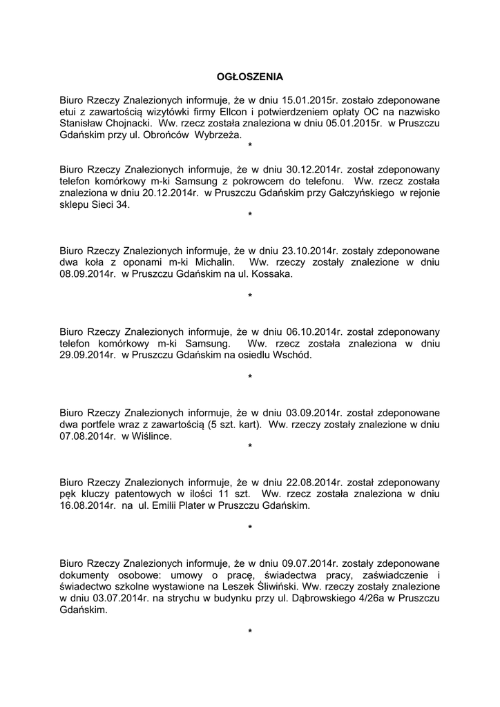 OGŁOSZENIA Biuro Rzeczy Znalezionych informuje, że w dniu 15.01.2015r. zostało zdeponowane etui z zawartością wizytówki firmy Ellcon i potwierdzeniem opłaty OC na nazwisko Stanisław Chojnacki. Ww. rzecz została znaleziona w dniu 05.01.2015r. w Pruszczu Gdańskim przy ul. Obrońców Wybrzeża. * Biuro Rzeczy Znalezionych informuje, że w dniu 30.12.2014r. został zdeponowany telefon komórkowy m-ki Samsung z pokrowcem do telefonu. Ww. rzecz została znaleziona w dniu 20.12.2014r. w Pruszczu Gdańskim przy Gałczyńskiego w rejonie sklepu Sieci 34. * Biuro Rzeczy Znalezionych informuje, że w dniu 23.10.2014r. zostały zdeponowane dwa koła z oponami m-ki Michalin. Ww. rzeczy zostały znalezione w dniu 08.09.2014r. w Pruszczu Gdańskim na ul. Kossaka. * Biuro Rzeczy Znalezionych informuje, że w dniu 06.10.2014r. został zdeponowany telefon komórkowy m-ki Samsung. Ww. rzecz została znaleziona w dniu 29.09.2014r. w Pruszczu Gdańskim na osiedlu Wschód. * Biuro Rzeczy Znalezionych informuje, że w dniu 03.09.2014r. został zdeponowane dwa portfele wraz z zawartością (5 szt. kart). Ww. rzeczy zostały znalezione w dniu 07.08.2014r. w Wiślince. * Biuro Rzeczy Znalezionych informuje, że w dniu 22.08.2014r. został zdeponowany pęk kluczy patentowych w ilości 11 szt. Ww. rzecz została znaleziona w dniu 16.08.2014r. na ul. Emilii Plater w Pruszczu Gdańskim. * Biuro Rzeczy Znalezionych informuje, że w dniu 09.07.2014r. zostały zdeponowane dokumenty osobowe: umowy o pracę, świadectwa pracy, zaświadczenie i świadectwo szkolne wystawione na Leszek Śliwiński. Ww. rzeczy zostały znalezione w dniu 03.07.2014r. na strychu w budynku przy ul. Dąbrowskiego 4/26a w Pruszczu Gdańskim. * Biuro Rzeczy Znalezionych informuje, że w dniu 16.06.2014r. został zdeponowany portfel z zawartością (karta SIM, dwa dowody wpłaty, 3 szt. zdjęć). Ww. rzecz została znaleziona w dniu 09.06.2014r. na placu centrum CKiS po dniach Pruszcza Gd. * Biuro Rzeczy Znalezionych informuje, że w dniu 12.06.2014r. została zdeponowana torba podróżna z zawartością (odzież, 1 para butów, sztućce: nóż, widelec, miska i ładowarka do telefonu) Ww. rzeczy zostały znalezione w dniu 08.06.2014r. na przystanku autobusowym w Pruszczu Gdańskim przy ul. Grunwaldzkiej. * Biuro Rzeczy Znalezionych informuje, że w dniu 12.06.2014r. został zdeponowany plecak z zawartością (radio z panelem, sznurek, rękawiczki, 5 szt. kluczyków do pojazdów oraz pilot) Ww. rzeczy zostały znalezione w dniu 19.02.2014r. w Pruszczu Gdańskim przy ul. Rogozińskiego. * Biuro Rzeczy Znalezionych informuje, że w dniu 12.06.2014r. został zdeponowany rower dziecięcy firmy HURRIACANE. Ww. rzecz została znaleziona w dniu 04.06.2014r. w Straszynie przy ul. Spokojnej. * Biuro Rzeczy Znalezionych informuje, że w dniu 04.06.2014r. został zdeponowany rower. Ww. rzecz została znaleziona w dniu 31.05.2014r. w Pruszczu Gdańskim przy ul. Wita Stwosza. * Biuro Rzeczy Znalezionych informuje, że w dniu 14.04.2014r. został zdeponowany portfel (bez zawartości) Ww. rzecz została znaleziona w dniu 27.03.2014r. w rejonie przystanku autobusowego koło Biedronki w Straszynie . * Biuro Rzeczy Znalezionych informuje, że w dniu 14.03.2014r. został zdeponowany rower typu „Góral”. Ww. rzecz została znaleziona w dniu 09.03.2014r. na deptaku wzdłuż rzeki Raduni w Pruszczu Gdańskim. * Biuro Rzeczy Znalezionych informuje, że w dniu 25.02.2014r. został zdeponowany portfel z zawartością: karty bankomatowej Millennium Bank i karty miejskiej, karty wystawione na nazwisko Grzegorz Bęcławski. Ww. rzecz została znaleziona w dniu 07.02.2014r. w Pruszcz Gdańskim na ul. Chopina. * Biuro Rzeczy Znalezionych informuje, że w dniu 08.01.2014r. została zdeponowana sieć rybacka. Ww. rzecz została znaleziona w dniu 22.12.2013r. w miejscowości Dziewięć Włók. * Biuro Rzeczy Znalezionych informuje, że w dniu 19.12.2013r. została zdeponowana torba wraz z kamerą Sanyo oraz osprzętem. Ww. rzeczy zostały znalezione w dniu 10.12.2013r. przy ul. Jagodowej w Rotmance. * Biuro Rzeczy Znalezionych informuje, że w dniu 25.11.2013r. został zdeponowany rower męski. Ww. rzecz została znaleziona w dniu 24.11.2013r. w Pruszczu Gdańskim, przy ul. Kossaka. * Biuro Rzeczy Znalezionych informuje, że w dniu 16.10.2013r. zostały zdeponowane marynarka i telefon komórkowy. Ww. rzeczy zostały znalezione w dniu 08.10.2013r. w Pruszczu Gdańskim przy ul. Komara. * Biuro Rzeczy Znalezionych informuje, że w dniu 04.10.2013r. został zdeponowany telefon komórkowy wraz ze słownikiem. Ww. rzeczy zostały znalezione w dniu 09.07.2013r. w Pruszczu Gdańskim, przy ul. Wojska Polskiego. * Biuro Rzeczy Znalezionych informuje, że w dniu 06.09.2013r. został zdeponowany telefon komórkowy. Ww. rzecz została znaleziona w dniu 01.09.2013r. w Pruszczu Gdańskim. * Biuro Rzeczy Znalezionych informuje, że w dniu 16.07.2013r. została zdeponowana torebka z zawartością. Ww. rzecz została znaleziona w dniu 09.07.2013r. w Pruszczu Gdańskim, przy ul. Wojska Polskiego. * Biuro Rzeczy Znalezionych informuje, że w dniu 08.05.2013r. został zdeponowany telefon komórkowy. Ww. rzecz została znaleziona w dniu 03.05.2013r. w Pruszczu Gdańskim, w Parku Miejskim przy ul. Mickiewicza. . * Biuro Rzeczy Znalezionych informuje, że w dniu 06.02.2013r. został zdeponowany telefon komórkowy. Ww. rzecz została znaleziona w dniu 03.02.2013r. w Pruszczu Gdańskim, przy Kanale Raduni. * Biuro Rzeczy Znalezionych informuje, że w dniu 23.01.2013r. został zdeponowany pęk kluczy wraz z kartą CLUBCARD Tesco. Ww. rzecz została znaleziona w dniu 21.01.2013r. w Pruszczu Gdańskim, przy ul. Dywizjonu 303. * Biuro Rzeczy Znalezionych informuje, że w dniu 23.01.2013r. został zdeponowany portfel. Ww. rzecz została znaleziona w dniu 27.12.2012r. w Pruszczu Gdańskim, w skrzynce Agencji Pocztowej przy ul. Podkomorzego. * Biuro Rzeczy Znalezionych informuje, że w dniu 03.12.20