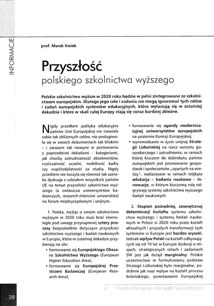 I N FO RMACJ E prof. Marek Kwiek Przyszłość polskiego szkolnictwa wyższego Polskie szkolnictwo wyższe w 2020 roku będzie w peł ni zintegrowane ze szkolnictwem europejskim. Dlatego jego cele i zadania nie mogą ignorować tych celów i zadań europejskich systemów edukacyjnych, które wyłaniają się w ostatniej dekadzie i które w skali cał ej Europy stają się coraz bardziej zbieżne. igdy przedtem polityka edukacyjna państw Unii Europejskiej nie stawiała sobie tak zbliżonych celów, nie posługiwała się w swoich dokumentach tak bliskimi — i zarazem tak nowymi w porównaniu z poprzednimi dekadami — kategoriami, jak choćby zatrudnialność absolwentów, rozliczalność uczelni, mobilność kadry czy współodpłatność za studia. Nigdy przedtem nie toczyła się również tak szeroka dyskusja z udziałem wszystkich państw UE na temat przyszłości szkolnictwa wyższego (a zwłaszcza uniwersytetów badawczych, research-intensive universities) na forum międzyrządowym i unijnym. N 1. Polska, myśląc o swoim szkolnictwie wyższym w 2020 roku musi brać równolegle pod uwagę przynajmniej cztery procesy bezpośrednio dotyczące przyszłości szkolnictwa wyższego i badań naukowych w Europie, które w ostatniej dekadzie przybierają na sile: • formowanie się Europejskiego Obszaru Szkolnictwa Wyższego (European Higher Education Area); • formowanie się Europejskiej Przestrzeni Badawczej (European Research Area); • formowanie się agendy modernizacyjnej uniwersytetów europejskich na poziomie Komisji Europejskiej; • wprowadzanie w życie unijnej Strategii Lizbońskiej na rzecz wzrostu gospodarczego i zatrudnienia, w ramach której kluczem do dobrobytu pa ństw europejskich jest promowanie gospodarek i społeczeństw „opartych na wiedzy", realizowane w ramach trójkąta edukacja — badania naukowe — innowacje, w którym kluczową rolę odgrywają systemy szkolnictwa wyższego badań naukowych. 2. Stopień pośredniej, zewnętrznej determinacji kształtu systemu szkolnictwa wyższego i systemu badań naukowych w Polsce w 2020 roku przez kształt aktualnych i przyszłych transformacji tych systemów w Europie jest bardzo wysoki. Jednak wpływ Polski na kształt odbywających się od 10 lat w Europie dyskusji o misjach, strategicznych celach i zadaniach SW jest jak dotąd marginalny. Polskie uczestnictwo w formułowaniu podstaw Strategii Lizbońskiej było marginalne, podobnie jak nasz wpływ na kształt procesu bolońskiego, powstawanie Europejskiej Przestrzeni Badawczej i jej finansowanie w programach ramowych UE oraz na kolejne elementy agendy modernizacyjnej uniwersytetów europejskich proponowane w ostatnich latach przez Komisję Europejską. Natomiast oddziaływanie powyższych procesów zewnętrznych na kształt polskiego szkolnictwa wyższego jest fundamentalne i nieodwracalne. Pewne procesy ogólnoeuropejskich transformacji można, jak czyni to część krajów UE, do pewnego momentu opóźniać i ignorować, ale całości zmian o potężnej, trwałej dynamice wspieranej przez politykę unijną i politykę największych gospodarek zachodnich zatrzymać się nie da. Polska stoi w obliczu szerszego wyboru potwierdzającego wykuwający się, tradycyjnie zróżnicowany, ale jednak coraz bardziej zbieżny, zachodnioeuropejski model rozwoju szkolnictwa wyższego, ze wszelkimi tego konsekwencjami. Jest to model funkcjonowania oparty coraz silniej i coraz powszechniej na logice ekonomicznej, konkurencyjnej i rynkowej, wynikającej z gospodarczej i społecznej Strategii Lizbońskiej, do której polskie szkolnictwo wyższe jest nieprzygotowane. 3. Mechanizmy wprowadzania w życie idei powstających w czterech wymienionych procesach europejskich to mechanizmy „miękkiej" (soft) koordynacji międzynarodowych działań strategicznych, która opiera się na międzynarodowych porównaniach i zestawieniach, wyznaczaniu wskaźników, benchmarków, dobrych i najlepszych praktyk. Przy dzisiejszym poziomie wykorzystania szczegółowych krajowych danych statystycznych do sektorowych porównań międzynarodowych (zarówno przez Eurostat, jak i przez OECD), miękkie metody koordynacji zmian zachodzących w szkolnictwie wyższym w skali Europy posiadają olbrzymią siłę oddziaływania. Po raz pierwszy w historii zarówno szczegółowe dane, jak i ich międzynarodowe analizy porównawcze, stały się powszechnie dostępne: polskie systemy szkolnictwa wyższego i badań naukowych poddawane są permanentnym zestawieniom we wszystkich możliwych aspektach, a wyspecjalizowane agendy statystyczne i analityczne KE i OECD poddają je regularnym, szczegółowym porównaniom. Jednocześnie wspomniane tu procesy, jak pokazują najnowsze badania studentów i kadry akademickiej przeprowadzone w UE-27, mają potężne wsparcie społeczne, co daje dodatkową legitymizację koordynowanym przez KE działaniom reformatorskim w skali całej UE. 4. Przechodząc do diagnozy stanu szkolnictwa wyższego w Polsce: funkcjonalnie nie przystaje ono do nowych wymagań społeczeństwa i gospodarki. Jednak pomimo swojej dysfunkcjonalności działa z poczuciem pełnej stabilizacji (w zmieniającym się od 20 lat, coraz bardziej konkurencyjnym i rynkowym otoczeniu społecznym i gospodarczym). Jest jednym z ostatnich sektorów gospodarki, do którego nie dotarła mobilizująca strona mechanizmów konkurencyjnych i rynkowych. Olbrzymia część kadry akademickiej, pomimo oficjalnych narzeka ń, doskonale się w obecnym systemie odnajduje uważając za ważne podtrzymywanie status quo, które pozwala na lokalne, niekonkurencyjne i nierynkowe funkcjonowanie w coraz bardziej konkurencyjnym i rynkowym otoczeniu krajowym, europejskim i światowym w nauce. 5. Elitarna część szkolnictwa wyższego w Polsce staje się coraz bardziej skoncentrowana na kształceniu (teaching-orien- I NFORMACJ E sprawy IN FORMACJ E ted), podczas gdy elitarna część szkolnictwa wyższego w najlepszych systemach Europy Zachodni
