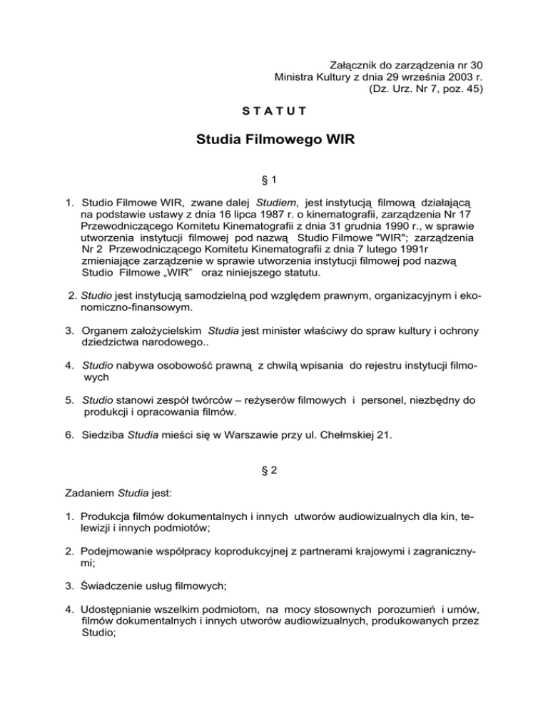 Załącznik do zarządzenia nr 30 Ministra Kultury z dnia 29 września 2003 r. (Dz. Urz. Nr 7, poz. 45) STATUT Studia Filmowego WIR §1 1. Studio Filmowe WIR, zwane dalej Studiem, jest instytucją filmową działającą na podstawie ustawy z dnia 16 lipca 1987 r. o kinematografii, zarządzenia Nr 17 Przewodniczącego Komitetu Kinematografii z dnia 31 grudnia 1990 r., w sprawie utworzenia instytucji filmowej pod nazwą Studio Filmowe "WIR"; zarządzenia Nr 2 Przewodniczącego Komitetu Kinematografii z dnia 7 lutego 1991r zmieniające zarządzenie w sprawie utworzenia instytucji filmowej pod nazwą Studio Filmowe „WIR” oraz niniejszego statutu. 2. Studio jest instytucją samodzielną pod względem prawnym, organizacyjnym i ekonomiczno-finansowym. 3. Organem założycielskim Studia jest minister właściwy do spraw kultury i ochrony dziedzictwa narodowego.. 4. Studio nabywa osobowość prawną z chwilą wpisania do rejestru instytucji filmowych 5. Studio stanowi zespół twórców – reżyserów filmowych i personel, niezbędny do produkcji i opracowania filmów. 6. Siedziba Studia mieści się w Warszawie przy ul. Chełmskiej 21. §2 Zadaniem Studia jest: 1. Produkcja filmów dokumentalnych i innych utworów audiowizualnych dla kin, telewizji i innych podmiotów; 2. Podejmowanie współpracy koprodukcyjnej z partnerami krajowymi i zagranicznymi; 3. Świadczenie usług filmowych; 4. Udostępnianie wszelkim podmiotom, na mocy stosownych porozumień i umów, filmów dokumentalnych i innych utworów audiowizualnych, produkowanych przez Studio; -25. Działalność gospodarcza służąca pozyskiwaniu środków z przeznaczeniem na działalność statutową Studia. §3 Studio jest producentem realizowanych filmów dokumentalnych i innych utworów audiowizualnych oraz podmiotem praw autorskich w myśl ustawy o prawie autorskim i prawach pokrewnych. §4 Organami Studia są: 1. dyrektor; 2. ogólne zebrania pracowników; 3. rada pracownicza. §5 1. W Studiu mogą być powołane zespoły filmowe na zasadach określonych ustawą z dnia 16 lipca 1987 r. o kinematografii (Dz. U. nr 22 poz. 127) 2. W przypadku nie powołania zespołu filmowego w instytucji, funkcję kierownika artystycznego zespołu pełni dyrektor instytucji, zaś zastępca dyrektora funkcję zastępcy kierownika artystycznego. §6 W skład Studia wchodzą: 1. Kierownictwo Studia, które tworzą: dyrektor pełniący jednocześnie funkcję kierownika artystycznego, zastępca dyrektora, szef produkcji, główny księgowy; a. dyrektor pełniący jednocześnie funkcję kierownika artystycznego zarządza Studiem i reprezentuje je; podejmuje decyzje samodzielnie i ponosi za nie odpowiedzialność; b. dyrektora Studia powołuje i odwołuje minister właściwy do spraw kultury i ochrony dziedzictwa narodowego, zgodnie z z art.24 ustawy z dnia 16 lipca 1987 roku o kinematografii; -3c. zastępca dyrektora, szef produkcji i główny księgowy – podlegają dyrektorowi i działają w granicach ich umocowania; d. zastępca dyrektora, szef produkcji i główny księgowy powoływani są i odwoływani przez dyrektora Studia za zgodą rady pracowniczej. 2. Reżyserzy : a. reżyserzy są grupą twórców filmowych, posiadają uprawnienia do wykonywania zawodu reżysera filmowego; podlegają bezpośrednio zwierzchnictwu dyrektora Studia, zastępcy dyrektora i szefa produkcji. 3. Inni pracownicy Studia: a. pracownicy sekretariatu spełniającego zadania działu organizacyjnego i działu kadr; podlegają bezpośrednio kierownictwu Studia; b. pracownicy działu finansowo-księgowego; podlegają kierownictwu Studia, zaś bezpośrednio nadzorowi głównego księgowego. §7 Zakres działania oraz podział uprawnień i obowiązków kierownictwa Studia Filmowego „WIR”, a także zatrudnionych w nim twórców filmowych i pracowników Studia określa regulamin wewnętrzny, ustalony w trybie art.35 ustawy o kinematografii z dnia 16 lipca 1987 roku. §8 W Studiu działa rada artystyczno-programowa, której zakres działania określa art.35 ustawy o kinematografii z dnia 16 lipca 1987 r.. §9 Studio realizując statutowe zadania samodzielnie podejmuje decyzje we wszystkich fazach produkcji filmów dokumentalnych i innych utworów audiowizualnych; w szczególności: 1. Kupuje i zatwierdza scenariusze filmowe i teksty literackie, niezbędne do prowadzenia działalności; 2. Kieruje scenariusze do produkcji; 3. Podejmuje decyzje o źródłach finansowania filmów i innych utworów audiowizualnych; -44. Zatwierdza szczegółowe plany filmów; 5. Powołuje i rozwiązuje produkcyjne grupy filmowe; 6. Nadzoruje pod względem artystycznym, organizacyjnym, ekonomicznym przebieg realizacji filmów, aż do ostatecznego ich kształtu; 7. Inicjuje debiuty; 8. Decyduje o udostępnianiu filmów wszelkim podmiotom w kraju i za granicą; 9. Podejmuje inne decyzje dotyczące działalności gospodarczej Studia. § 10 1. Plan działalności Studia ustala dyrektor - kierownik artystyczny po zasięgnięciu opinii organów doradczych i opiniodawczych. 2. Plan podlega zatwierdzeniu przez ministra właściwego do spraw kultury i ochrony dziedzictwa narodowego. § 11 Produkcja Studia jest finansowana: 1. Z zysków z produkcji filmów dokumentalnych i innych utworów audiowizualnych; 2. Z zysków za usługi filmowe; 3. Ze środków finansowych uzyskiwanych z innej działalności gospodarczej Studia; 4. Z innych dostępnych źródeł finansowania. § 12 1. Szczegółowy system finansowania Studia regulują odpowiednie przepisy. 2. Gospodarkę finansową Studia prowadzi główny księgowy Studia. § 13 Zasady współpracy Studia z innymi podmiotami w zakresie produkcji filmów dokumentalnych i innej produkcji audiowizualnej, także innej działalności Studia określają umowy cywilno-prawne. -5§ 14 Studio ma prawo zawierać spółki z partnerami krajowymi i zagranicznymi z zastrzeżeniem art. 27 ust.1 ustawy o kinematografii z dnia 16 lipca 1987 roku. § 15 Statut wchodzi w życie z dni