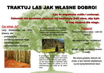 TRAKTUJ LAS JAK WŁASNE DOBRO! Las to wspólnota roślin i zwierząt. Człowiek nie powinien niszczyć tej wspólnoty jeśli chce, aby było w niej miejsce dla niego. Czy wiesz, że? Lasy dostarczają nie tylko drewna, ale: produkują tlen, pochłaniają dwutlenek węgla, zmniejszają hałas, zatrzymują pyły z otoczenia. Las chroni środowisko życia człowieka, ale sam ulega uszkodzeniom i zamiera. Trwałości lasu zagrażają liczne szkodliwe owady, grzyby, wirusy i bakterie.. Pamiętaj! Chcesz korzystać z ciszy – sam nie hałasuj! Nie zaśmiecaj lasu i śródleśnych wód! Nie łam gałęzi, nie niszcz krzewów i roślin! W poszukiwaniu spokoju, piękna i harmonii, uciekając od gwaru zatłoczonych miast chętnie udajemy się do lasu. Zbieramy grzyby, jagody… Las jest naszym wspólnym bogactwem. Żebyś mógł jednak wrócić jutro, pojutrze, za rok do niezniszczonego lasu, traktuj go jak własne dobro. Nie niszcz grzybów, których nie znasz, w tym również niejadalnych, są one sprzymierzeńcem lasu! Harmonogram Działań Ekologicznych TYDZIEŃ EKOLOGICZNY klasy 1-3 21.04. – spotkanie z leśniczym i wiosenny spacer po lesie dla klas pierwszych 22.04. – akcja „Sprzątanie świata” dla chętnych uczniów – konkurs na najpiękniejszy klasowy kwiatek doniczkowy Bądź 23.04. – wyjście na hałdę „Skalny” dla klas trzecich 24.04. – apel ekologiczny pod hasłem „Bądź przyjacielem lasu” – podsumowanie konkursów ekologicznych 29.04 – spotkanie na temat „Las domem zwierząt i roślin” z panią Jadwigą Długajczyk – przedstawicielem Nadleśnictwa Kobiór dla klas drugich przyjacielem lasu!