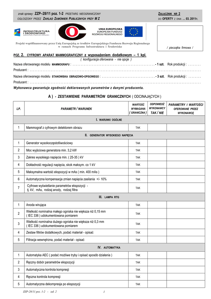 znak sprawy: ZZP–28/11 poz. 1-2 OGŁOSZONY PRZEZ ZAŁĄCZNIK NR 2 PRZETARG NIEOGRANICZONY ZAKŁAD ZAMÓWIEŃ PUBLICZNYCH PRZY M Z DO OFERTY Projekt współfinansowany przez Unię Europejską ze środków Europejskiego Funduszu Rozwoju Regionalnego w ramach Programu Infrastruktura i Środowisko Z DNIA … 03. 2011R. / pieczątka firmowa / POZ. 2. CYFROWY APARAT MAMMOGRAFICZNY z wyposaŜeniem dodatkowym – 1 kpl. ( konfiguracja oferowana - nie opcje ) Nazwa oferowanego modelu MAMMOGRAFU : . . . . . . . . . . . . . . . . . . . . . . . . . . . . . . . . . . . . . . . . . . . . . . . . . . . - 1 szt. Rok produkcji : . . . . . . . . Producent : . . . . . . . . . . . . . . . . . . . . . . . . . . . . . . . . . . . . . . . . . . . . . . . . . . . . . . . . . . . . . . . . . . . . . . . . . . . . . . . . . . . . . . . . . . . . . . . . . . . . . . . . . . Nazwa oferowanego modelu STANOWISKA OBRAZOWO-OPISOWEGO : . . . . . . . . . . . . . . . . . . . . . . . . . . . . . . . . . - 3 szt. Rok produkcji : . . . . . . . . Producent : . . . . . . . . . . . . . . . . . . . . . . . . . . . . . . . . . . . . . . . . . . . . . . . . . . . . . . . . . . . . . . . . . . . . . . . . . . . . . . . . . . . . . . . . . . . . . . . . . . . . . . . . . . Wykonawca gwarantuje zgodność deklarowanych parametrów z danymi producenta. A ) - ZESTAWIENIE PARAMETRÓW GRANICZNYCH ( ODCINAJĄCYCH ) LP. ODPOWIEDŹ WARTOŚĆ WYMAGANA WYKONAWCY ( GRANICZNA ) TAK / NIE PARAMETR / WARUNEK I. WARUNKI OGÓLNE 1 Mammograf z cyfrowym detektorem obrazu TAK II. GENERATOR WYSOKIEGO NAPIĘCIA 1 Generator wysokoczęstotliwościowy TAK 2 Moc wyjściowa generatora min. 3,2 kW TAK 3 Zakres wysokiego napięcia min. ( 25-35 ) kV TAK 4 Dokładność regulacji napięcia, skok maksym. co 1 kV TAK 5 Maksymalna wartość ekspozycji w mAs ( min. 400 mAs ) TAK 6 Automatyczna kompensacja zmian napięcia zasilania +/- 10% TAK 7 Cyfrowe wyświetlanie parametrów ekspozycji tj. kV, mAs, rodzaj anody, rodzaj filtra TAK III. LAMPA RTG 1 Anoda wirująca TAK 2 Wielkość nominalna małego ogniska nie większa niŜ 0,15 mm ( IEC 336 ) udokumentowana pomiarem TAK 3 Wielkość nominalna duŜego ogniska nie większa niŜ 0,3 mm ( IEC 336 ) udokumentowana pomiarem TAK 4 Zestaw filtrów dodatkowych, podać materiał - opisać TAK 5 Filtracja wewnętrzna, podać materiał - opisać TAK IV. AUTOMATYKA 1 Automatyka AEC ( podać moŜliwe tryby i opisać sposób działania ) TAK 2 Ręczny dobór parametrów ekspozycji TAK 3 Automatyczna kontrola kompresji TAK 4 Ręczna kontrola kompresji TAK 5 Automatyczna dekompresja po ekspozycji TAK ZZP-28/11 poz. 1-2 - zał. 2 1 PARAMETRY I WARTOŚCI OFEROWANE PRZEZ WYKONAWCĘ LP. ODPOWIEDŹ WARTOŚĆ WYMAGANA WYKONAWCY ( GRANICZNA ) TAK / NIE PARAMETR / WARUNEK 6 Automatyczny dobór anody/filtracji TAK 7 Ręczny dobór anody/filtracji TAK 8 Automatyczny wybór głównego regionu detektora systemu AEC TAK 9 MoŜliwość wyboru stałego głównego regionu detektora systemu AEC TAK MoŜliwość ekspozycji w trybie bez przetwarzania obrazu TAK 10 V. STATYW APARATU 1 Statyw wolnostojący TAK 2 Głowica o izocentrycznym ruchu obrotowym TAK 3 Zakres ruchu głowicy w pionie min. (65 - 135) cm TAK 4 Motorowy obrót głowicy TAK 5 Zakres obrotu głowicy min.( od +180° do -100o ) lub min.( od -180o do +100 o ) TAK 6 Odległość ognisko - detektor obrazu min. 65 cm TAK 7 Zestaw do zdjęć powiększonych o współczynniku powiększenia min. 1,5 TAK 8 Sterowanie ruchem płytki uciskowej góra/dół oraz ruchu głowicy góra/dół za pomocą przycisków ręcznych i noŜnych ( dwa zestawy przycisków noŜnych ) TAK 9 Osłona twarzy pacjentki TAK 10 Komplet płytek uciskowych z autodetekcją ( aparat automatycznie rozpoznaje wielkość zainstalowanej płytki uciskowej i dostosowuje kolimację) TAK 11 Komplet płytek uciskowych dla wszystkich formatów ekspozycji (łącznie z powiększeniem) oraz ucisk punktowy i płytka lokalizacyjna TAK 12 Wyświetlanie grubości piersi po kompresji TAK 13 Wyświetlanie siły kompresji TAK 14 Szyba ochronna dla operatora, ekwiwalent min. 0,5 mm Pb TAK VI. DETEKTOR CYFROWY 1 Detektor cyfrowy o wymiarach : min. 23 x 29 cm ( podać materiał detektora i opisać metodę rejestracji obrazu ) TAK 2 Dwa formaty obrazu ( minimum 23 x 29 cm oraz 18 x 23 cm ) TAK 6 Matryca detektora promieniowania X min. ( 2300 x 2900 ) pikseli TAK 7 Zakres dynamiki min. 12 bit TAK 8 Rozmiar piksela maksimum 100 µm TAK 9 Czas pomiędzy diagnostycznymi ekspozycjami maksimum 35 s TAK VII. KONSOLA TECHNIKA = STACJA AKWIZYCYJNA 1 System operacyjny TAK 2 Pamięć operacyjna min. 0,8 GB RAM TAK 3 Ilość zapamiętanych obrazów bez kompresji min. 2200 obrazów TAK 4 Nagrywarka umoŜliwiająca zapis obrazów na CD i/lub DVD w formacie DICOM TAK 5 Monitor obsługowy dla technika LCD min. 3 MP, 21'' TAK 6 Komputer, klawiatura obsługowa, mysz, pulpit ekspozycji TAK ZZP-28/11 poz. 1-2 - zał. 2 2 PARAMETRY I WARTOŚCI OFEROWANE PRZEZ WYKONAWCĘ LP. ODPOWIEDŹ WARTOŚĆ WYMAGANA WYKONAWCY ( GRANICZNA ) TAK / NIE PARAMETR / WARUNEK 7 Wyświetlanie zdjęcia podglądowego kaŜdorazowo po wykonaniu projekcji mammograficznej z moŜliwością odrzucenia TAK 8 Nanoszenie znaczników mammograficznych w postaci graficznej i literowej bezpośrednio z klawiatury obsługowej TAK 9 Interfejs sieciowy z funkcjonalnością : - DICOM Send, - DICOM Storage Commitment, - DICOM Basic Print, - DICOM Store, - DICOM Modality Worklist. TAK 10 MoŜliwość zaznaczenia obszaru zainteresowania ( ROI ) TAK 11 MoŜliwość wyznaczenia średniej wartości pixela i standardowego odchylenia w danym ROI TAK 12 MoŜliwość pomiaru długości odcinka TAK 13 System obsługujący analizę zdjęć odrzuconych TAK VIII. STANOWISKO OBRAZOWO-OPISOWE DLA RADIOLOGA - 3 SZT. 1 Stanowisko obrazowo-opisowe – szt. 3 ( poniŜsze wyposaŜenie dot. kaŜdego stanowiska ) TAK 2 System operacyjny ( podać typ i środowisko ) TAK 3 Pamięć operacyjna min. 2 GB RAM TAK 4 Dysk twardy (HD) - m