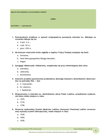 Egzamin dla kandydatów na przewodników miejskich Lublin 26.10.2012 r. — część pisemna 1. Potwierdzone źródłowo w spisach świętopietrza powstanie kościoła św. Mikołaja na czwartku datuje się na: a. II poł. X w., b. I poł. XV w., c. pocz. XVII w. 2. Na konnym wizerunku króla Jagiełły w kaplicy Trójcy Świętej znajduje się herb: a. Śreniawa, b. Herb Rzeczypospolitej Obojga Narodów, c. Pogoń. 3. Synagogi: Maharszala i Maharama, znajdowały się przy nieistniejącej dziś ulicy: a. Szerokiej, b. Jatecznej, c. Krawieckiej. 4. Autorem projektu gruntownej przebudowy dawnego klasztoru dominikanów obserwantów na potrzeby KUL — był: a. S. Czaczyński, b. M. Lalewicz, c. I. Kędzierski. 5. Eksponowany w kościele oo. dominikanów obraz Pożar Lublina, przedstawia wydarzenie które miało miejsce w roku: a. 1575, b. 1719, c. 1740. 6. Otwarcie żydowskiej Uczelni Mędrców Lublina (Jeszywas Chachmej Lublin) nowoczesnej wyższej uczelni talmudycznej, miało miejsce w roku: a. 1918, b. 1929, c. 1930. Oddział Międzyuczelniany PTTK w Warszawie http://szkolenia.om.pttk.pl Opracowano na podstawie materiałów udostępnionych przez urzędy wojewódzkie 1 26.10.2012 Egzamin dla kandydatów na przewodników miejskich — Lublin 7. Projektantem pomnika Marii i Piotra Curie znajdującym się przy szpitalu klinicznym jest: a. A. Ślesińska, b. M. Konieczny, c. W. Tołkin. 8. Licząca 260 kart tabulatura organowa autorstwa Jana z Lublina powstała: a. w I poł. XVI w., b. II pol. XVI w., c. I poł. XVII w. 9. Sceny pokazujące wątki z życia Jana Kochanowskiego, wykonane w technice sgraffito na elewacji jednej z kamienic przy rynku staromiejskim — powstały: a. w roku 1936, b. w roku 1938, c. w roku 1954. 10. Przewodnikiem turystycznym może być osoba, która posiada uprawnienia określone: a. rozporządzeniem wojewody, b. ustawą, c. zarządzeniem marszałka województwa. 11. Jerzy Jarnuszkiewicz, Kazimierz Gustaw Żemła, Bolesław Syrewicz — są autorami: a. pomników i rzeźb lubelskich, b. publikacji o średniowiecznym Lublinie, c. projektów architektonicznych kilku budynków na terenie Lublina. 12. Materiał pozyskany z rozbiórki cerkwi prawosławnej na Placu Litewskim w Lublinie wykorzystano przy budowie: a. Domu Żołnierza, b. Lubelskiej Izby Skarbowej, c. Biblioteki Łopacińskiego. 13. Uprawnienia przewodnika turystycznego nadaje, odmawia nadania, zawiesza i przywraca bądź cofa: a. marszałek województwa, b. komisja egzaminacyjna, c. wojewoda. 14. Projektantem neogotyckiej szaty architektonicznej mostu na Bystrzycy w Lublinie był: a. M. Lutosławski, b. J. Heurich Młodszy, c. J. Pius Dziekoński. 2 http://szkolenia.om.pttk.pl Oddział Międzyuczelniany PTTK w Warszawie Opracowano na podstawie materiałów udostępnionych przez urzędy wojewódzkie Egzamin dla kandydatów na przewodników miejskich — Lublin 26.10.2012 15. Uprawnienia przewodnika turystycznego otrzymuje osoba, która ukończyła: a. 18 lat, b. 20 lat, c. 21 lat. 16. Zawieszenie uprawnień przewodnika turystycznego, może nastąpić na okres: a. 12 miesięcy, b. 18 miesięcy, c. 24 miesięcy. 17. Pierwsza spółdzielnia mieszkaniowa w Lublinie powstała: a. w okresie międzywojennym na terenie obecnej dzielnicy „Dziesiąta”, b. po II wojnie światowej na terenie zajmowanym przez osiedle im. J. Słowackiego, c. po II wojnie światowej na terenie zajmowanym przez osiedle im. A. Mickiewicza. 18. „Kamień nieszczęścia” ulokowany obecnie u zbiegu ulic: Gretz–Gruella i Jezuickiej, służący za podstawę pod pień, na którym ścinano głowy przestępcom, znajdował się pierwotnie — wg legendy — na: a. rynku przed gotyckim ratuszem, b. Placu Bernardyńskim, c. Placu Litewskim. 19. Najstarszym zachowanym budynkiem pełniącym funkcję mieszkalną na Starym Mieście w Lublinie — jest: a. kamienica mieszczańska przy Rynku 18, b. tzw. Dom Wikariuszy/Mansjonarzy przy ul. Archidiakońskiej 9, c. tzw. kamienica „Pod Lwami” przy Rynku 9/Złotej 1. 20. Dawny pałac Suchorabskich z I poł. XVII w. pełni obecnie funkcję: a. Metropolitalnego Seminarium Duchownego, b. klasztoru oo. karmelitów przy ul. Świętoduskiej, c. Wojewódzkiego Ośrodka Kultury. 21. Do zadań przewodnika turystycznego, zgodnie z obowiązującymi przepisami prawa należy: a. oprowadzanie wycieczek oraz fachowe udzielanie informacji o kraju, odwiedzanych miejscowościach, obszarach i obiektach, b. oprowadzanie wycieczek, c. realizacja programu wycieczki. 22. Manierystyczne cechy posiada: a. kamieniarski wystrój fasady kamienicy przy Rynku 12, b. portal w parterze kamienicy przy Rynku 6, c. wystrój architektoniczny kaplicy Trójcy Świętej. Oddział Międzyuczelniany PTTK w Warszawie http://szkolenia.om.pttk.pl.pl Opracowano na podstawie materiałów udostępnionych przez urzędy wojewódzkie 3 26.10.2012 Egzamin dla kandydatów na przewodników miejskich — Lublin 23. Lubelscy muratorzy włoskiego pochodzenia Rudolf Negroni i Jakub Balin, brali udział przy przebudowie: a. kościoła klasztornego oo. bernardynów, b. kościoła św. Mikołaja na Czwartku, c. kamienicy przy ul. Grodzkiej 12. 24. Rzeźby z tzw. „warsztatu puławskiego” Sebastiana Zeisla działającego przy dworze księżnej Izabelli Czartoryskiej znajdują się: a. w dawnym kościele klasztornym oo. bernardynów, b. kościele pobrygidkowskim, c. w kościele klasztornym oo. kapucynów. 25. Pierwszą siedzibą Muzeum Lubelskiego powstałego w 1906 roku były pomieszczenia znajdujące się w: a. Bramie Krakowskiej, b. pałacu Czartoryskich, c. klasztorze oo. dominikanów. 26. Linia kolejowa zbudowana w 1877 roku łącząca Warszawę, Lublin i Kowel — nosiła nazwę: a. warszawska, b. nadwiślańska, c. wołyńska. 27. Uprawnienia przewodnika miejskiego obejmują także oprowadzanie po obiektach i obszarach znajdujących się w strefie podmiejskiej, jeżeli te obiekty i obszary: a. są związane z historią, kulturą lub gospodarką miast