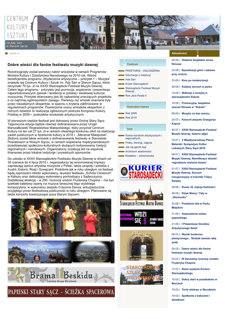 jesteś w: Aktualności 24-08 | Ostatnie bezpłatne sense Dobre wieści dla fanów festiwalu muzyki dawnej Rozstrzygnięty został pierwszy nabór wniosków w ramach Programów Ministra Kultury i Dziedzictwa Narodowego na 2010 rok. Wśród beneficjentów programu „Wydarzenia artystyczne – priorytet 1 – Muzyka” znalazło się Centrum Kultury i Sztuki im. Ady Sari w Starym Sączu, które otrzymało 70 tys. zł na XXXII Starosądecki Festiwal Muzyki Dawnej. Celem tego programu - priorytetu jest promocja, wspieranie i prezentacja najwartościowszych zjawisk i tendencji w polskiej i światowej kulturze muzycznej. Priorytet skierowany jest do najbardziej znaczących projektów, o co najmniej ogólnopolskim zasięgu. Pierwszy raz wnioski oceniane były przez niezaleŜnych ekspertów, w oparciu o kryteria zdefiniowane w regulaminach programów. Powierzenie oceny wniosków ekspertom z róŜnych dziedzin to realizacja zgłoszonych podczas Kongresu Kultury Polskiej w 2009 r. postulatów środowisk artystycznych. Centrum PRZETARGI - OGŁOSZENIA 23-08 | Rywalizacja gmin i zabawa Informacje o instytucji przy ruszcie Ada Sari 23-08 | Kino po modernizacji Kurier Starosądecki Starosądecki Festiwal Muzyki Dawnej Rok Jana Pawła II Rok 2009 12-08 | Wakacje z muzyką w starosądeckim Sokole seanse filmowe w "Sokole" 09-08 | Muzyka na bez czarny... 23-07 | Koncert zespołu Grzegorza Kapcia Inne Komis wyrobów artystycznych i regionalnych Próby, treningi, zajęcia Jak się garnki lepi 20-07 | XXXII Starosądecki Festiwal Muzyki Dawnej. Galeria zdjęć 15-07 | V Międzynarodowy Plener Malarski. Sympozjum Kultur Lokalnych Stary Sącz 2010 Archiwum wiadomości Redaktor – administrator Do udziału w XXXII Starosądeckim Festiwalu Muzyki Dawnej w dniach od 30 czerwca do 4 lipca 2010 r. organizatorzy tej renomowanej imprezy zapraszają oprócz artystów muzyków z Polski, takŜe zespoły i solistów z Austrii, Estonii, Rosji i Szwajcarii. Podobnie jak w roku ubiegłym na festiwal będą zaproszeni młodzi wykonawcy, laureaci festiwalu „Schola Cantorum” w Kaliszu oraz debiutujący wykonawcy pochodzący z Sądecczyzny. Dodatkową atrakcją – w 200. rocznicę urodzin Fryderyka Chopina – ma być spektakl baletowy oparty na muzyce tanecznej tego wybitnego kompozytora, w wykonaniu zespołu Cracovia Danza, entuzjastycznie przyjętego przez festiwalową publiczność w roku ubiegłym. Planowane są takŜe koncerty towarzyszące poza Starym Sączem. 20-08 | Kolejny koncert w parku 10-08 | Promocyjne, bezpłatne Kalendarz imprez Rok 2010 W pierwszym rzędzie festiwal jest dotowany przez Gminę Stary Sącz. Tegoroczna edycja będzie równieŜ dofinansowana przez Urząd Marszałkowski Województwa Małopolskiego, który przyznał Centrum Kultury na ten cel 27 tys. zł w ramach otwartego konkursu ofert na realizację zadań publicznych w dziedzinie kultury w 2010 r. „Mecenat Małopolski”. ZłoŜony został takŜe wniosek o dofinansowanie festiwalu w Starostwie Powiatowym w Nowym Sączu, w ramach wspierania międzynarodowych przedsięwzięć społeczno-kulturalnych słuŜących kultywowaniu tradycji regionalnych i narodowych. Organizatorzy oczekują teŜ na wsparcie finansowe przez lokalne instytucje i prywatnych sponsorów. filmowe 09-07 | XXXII Starosądecki Festiwal Muzyki Dawnej. Niemilknące oklaski nagradzane wieloma bisami 01-07 | XXXII Starosądecki Festiwal Muzyki Dawnej. Koncert inauguracyjny w kościele Trójcy Świętej 29-06 | Rusza 32. edycja festiwalu! 29-06 | Dzień Mamy i Taty w „Słoneczku” 23-06 | Powitanie lata w Parku Miejskim 21-06 | DoposaŜenie szlaku papieskiego 21-06 | I Prezentacje Dorobku Artystycznego Szkół 08-03 | Wyniki konkursu plastycznego... StraŜak zawsze rękę poda 25-02 | Dobre wieści dla fanów festiwalu muzyki dawnej 23-02 | W dwusetną rocznicę urodzin Fryderyka Chopina 17-02 | Nowe wydanie Kuriera Starosądeckiego 15-02 | Dobry start w przedszkolu w Barciach 10-02 | Tenis stołowy w Skrudzinie 10-02 | Spotkanie z babciami i dziadkami