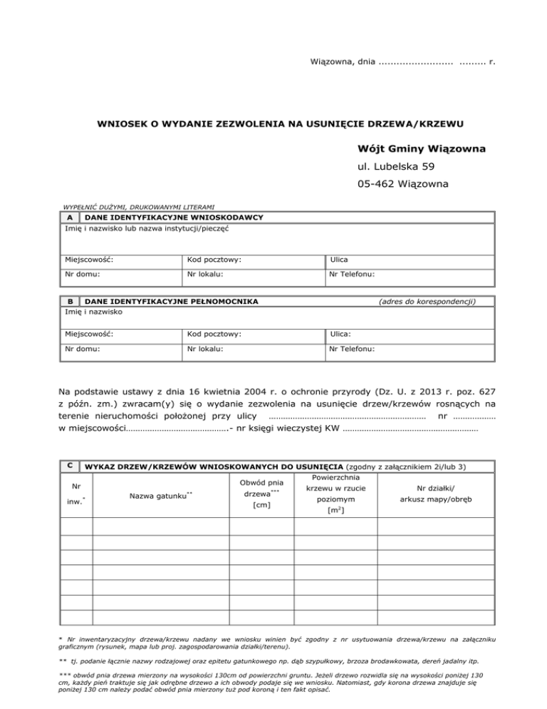 Wiązowna, dnia ......................... ......... r. WNIOSEK O WYDANIE ZEZWOLENIA NA USUNIĘCIE DRZEWA/KRZEWU Wójt Gminy Wiązowna ul. Lubelska 59 05-462 Wiązowna WYPEŁNIĆ DUŻYMI, DRUKOWANYMI LITERAMI A DANE IDENTYFIKACYJNE WNIOSKODAWCY Imię i nazwisko lub nazwa instytucji/pieczęć Miejscowość: Kod pocztowy: Ulica Nr domu: Nr lokalu: Nr Telefonu: B DANE IDENTYFIKACYJNE PEŁNOMOCNIKA Imię i nazwisko (adres do korespondencji) Miejscowość: Kod pocztowy: Ulica: Nr domu: Nr lokalu: Nr Telefonu: Na podstawie ustawy z dnia 16 kwietnia 2004 r. o ochronie przyrody (Dz. U. z 2013 r. poz. 627 z późn. zm.) zwracam(y) się o wydanie zezwolenia na usunięcie drzew/krzewów rosnących na terenie nieruchomości położonej przy ulicy ………………………………………………………… nr ……………… w miejscowości…………………………………….- nr księgi wieczystej KW ………………………………………………… C WYKAZ DRZEW/KRZEWÓW WNIOSKOWANYCH DO USUNIĘCIA (zgodny z załącznikiem 2i/lub 3) Obwód pnia Nr * inw. Nazwa gatunku** drzewa*** [cm] Powierzchnia krzewu w rzucie Nr działki/ poziomym arkusz mapy/obręb [m2] * Nr inwentaryzacyjny drzewa/krzewu nadany we wniosku winien być zgodny z nr usytuowania drzewa/krzewu na załączniku graficznym (rysunek, mapa lub proj. zagospodarowania działki/terenu). ** tj. podanie łącznie nazwy rodzajowej oraz epitetu gatunkowego np. dąb szypułkowy, brzoza brodawkowata, dereń jadalny itp. *** obwód pnia drzewa mierzony na wysokości 130cm od powierzchni gruntu. Jeżeli drzewo rozwidla się na wysokości poniżej 130 cm, każdy pień traktuje się jak odrębne drzewo a ich obwody podaje się we wniosku. Natomiast, gdy korona drzewa znajduje się poniżej 130 cm należy podać obwód pnia mierzony tuż pod koroną i ten fakt opisać. D PRZYCZYNA ZAMIERZONEGO USUNIĘCIA DRZEWA/KRZEWU* (opisać np. zły stan zdrowotny, kolizja z inwestycją i inne). ……………………………………………………………………………………………………. ……………………………………………………………………………………………………………… ……………………………………………………………………………………………………………… ……………………………………………………………………………………………………………… ……………………………………………………………………………………………………………… ……………………………………………………………………………………………………………… ……………………………………………………………………………………………………………… ……………………………………………………………………………………………………………… ……………………………………………………………………………………………………………… ……………………………………………………………………………………………………………… ……………………………………………………………………………………………………………… ……………………………………………………………………………………………………………… ……………………………………………………………………………………………………………… ……………………………………………………………………………………………………………… ……………………………………………………………………………………………………………… MIEJSCE, NA KTÓRYM ROŚNIE DRZEWO/KRZEW* (wg. miejscowego planu zagospodarowania przestrzennego, E ewidencji gruntów, aktualnego sposobu korzystania z nieruchomości: np. działka budowlana, nieużytki, park, zieleniec, pas drogowy drogi publicznej, użytki rolne, … inne). F WSKAZAĆ CZY USUNIĘCIE WYNIKA Z CELU ZWIĄZANEGO Z PROWADZENIEM DZIAŁALNOŚCI GOSPODARCZEJ (Zaznaczyć właściwy kwadrat) 1. Wynika G 2. Nie wynika PLANOWANY TERMIN USUNIĘCIA DRZEWA/KRZEWU* (data, do której wnioskodawca planuje usunąć drzewo/krzew). dzień …………, miesiąc ……………………………………, rok ……………. Pouczony o odpowiedzialności za składanie fałszywych zeznań na podstawie art. 75 § 2 ustawy z dnia 14 czerwca 1960 r. Kodeks postępowania administracyjnego (Dz. U. z 2013 r. poz. 267, z późn. zm.) oświadczam, iż dane zawarte w tym wniosku są zgodne ze stanem faktycznym. ……………………………………………………………… czytelny(e) podpis(y) wnioskodawcy/ wnioskodawców lub pełnomocnika H Do wniosku dołączam: 1 W przypadku, gdy nieruchomość stanowi współwłasność – zgodę wszystkich współwłaścicieli ze wskazaniem ich adresów zamieszkania i adresów do korespondencji Rysunek lub mapę określającą usytuowanie drzewa/krzewu w odniesieniu do granic nieruchomości i obiektów budowlanych istniejących lub projektowanych na tej nieruchomości W przypadku realizacji inwestycji dołączam projekt zagospodarowania działki lub terenu (wykonany przez projektanta posiadającego odpowiednie uprawnienia budowlane), dla której jest on wymagany zgodnie z ustawą z dnia 7 lipca 1994 r. – Prawo budowlane – określające usytuowanie drzewa lub krzewu w odniesieniu do granic nieruchomości i obiektów budowlanych istniejących lub projektowanych na tej nieruchomości Jeżeli są planowane nasadzenia zastępcze - Projekt planu nasadzeń zastępczych, o którym mowa w art. 83b ust. 1, pkt 9, lit. a) ustawy o ochronie przyrody Projekt planu przesadzenia drzewa lub krzewu, o którym mowa w art. 83b ust. 1, pkt 9, lit. b) ustawy o ochronie