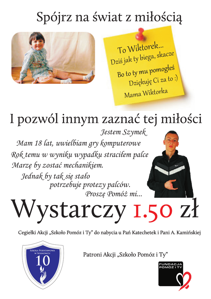 Spójrz na œwiat z mi³oœci¹ . . . k e r o t k To Wi cze a k s , a g e i b y t k a j œ i z D œ e ³ g o m o p Bo to ty mu ) : o t a z i C Dziêkujê a k r o t k i W a Mam I pozwól innym zaznaæ tej mi³oœci Jestem Szymek Mam 18 lat, uwielbiam gry komputerowe Rok temu w wyniku wypadku straci³em palce Marzê by zostaæ mechanikiem. Jednak by tak siê sta³o potrzebuje protezy palców. Proszê Pomó¿ mi... Wystarczy 1.50 z³ Cegie³ki Akcji „Szko³o Pomóz i Ty” do nabycia u Pañ Katechetek i Pani A. Kamiñskiej 10 Patroni Akcji „Szko³o Pomóz i Ty”