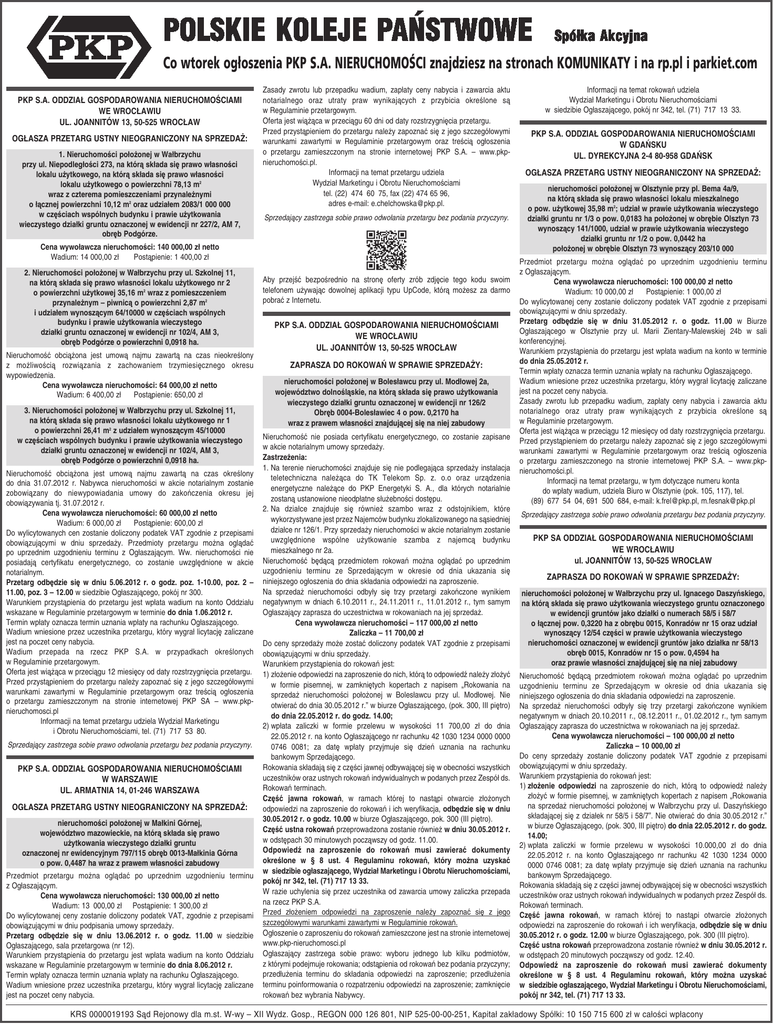 Co wtorek ogłoszenia PKP S.A. NIERUCHOMOŚCI znajdziesz na stronach KOMUNIKATY i na rp.pl i parkiet.com PKP S.A. ODDZIAŁ GOSPODAROWANIA NIERUCHOMOŚCIAMI WE WROCŁAWIU UL. JOANNITÓW 13, 50-525 WROCŁAW OGŁASZA PRZETARG USTNY NIEOGRANICZONY NA SPRZEDAŻ: 1. Nieruchomości położonej w Wałbrzychu przy ul. Niepodległości 273, na którą składa się prawo własności lokalu użytkowego, na którą składa się prawo własności lokalu użytkowego o powierzchni 78,13 m2 wraz z czterema pomieszczeniami przynależnymi o łącznej powierzchni 10,12 m2 oraz udziałem 2083/1 000 000 w częściach wspólnych budynku i prawie użytkowania wieczystego działki gruntu oznaczonej w ewidencji nr 227/2, AM 7, obręb Podgórze. Zasady zwrotu lub przepadku wadium, zapłaty ceny nabycia i zawarcia aktu notarialnego oraz utraty praw wynikających z przybicia określone są w Regulaminie przetargowym. Oferta jest wiążąca w przeciągu 60 dni od daty rozstrzygnięcia przetargu. Przed przystąpieniem do przetargu należy zapoznać się z jego szczegółowymi warunkami zawartymi w Regulaminie przetargowym oraz treścią ogłoszenia o przetargu zamieszczonym na stronie internetowej PKP S.A. – www.pkpnieruchomości.pl. Informacji na temat przetargu udziela Wydział Marketingu i Obrotu Nieruchomościami tel. (22) 474 60 75, fax (22) 474 65 96, adres e-mail: [email protected]. Sprzedający zastrzega sobie prawo odwołania przetargu bez podania przyczyny. Cena wywoławcza nieruchomości: 140 000,00 zł netto Wadium: 14 000,00 zł Postąpienie: 1 400,00 zł 2. Nieruchomości położonej w Wałbrzychu przy ul. Szkolnej 11, na którą składa się prawo własności lokalu użytkowego nr 2 o powierzchni użytkowej 35,16 m2 wraz z pomieszczeniem przynależnym – piwnicą o powierzchni 2,87 m2 i udziałem wynoszącym 64/10000 w częściach wspólnych budynku i prawie użytkowania wieczystego działki gruntu oznaczonej w ewidencji nr 102/4, AM 3, obręb Podgórze o powierzchni 0,0918 ha. Nieruchomość obciążona jest umową najmu zawartą na czas nieokreślony z możliwością rozwiązania z zachowaniem trzymiesięcznego okresu wypowiedzenia. Cena wywoławcza nieruchomości: 64 000,00 zł netto Wadium: 6 400,00 zł Postąpienie: 650,00 zł 3. Nieruchomości położonej w Wałbrzychu przy ul. Szkolnej 11, na którą składa się prawo własności lokalu użytkowego nr 1 o powierzchni 26,41 m2 z udziałem wynoszącym 45/10000 w częściach wspólnych budynku i prawie użytkowania wieczystego działki gruntu oznaczonej w ewidencji nr 102/4, AM 3, obręb Podgórze o powierzchni 0,0918 ha. Nieruchomość obciążona jest umową najmu zawartą na czas określony do dnia 31.07.2012 r. Nabywca nieruchomości w akcie notarialnym zostanie zobowiązany do niewypowiadania umowy do zakończenia okresu jej obowiązywania tj. 31.07.2012 r. Cena wywoławcza nieruchomości: 60 000,00 zł netto Wadium: 6 000,00 zł Postąpienie: 600,00 zł Do wylicytowanych cen zostanie doliczony podatek VAT zgodnie z przepisami obowiązującymi w dniu sprzedaży. Przedmioty przetargu można oglądać po uprzednim uzgodnieniu terminu z Ogłaszającym. Ww. nieruchomości nie posiadają certyfikatu energetycznego, co zostanie uwzględnione w akcie notarialnym. Przetarg odbędzie się w dniu 5.06.2012 r. o godz. poz. 1-10.00, poz. 2 – 11.00, poz. 3 – 12.00 w siedzibie Ogłaszającego, pokój nr 300. Warunkiem przystąpienia do przetargu jest wpłata wadium na konto Oddziału wskazane w Regulaminie przetargowym w terminie do dnia 1.06.2012 r. Termin wpłaty oznacza termin uznania wpłaty na rachunku Ogłaszającego. Wadium wniesione przez uczestnika przetargu, który wygrał licytację zaliczane jest na poczet ceny nabycia. Wadium przepada na rzecz PKP S.A. w przypadkach określonych w Regulaminie przetargowym. Oferta jest wiążąca w przeciągu 12 miesięcy od daty rozstrzygnięcia przetargu. Przed przystąpieniem do przetargu należy zapoznać się z jego szczegółowymi warunkami zawartymi w Regulaminie przetargowym oraz treścią ogłoszenia o przetargu zamieszczonym na stronie internetowej PKP SA – www.pkpnieruchomosci.pl Informacji na temat przetargu udziela Wydział Marketingu i Obrotu Nieruchomościami, tel. (71) 717 53 80. Sprzedający zastrzega sobie prawo odwołania przetargu bez podania przyczyny. PKP S.A. ODDZIAŁ GOSPODAROWANIA NIERUCHOMOŚCIAMI W WARSZAWIE UL. ARMATNIA 14, 01-246 WARSZAWA OGŁASZA PRZETARG USTNY NIEOGRANICZONY NA SPRZEDAŻ: nieruchomości położonej w Małkini Górnej, województwo mazowieckie, na którą składa się prawo użytkowania wieczystego działki gruntu oznaczonej nr ewidencyjnym 797/115 obręb 0013-Małkinia Górna o pow. 0,4487 ha wraz z prawem własności zabudowy Przedmiot przetargu można oglądać po uprzednim uzgodnieniu terminu z Ogłaszającym. Cena wywoławcza nieruchomości: 130 000,00 zł netto Wadium: 13 000,00 zł Postąpienie: 1 300,00 zł Do wylicytowanej ceny zostanie doliczony podatek VAT, zgodnie z przepisami obowiązującymi w dniu podpisania umowy sprzedaży. Przetarg odbędzie się w dniu 13.06.2012 r. o godz. 11.00 w siedzibie Ogłaszającego, sala przetargowa (nr 12). Warunkiem przystąpienia do przetargu jest wpłata wadium na konto Oddziału wskazane w Regulaminie przetargowym w terminie do dnia 8.06.2012 r. Termin wpłaty oznacza termin uznania wpłaty na rachunku Ogłaszającego. Wadium wniesione przez uczestnika przetargu, który wygrał licytację zaliczane jest na poczet ceny nabycia. Aby przejść bezpośrednio na stronę oferty zrób zdjęcie tego kodu swoim telefonem używając dowolnej aplikacji typu UpCode, którą możesz za darmo pobrać z Internetu. PKP S.A. ODDZIAŁ GOSPODAROWANIA NIERUCHOMOŚCIAMI WE WROCŁAWIU UL. JOANNITÓW 13, 50-525 WROCŁAW ZAPRASZA DO ROKOWAŃ W SPRAWIE SPRZEDAŻY: nieruchomości położonej w Bolesławcu przy ul. Modłowej 2a, województwo dolnośląskie, na którą składa się prawo użytkowania wieczystego działki gruntu oznaczo