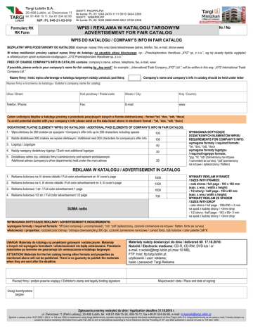 SWIFT: PKOPPLPW Nr konta: PL 03 1240 2470 1111 0010 3424 2280 SWIFT: WBKPPLPP Nr konta: PL 80 1090 2688 0000 0001 0728 2338 Formularz RK RK Form Nr / No WPIS I REKLAMA W KATALOGU TARGOWYM ADVERTISEMENT FOR FAIR CATALOG WPIS DO KATALOGU / COMPANY’S INFO IN FAIR CATALOG BEZPŁATNY WPIS PODSTAWOWY DO KATALOGU obejmuje: nazwę firmy oraz dane teleadresowe (adres, telefon, fax, e-mail, strona www) W miarę możliwości prosimy zapisać nazwę firmy do katalogu na zasadzie słowa kluczowego, np.: „Przedsiębiorstwo Handlowe „XYZ” sp. z o.o.”, wg tej zasady będzie wyglądać w alfabetycznym spisie wystawców następująco: „XYZ Przedsiębiorstwo Handlowe sp. z o.o.” FREE OF CHARGE COMPANY’S INFO IN CATALOG contains: company’s name, adress, telephone, fax, e-mail, www If possible, please write in your company’s name for fair catalog by „key word”, for example.: „International Tade Company „XYZ” Ltd.”, will be written in this way: „XYZ International Trade Company Ltd.” Nazwę firmy i treść wpisu ofertowego w katalogu targowym należy umieścić pod literą: Company’s name and company’s info in catalog should be held under letter Nazwa firmy w brzmieniu do katalogu / Exibitor’s company name for catalog: Ulica / Street: Kod pocztowy / Postal code: Miasto / City: Kraj / Country: Telefon / Phone: Fax: E-mail: www: Celem uniknięcia błędów w katalogu prosimy o przesłanie powyższych danych w formie elektronicznej - format *txt, *doc, *odt, *docx) To avoid potential doubts with your company’s info please send us the data listed above in electronic format - *txt, *doc, *odt, *docx) DODATKOWE PŁATNE ELEMENTY WPISU DO KATALOGU / ADDITIONAL PAID ELEMENTS OF COMPANY’S INFO IN FAIR CATALOG: 1. Wpis ofertowy do 200 znaków ze spacjami / Company’s offer info up to 200 characters including spaces 100 2. Każde dodatkowe 200 znaków we wpisie ofertowym / Additional next 200 characters for companys’s offer info 100 3. Logotyp / Logotype 50 4. Każdy następny dodatkowy logotyp / Each next additional logotype 30 5. Dodatkowy adres (np. oddziału firmy) zamieszczony pod wpisem podstawowym Additional adress (company’s other departments) held under the main adress 20 WYMAGANIA DOTYCZĄCE DODATKOWYCH ELEMENTÓW WPISU REQUIREMENTS FOR COMPANY’S INFO: wymagane formaty / required formats: *txt, *doc, *odt, *docx wymagane formaty logotypu / required logotype formats: *jpg, *tif, *cdr (zamieniony na krzywe / converted to curves), *pdf (zamieniony na krzywe i spłaszczony / flatten) REKLAMA W KATALOGU / ADVERTISEMENT IN CATALOG 1. Reklama kolorowa na IV stronie okładki / Full color advertisement on IV cover’s page 1500 2. Reklama kolorowa na II, III stronie okładki / Full color advertisement on II, III cover’s page 1300 3. Reklama kolorowa 1 str. / Full color advertisement 1 page 1000 4. Reklama kolorowa 1/2 str. / Full color advertisement 1/2 page 700 SUMA netto WYMIARY REKLAM W RAMCE / SIZES WITH FRAMES: - cała strona / full page - 183 x 183 mm (szer. x wys. / width x height) - 1/2 strony / half page - 183 x 85 mm (szer. x wys./ width x height) WYMIARY REKLAM ZE SPADEM / SIZES WITH DROP - cała strona / full page - 190x190 + 3 mm na spad z każdej strony / +3mm drop - 1/2 strony / half page - 183 x 85+ 3 mm na spad z każdej strony / +3mm drop WYMAGANIA DOTYCZĄCE REKLAMY / ADVERTISEMENT’S REQUIREMENTS: wymagane formaty / required formats: *tiff (bez kompresji / uncompressed), *cdr, *pdf (spłaszczony, czcionki zamienione na krzywe / flatten, fonts as curves) właściwości / properties: rozdzielczość bitmap / bitmaps downsampling 300 dpi, czcionki zamienione na krzywe / curved fonts, tryb kolorów / color palette CMYK UWAGA! Materiały do katalogu są projektami gotowymi i ostatecznymi. Materiały o innych niż wymagane formatach i właściwościach nie będą umieszczane. Przesłanie materiałów po terminie nie gwarantuje ich umieszczenia w katalogu targowym. ATTENTION! Materials for the fair catalog having other formats and properties as mentioned above will not be published. There is no guaranty to publish the materials when they are sent after the deadline. Pieczęć firmy i podpis prawnie wiążący / Exhibitor’s stamp and legally binding signature Materiały należy dostarczyć do dnia / delivered till 17.10.2016: Nośniki / Electronic mediums: CD-R, CD-RW, DVD lub / or e-mail: [email protected] (max 10 MB), FTP: host: ftp.targi.lublin.pl; użytkownik / user: reklama; hasło / password: Targi.Reklama Miejscowość i data / Place and date of signing Uwagi koordynatora targów: Zgłoszenia prosimy nadsyłać do dnia / Application deadline 31.10.2016 r. ul. Dworcowa 11 (Park Ludowy), 20-406 Lublin, tel. +48 81 458-15-34, 458-15-11, fax +48 81 534-92-95, e-mail: [email protected] Zgodnie z ustawą z dnia 18.07.2002 r. (Dz.U. nr 144 poz.1204) o świadczeniu usług drogą elektroniczną, wyrażam zgodę na otrzymywanie informacji marketingowych od firmy Targi Lublin S.A. drogą elektroniczną na ww adres e-mail./ I hereby declare my consent to receive marketing information from Lublin Fair JSC on a/m e-mail address (according to Act on Electronic Service Providing of 18 th July 2002 published in Journal of Laws no 144 item 1204)