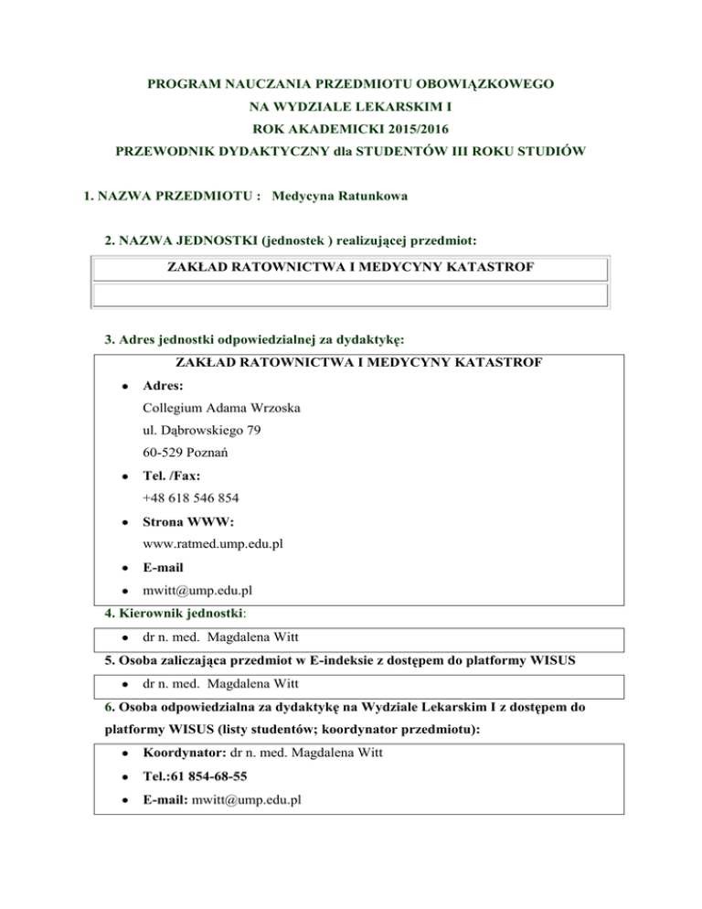 PROGRAM NAUCZANIA PRZEDMIOTU OBOWIĄZKOWEGO NA WYDZIALE LEKARSKIM I ROK AKADEMICKI 2015/2016 PRZEWODNIK DYDAKTYCZNY dla STUDENTÓW III ROKU STUDIÓW 1. NAZWA PRZEDMIOTU : Medycyna Ratunkowa 2. NAZWA JEDNOSTKI (jednostek ) realizującej przedmiot: ZAKŁAD RATOWNICTWA I MEDYCYNY KATASTROF 3. Adres jednostki odpowiedzialnej za dydaktykę: ZAKŁAD RATOWNICTWA I MEDYCYNY KATASTROF Adres: Collegium Adama Wrzoska ul. Dąbrowskiego 79 60-529 Poznań Tel. /Fax: +48 618 546 854 Strona WWW: www.ratmed.ump.edu.pl E-mail [email protected] 4. Kierownik jednostki: dr n. med. Magdalena Witt 5. Osoba zaliczająca przedmiot w E-indeksie z dostępem do platformy WISUS dr n. med. Magdalena Witt 6. Osoba odpowiedzialna za dydaktykę na Wydziale Lekarskim I z dostępem do platformy WISUS (listy studentów; koordynator przedmiotu): Koordynator: dr n. med. Magdalena Witt Tel.:61 854-68-55 E-mail: [email protected] Osoba zastępująca: lek.med. Wojciech Telec Tel. 666-296-733 E-mail: [email protected] 7. Miejsce przedmiotu w programie studiów: Rok: III Semestr: zimowy/letni (V / VI) 8. Liczba godzin ogółem : 35 Jednostki uczestniczące w nauczaniu przedmiotu liczba pkt. ECTS: 1 Semestr zimowy i/lub letni liczba godzin W Ć Ćwiczenia kategoria S Zakład Ratownictwa i Medycyny Katastrof 5 30 C 0 Razem: 5 30 C 0 9. Zakres wiedzy ( zgodnie z Rozporządzeniem Ministra Nauki i Szkolnictwa Wyższego z dnia 9 maja 2012 r. w sprawie standardów kształcenia dla kierunków Studiów: lekarskiego Zgodny z pkt. 11 - SYLABUS 10. Umiejętności ( zgodnie z Rozporządzeniem Ministra Nauki i Szkolnictwa Wyższego z dnia 9 maja 2012 r. w sprawie standardów kształcenia dla kierunków Studiów: lekarskiego Zgodny z pkt. 11 - SYLABUS 11. SYLABUS Nazwa przedmiotu/modułu Wydział Nazwa kierunku studiów Poziom kształcenia Forma studiów Język przedmiotu MEDYCYNA RATUNKOWA WYDZIAŁ LEKARSKI I LEKARSKI PRZEDDYPLOMOWY DZIENNE JEDNOLITE MAGISTERSKIE O PROFILU PRAKTYCZNYM JĘZYK POLSKI obowiązkowy Rodzaj przedmiotu fakultatywny Rok studiów/semestr 1 2 3 4 5 6 7 I II III IV V VI 10 11 12 Liczba godzin zajęć dydaktycznych z podziałem na formy prowadzenia zajęć Razem 35, w tym: Założenia i cele przedmiotu Celem praktycznego nauczania jest poszerzenie wiedzy i nabycie umiejętności i kompetencji diagnostyki i leczenia w stanach nagłego zagrożenia życia dorosłych i dzieci oraz postępowania w wypadkach masowych i katastrofach na etapie przedszpitalnym C(W)1 Zna zasady prowadzenia akcji ratowniczej w wypadku masowym i katastrofie C(W)2 Zna zasady oceny stanu chorego po urazie oraz zasady kinematyki urazu C(W)3 Zna zasady opatrywania ran oraz zasady tamowania krwotoków C(W)4 Zna reguły unieruchamiania złamań, zwichnięć i skręceń C(W)5 Zna zasady unieruchamiania kręgosłupa ze szczególnym uwzględnieniem odcinka szyjnego oraz wykorzystanie kołnierza ortopedycznego i deki ortopedycznej, KED C(W)6 Zna zasady i wskazania zabezpieczenia drożności dróg oddechowych, odbarczenia odmy prężnej oraz wspomagania wentylacji C(W)7 Zna zasady przeprowadzenia segregacji medycznej C(W)8 Zna techniki wykonania dostępu doszpikowego oraz techniki ewakuacji poszkodowanych w trudnych warunkach C(U)1 Potrafi współpracować z ratownikami Krajowego System Ratowniczo-Gaśniczego na miejscu zdarzenia C(U)2 Umie wdrożyć prawidłowe postępowanie ratownicze w różnego rodzaju katastrofach C(U)3 Potrafi opatrywać rany oraz potrafi tamować krwotoki C(U)4 Potrafi unieruchomić złamania, zwichnięcia i skręcenia oraz kręgosłup C(U)5 Potrafi wykonać odbarczenie odmy prężnej C(U)6 Potrafi ewakuować poszkodowanych oraz potrafi wykonać dostęp doszpikowy 5 - wykłady, 0- seminaria, 8 9 30- ćwiczenia, 0 – fakultety C(U)7 Przeprowadza segregację medyczną C(KS)1 Szanuje godność osoby ludzkiej w relacji z pacjentem i jego rodziną C(KS)2 Przestrzega praw pacjenta C(KS)3 Przestrzega tajemnicy zawodowej C(KS)4 Współdziała w ramach zespołu interdyscyplinarnego w rozwiązywaniu dylematów etycznych z zachowaniem zasad kodeksu etyki zawodowej; C(KS)5 Przestrzega wartości, powinności i sprawności moralnych w opiece C(KS)6 Wykazuje odpowiedzialność moralną za człowieka i wykonywanie zadań zawodowych C(KS)7 Jest otwarty na rozwój podmiotowości własnej i pacjenta; C(KS)8 Przejawia empatię w relacji z pacjentem i jego rodziną oraz współpracownikami Symbol efektów kształcenia zgodnie ze standardami EK(W)1 FW01 a,b,c,d FW07 FW08 EW14 j. EK(U)1 FU04, FU08 OPIS KIERUNKOWYCH EFEKTÓW KSZTAŁCENIA WIEDZA (ZGODNIE ZE SZCZEGÓŁOWYMI EFEKTAMI KSZTAŁCENIA) Zna problematykę medycyny katastrof ze szczególnym uwzględnieniem poziomu ratownictwa medycznego Rozumie przyczyny, objawy, zasady diagnozowania oraz postepowania terapeutycznego na etapie przedszpitalnym w odniesieniu do najczęstszych chorób wymagających interwencji chirurgicznej, z uwzględnieniem odrębności wieku dziecięcego w tym w szczególności: a) ostrych i przewlekłych chorób jamy brzusznej, b) chorób klatki piersiowej, c) chorób kończyn i głowy, d) złamań kości i urazów narządów Metody weryfikacji osiągnięcia zamierzonych efektów kształcenia: Test wiedzy i zaliczenie praktyczne Zna aktualne wytyczne resuscytacji krążeniowo-oddechowej noworodków, dzieci i dorosłych Zna zasady funkcjonowania zintegrowanego systemu państwowego ratownictwa medycznego Zna i rozumie przyczyny, objawy, zasady diagnozowania i postepowania terapeutycznego na etapie przedszpitalnym w najczęstszych chorobach układu nerwowego, w tym: j) urazach czaszkowo-mózgowych, w szczególności wstrząśnieniu mózgu UMIEJĘTNOŚCI (ZGODNIE ZE SZCZEGÓŁOWYMI EFEKTAMI KSZTAŁCENIA) Potrafi zapobiegać katastrofom, brać udział w ich opanowaniu i analizowaniu działań związanych z medycyną katastrof Potrafi zaopatrzyć prostą ranę, założyć i zmienić jałowy opatrunek chirurgiczny; Wykonuje doraźne unieruchomienie kończyny, wybiera rodzaj unieruchomienia kon