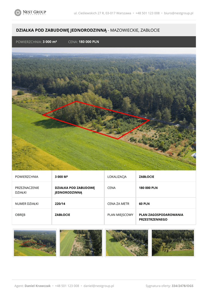 ul. Cieślewskich 27 R, 03-017 Warszawa • +48 501 123 008 • [email protected] DZIAŁKA POD ZABUDOWĘ JEDNORODZINNĄ - MAZOWIECKIE, ZABŁOCIE POWIERZCHNIA: 3 000 m² CENA: 180 000 PLN POWIERZCHNIA 3 000 M² LOKALIZACJA ZABŁOCIE PRZEZNACZENIE DZIAŁKI DZIAŁKA POD ZABUDOWĘ JEDNORODZINNĄ CENA 180 000 PLN NUMER DZIAŁKI 220/14 CENA ZA METR 60 PLN OBRĘB ZABŁOCIE PLAN MIEJSCOWY PLAN ZAGOSPODAROWANIA PRZESTRZENNEGO Agent: Daniel Krawczak • +48 501 123 008 • [email protected] Sygnatura oferty: 334/2478/OGS ul. Cieślewskich 27 R, 03-017 Warszawa • +48 501 123 008 • [email protected] OPIS Działka położona w zielonej okolicy Jeziora Zegrzyńskiego - plaża i port w Jachrance - 9km od działki. Miejsce dla osób ceniących ciszę i spokój. Widok na ścianę lasu. W sąsiedztwie pojedyncze nowe domy jednorodzinne. Działka leżąca dłuższym bokiem (ponad 74m) bezpośrednio przy drodze asfaltowej - wjazd od wschodu. Istnieje możliwość podziału na 3 działki po ok. 1000m2 przy wymiarach ok. 25m x 40m - każda będzie posiadała wjazd od wschodu i bezpośrednio z asfaltu (sprzedaż jednak tylko w całości) Przy ewentualnym podziale możliwość budowy do 3 domów wolnostojących lub 2 bliźniaków (łącznie od 4 donawet 6 jednostek mieszkalnych) Teren objęty jest planem miejscowym o przeznaczeniu MN15 - zabudowa mieszkaniowa jednorodzinna. Dopuszcza się nieuciążliwe usługi, których powierzchnia nie może przekraczać 40% projektowanych budynków. Plan ponadto ustala następujące możliwości zabudowy: - maksymalnie do 11m wysokości - maksymalnie do 3 kondygnacji, w tym ostatnia kondygnacja jako poddasze użytkowe, - dachy płaskie lub o nachyleniu 20 do 45 stopni, - maksymalny wskaźnik powierzchni zabudowy 0,3 - minimalna powierzchnia biologicznie czynna 60%, - budynki garażowe i gospodarcze do 1 kondygnacji nadziemnej i max. do 6m wysokości, - minimalna powierzchnia działki budowlanej 800m2 dla zabudowy wolnostojącej i 600m dla 1 segmentu w zabudowie bliźniaczej, - 2 miejsca parkingowe na każdy lokal mieszkalny Na działce pojedyncze samosiejki - przeważnie brzozy Istnieje możliwość ich usunięcia bez żadnych opłat - do uzgodnienia Bezpośrednio przy działce wodociąg miejski Odległości: - przystanek autobusowy - 250m - Zapora w Dębe - 7km - Jachranka - 9km - Serock (urząd gminy) - 12 km - Legionowo - 18km Agent: Daniel Krawczak • +48 501 123 008 • [email protected] Sygnatura oferty: 334/2478/OGS ul. Cieślewskich 27 R, 03-017 Warszawa • +48 501 123 008 • [email protected] - Warszawa Centralna - 43km Agent: Daniel Krawczak • +48 501 123 008 • [email protected] Sygnatura oferty: 334/2478/OGS