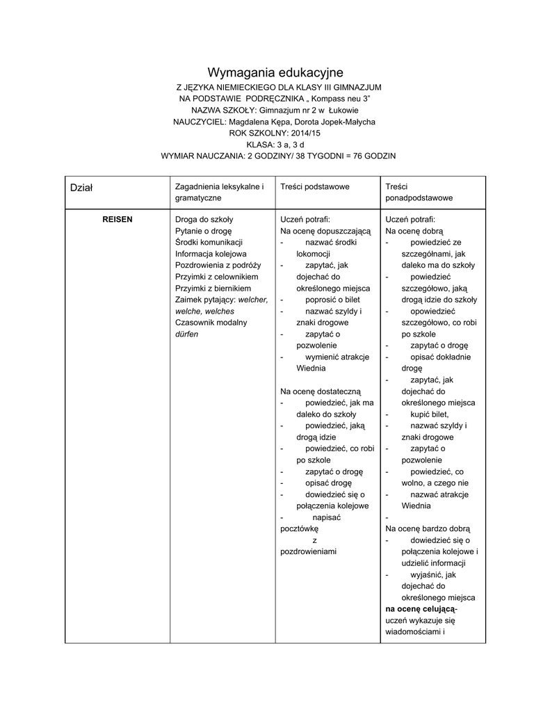 Wymagania edukacyjne Z JĘZYKA NIEMIECKIEGO DLA KLASY III GIMNAZJUM NA PODSTAWIE PODRĘCZNIKA „ Kompass neu 3” NAZWA SZKOŁY: Gimnazjum nr 2 w Łukowie NAUCZYCIEL: Magdalena Kępa, Dorota JopekMałycha ROK SZKOLNY: 2014/15 KLASA: 3 a, 3 d WYMIAR NAUCZANIA: 2 GODZINY/ 38 TYGODNI = 76 GODZIN Dział REISEN Zagadnienia leksykalne i gramatyczne Treści podstawowe Treści ponadpodstawowe Droga do szkoły Pytanie o drogę Środki komunikacji Informacja kolejowa Pozdrowienia z podróży Przyimki z celownikiem Przyimki z biernikiem Zaimek pytający: welcher, welche, welches Czasownik modalny dürfen Uczeń potrafi: Na ocenę dopuszczającą nazwać środki lokomocji zapytać, jak dojechać do określonego miejsca poprosić o bilet nazwać szyldy i znaki drogowe zapytać o pozwolenie wymienić atrakcje Wiednia Na ocenę dostateczną powiedzieć, jak ma daleko do szkoły powiedzieć, jaką drogą idzie powiedzieć, co robi po szkole zapytać o drogę opisać drogę dowiedzieć się o połączenia kolejowe napisać pocztówkę z pozdrowieniami Uczeń potrafi: Na ocenę dobrą powiedzieć ze szczegółnami, jak daleko ma do szkoły powiedzieć szczegółowo, jaką drogą idzie do szkoły opowiedzieć szczegółowo, co robi po szkole zapytać o drogę opisać dokładnie drogę zapytać, jak dojechać do określonego miejsca kupić bilet, nazwać szyldy i znaki drogowe zapytać o pozwolenie powiedzieć, co wolno, a czego nie nazwać atrakcje Wiednia Na ocenę bardzo dobrą dowiedzieć się o połączenia kolejowe i udzielić informacji wyjaśnić, jak dojechać do określonego miejsca na ocenę celującą uczeń wykazuje się wiadomościami i umiejętnościami poza te prezentowane i ćwiczone na lekcjach Sommerferien Opowiadanie o wakacjach. Wakacje za granicą. Na campingu. Noclegi na wakacjach. Najciekawsze przeżycia z wakacji. Użycie przyimków z nazwami państw. Rekcja czasowników. Tworzenie nazw mieszkańców od nazwy krajów. Stopniowanie przymiotników i przysłówków. Zdania podrzędnie złożone z zaimkiem pytającym w roli spójnika. Zdanie podrzędnie złożone ze spójnikiem ob Uczeń potrafi: Na ocenę dopuszczając nazywa kontynenty nazywa ich mieszkańców wymienia środki lokomocji nazywa obiekty na campingu podaje miejsca wypoczynku tworzy nazwy mieszkańców od nazw krajów zna zasady stopniowania przymiotników i przysłówków zna zaimki pytające zna spójnik ob Na ocenę dostateczną potrafi nazwać sprzęt turystyczny potrafi zapytać i podać kraje pochodzenia i zamieszkania opowiada, dokąd, z kim i czym jeżdzi na wakacje informuje o czynnościach w czasie wolnym stopniuje przymiotniki i przysłówki zna szyk zdania podrzędnego buduje zdanie ze spójnikiem ob Uczeń potrafi: Na ocenę dobrą opowiada o wakacjach zna rekcję czasowników stosuje zaimki pytające w roli spójnika Na ocenę bardzo dobrą porównuje miejsca wypoczynku i uzasadnia, gdzie najchętniej mieszka stosuje rekcje czasowników na ocenę celującą uczeń wykazuje się wiadomościami i umiejętnościami poza te prezentowane i ćwiczone na lekcjach Gesund bleiben Opisywanie dolegliwości. Wizyta u lekarza. wyjaśnienie przyczyny dolegliwości. Uczeń potrafi: Na ocenę dopuszczającą Uczeń potrafi: Na ocenę dobrą Schon aussehen, gut einkaufen Opis przebiegu choroby. Opis zdrowego trybu życia. Udzielanie rad. Zdania współrzędnie złożone ze spójnikiem weil. Deklinacja słaba rzeczownika. Odmiana czasowników modalnych w czasie Prateritum. Rekcja czasowników cd. nazywa części ciała nazywa dolegliwości zna spójinik weil umie wyjaśnić zasady tworzenia czasu Prateritum czasowników modalnych Na ocenę dostateczną opisuje swoje dolegliwości umawia wizytę u lekarza tworzy zdania z czasownikami modalnymi w Prateritum opisuje przebieg przebytej choroby podaje przyczynę dolegliwości zna rekcję czasownika opisuje zdrowy tryb życia Na ocenę bardzo dobrą stosuje rekcję czasownik udziela porad na temat zdrowego trybu życia na ocenę celującą uczeń wykazuje się wiadomościami i umiejętnościami poza te prezentowane i ćwiczone na lekcjach Opisywanie wyglądu osób Opisywanie ubioru codziennego i świątecznego Wyrażanie opinii o ubiorze innych Wyrażanie aprobaty i dezaprobaty na temat wyglądu Umiejętność prowadzenia rozmowy w sklepie odzieżowym Wyrażanie opinii na temat robienia zakupów w cenyrum handlowym i w internecie. Uczeń potrafi: Na ocenę dopuszczającą nazywa części twarzy nazywa części garderoby nazywa rodzaje sklepów zna odmianę przymiotnika po rodzajniku nieokreślonym, zaimku dzierżawczym i przeczeniu kein zna zaimki pytające was fur, was fur ein, was fur eine Na ocenę dostateczną potrafi opisać swoje ubranie opisuje ubranie kolegi zna określenia typowe dla ofert promocyjnych Uczeń potrafi: Na ocenę dobrą odgrywa scenki rodzajowe w sklepie wymienia wady i zalety robienia zakupów w centrum handlowym i w internecie zna rekcję czasownika Na ocenę bardzo dobrą porównuje zakupy robione w centrum i w internecie opiniujewygląd kolegów i ich strój na ocenę celującą uczeń wykazuje się wiadomościami i umiejętnościami poza te prezentowane i ćwiczone na lekcjach opisuje wygląd kolegi prawidłowo odmienia przymiotnik w roli przydawki Alles fur die Umwelt Nazywanie elementów środowiska naturalnego Zagrożenia dla środowiska naturalnego Wyrażanie opinii, jak chronić środowisko naturalne Wskazywanie zalet i wad produktów w różnych opakowaniach Sprawozdanie z akcji ekologicznej. Uczeń potrafi: Na ocenę dopuszczającą nazywa elementy środowiska naturalnego zna nazwy materiałów umie tworzyć przymiotniki z przedrostkiem um zna budowę zdania współrzędnie i podrzędnie złożonego wie, co znaczą spójniki wenn, denn, deshalb, sonst Na ocenę dostateczną poprawnie buduje zdania ze spójnikiem wenn, denn, deshalb, sonst wymienia czynności wskazujące na postawę proekologiczną potrafi wymienić zalety i wady produktów w ró