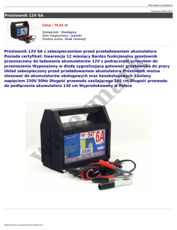 Informacje o produkcie Utworzono 08-03-2017 Prostownik 12V 6A Cena : 75,01 zł Dostępność : Dostępny Stan magazynowy : wysoki Średnia ocena : brak recenzji w at er m ar k Prostownik 12V 6A z zabezpieczeniem przed przeładowaniem akumulatora Posiada certyfikat: Gwarancja 12 miesięcy Bardzo funkcjonalny prostownik przeznaczony do ładowania akumulatorów 12V z podręcznym uchwytem do przenoszenia Wyposażony w diodę sygnalizującą gotowość prostownika do pracy Układ zabezpieczony przed przeładowaniem akumulatora Prostownik można stosować do akumulatorów obsługowych oraz bezobsługowych Zasilany napięciem 230V 50Hz Długość przewodu zasilającego 145 cm Długość przewodu do podłączenia akumulatora 130 cm Wyprodukowany w Polsce Wygenerowano w programie www.oscGold.com