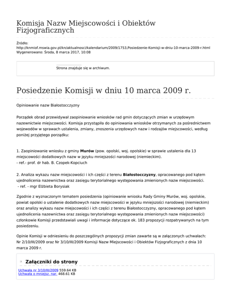 Komisja Nazw Miejscowości i Obiektów Fizjograficznych Źródło: http://knmiof.mswia.gov.pl/kn/aktualnosci/kalendarium/2009/1753,Posiedzenie-Komisji-w-dniu-10-marca-2009-r.html Wygenerowano: Środa, 8 marca 2017, 10:08 Strona znajduje się w archiwum. Posiedzenie Komisji w dniu 10 marca 2009 r. Opiniowanie nazw Białostocczyzny Porządek obrad przewidywał zaopiniowanie wniosków rad gmin dotyczących zmian w urzędowym nazewnictwie miejscowości. Komisja przystąpiła do opiniowania wniosków otrzymanych za pośrednictwem wojewodów w sprawach ustalenia, zmiany, znoszenia urzędowych nazw i rodzajów miejscowości, według poniżej przyjętego porządku: 1. Zaopiniowanie wniosku z gminy Murów (pow. opolski, woj. opolskie) w sprawie ustalenia dla 13 miejscowości dodatkowych nazw w języku mniejszości narodowej (niemieckim). - ref.- prof. dr hab. B. Czopek-Kopciuch 2. Analiza wykazu nazw miejscowości i ich części z terenu Białostocczyzny, opracowanego pod kątem ujednolicenia nazewnictwa oraz zasięgu terytorialnego występowania zmienionych nazw miejscowości. - ref. - mgr Elżbieta Borysiak Zgodnie z wyznaczonym tematem posiedzenia (opiniowanie wniosku Rady Gminy Murów, woj. opolskie, powiat opolski o ustalenie dodatkowych nazw miejscowości w języku mniejszości narodowej (niemieckim) oraz analizy wykazu nazw miejscowości i ich części z terenu Białostocczyzny, opracowanego pod kątem ujednolicenia nazewnictwa oraz zasięgu terytorialnego występowania zmienionych nazw miejscowości) członkowie Komisji przedstawiali uwagi i informacje dotyczące ok. 183 propozycji rozpatrywanych na tym posiedzeniu. Opinie Komisji w odniesieniu do poszczególnych propozycji zmian zawarte są w załączonych uchwałach: Nr 2/10/III/2009 oraz Nr 3/10/III/2009 Komisji Nazw Miejscowości i Obiektów Fizjograficznych z dnia 10 marca 2009 r. Załączniki do strony Uchwała nr 3/10/III/2009 559.64 KB Uchwała o mniejsz. nar. 468.61 KB Starsze wersje dokumentu Wstecz Drukuj Generuj PDF Powiadom znajomego