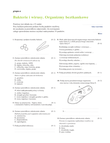 grupa a Bakterie i wirusy. Organizmy beztkankowe Poniższy test składa się z 23 zadań. Przy każdym poleceniu podano liczbę punktów możliwą do uzyskania za prawidłowe odpowiedzi. Za rozwiązanie całego sprawdzianu możesz uzyskać maksymalnie 35 punktów. ............................................ Imię i nazwisko .................... Klasa 1. Rozpoznaj i podpisz kształty bakterii. (0–2) 8. Obok zdań dotyczących negatywnego znaczenia bakterii wpisz literę N, a obok pozytywnego znaczenia wpisz literę P. (0–4) Rozkładają szczątki roślinne i zwierzęce…. Tworzą próchnicę w glebie…. Wywołują epidemie wśród roślin i zwierząt…. ........................... ............................ 2. Zaznacz prawidłowe zakończenie zdania. Ułatwiają trawienie pokarmu (celulozy) (0–1) u zwierząt roślinożernych…. Do chorób wirusowych zalicza się Wywołują choroby zakaźne…. A. grypę, malarię, AIDS. B. anginę, różyczkę, odrę. C. żółtaczkę, ospę wietrzną, grypę. D. czerwonkę, anginę, grypę. Zakwaszają mleko, jogurty, ogórki oraz kapustę…. 3. Zaznacz prawidłowe zakończenie zdania. Wytwarzają różne witaminy…. Powodują psucie się żywności…. (0–1) Sinice to glony zaliczane do królestwa (0–1) . . . . . . . . . . . . . . . . . . . . . . . . . . . . . . . . . . . . . . . . . . . . . . . . . . . . . . . . . . . . . . . . . . .. . . . . . . . . . . . . . . . . . . . . . . . A. grzybów. B. roślin. C. zwierząt. D. bakterii. 4. Zaznacz prawidłowe zakończenie zdania. 9. Podaj przykłady dwóch grzybów jadalnych. 10. Podaj nazwę przedstawionego organizmu (0–3) oraz nazwę i rolę elementu oznaczonego literą X. (0–1) W skład ciała pieczarki polnej wchodzą A. nóżka i kapelusz. B. strzępki grzybni i korzenie. C. trzon, kapelusz i strzępki grzybni w glebie. D. trzon, kapelusz i korzenie. 5. Glony są samożywne. Napisz, który (0–1) z elementów budowy ich komórek o tym decyduje. . . . . . . . . . . . . . . . . . . . . . . . . . . . . . . . . . . . . . . . . . . . . . . . . . . . . . . . . . . . . . . . . . . . . . . . . . . . . . . . . . . . . . . .. . 6. Zaznacz prawidłowe zakończenie zdania. (0–1) X –. . . . . . . . . . . . . . . . . . . . . . . . . . . . . . . . . . . . . . . . . . . . . . . . . . . . . . . . . . . . . . . . . . . . . . . . . Hubiak pospolity pod względem odżywiania jest A. samożywny. B. pasożytem. C. drapieżnikiem. D. saprofagiem. 7. Podaj przykład mikoryzy. . . . . . . . . . . . . . . . . . . . . . . . . . . . . . . . . . . . . . . . . . . . . . . . . . . . . . . . . . . . . . . . . . . . .. . . . . . . . . . . . . . . . . . . . . . . . . . . . . . . . . . . . . . . . . . . . . . . . . . . . . . . . . . . . . . . . . . . . . . . . . . . . . . . .. . . . . . . . . . . . . . 11.Zaznacz prawidłowe zakończenie zdania. Porosty to organizmy najbardziej wrażliwe na obecność w powietrzu (0–1) ........................................................................................ .............................................................. .......................... A. dwutlenku siarki. B. tlenu. C. dwutlenku węgla. D. pary wodnej.80 (0–1) 12. Podkreśl prawidłowe zakończenie zdania. (0–1) 17. Zaznacz prawidłowe zakończenie zdania. Pod pojęciem symbiozy rozumiemy Mikoryza to A. zależność opartą na obustronnych korzyściach organizmów należących do różnych gatunków. B. zależność, w której tylko jeden organizm odnosi korzyści. C. współżycie polegające na odnoszeniu szkód przez jeden organizm. D. pasożytnictwo. A. współżycie grzyba i drzewa oparte na obustronnych korzyściach. B. współżycie zwierząt oparte na obustronnych korzyściach. C. pasożytnictwo. D. współżycie drzewa i zwierzęcia oparte na obustronnych korzyściach. 13. Zaznacz prawidłowe zakończenie zdania. (0–1) Antybiotyki są bakteriobójczymi substancjami wytwarzanymi przez grzyby. Penicylinę uzyskuje się z A. pieczarki. B. pędzlaka. C. pleśniaka. D. purchawki. 14. Przyporządkuj nazwy organizmów do odpowiednich sposobów rozmnażania. (0–3) A – pieczarka B – purchawka C – drożdże D – pantofelek E – ameba 18. Podkreśl nazwy protistów, które wywołują choroby. rzęsistek pochwowy, euglena zielona, (0–1) (0–3) świdrowiec gambijski, pantofelek, zarodziec malaryczny, śluzowce 19. Zaznacz prawidłowe zakończenie zdania. (0–1) Strzępki pleśniaka są A. komórczakiem. B. komórką z jednym jądrem. C. kolonią. D. organizmem wielokomórkowym. 20. Wyjaśnij, dlaczego glony nazywamy organizmami pionierskimi. (0–1) ............................................................... ....................... podział komórki: . . . . . . . . . . . . . . . . . . . . . . . . . . . . . . . . . . . . . . . . . . . . . . . . . . . . . . . . zarodniki: . . . . . . . . . . . . . . . . . . . . . . . . . . . . . . . . . . . . . . . . . . . . . . . . . . . . . . . . . . . . . . . . . . pączkowanie: . . . . . . . . . . . . . . . . . . . . . . . . . . . . . . . . . . . . . . . . . . . . . . . . . . . . . . . . . .. . . . 15.Zaznacz prawidłowe zakończenie zdania. (0–1) Mucha tse-tse bierze udział w roznoszeniu pierwotniaka, który wywołuje A. malarię. B. boreliozę. C. śpiączkę afrykańską. D. zapalenie opon mózgowych. 16. Uzupełnij tabelę dotyczącą przynależności glonów do trzech królestw. (0–3) Królestwo Przedstawiciel Charakterystyczne cechy są bezjądrowe, jednokomórkowe, mają niebieskawe zabarwienie ................................................................................... ... ...................................................................................... 21. Zaznacz prawidłowe zakończenie zdania. (0–1) Podstawą podziału protistów na trzy grupy jest A. sposób rozmnażania i odżywiania się. B. zdolność poruszania się i sposób odżywiania. C. sposób rozmnażania się i środowisko życia. D. budowa ściany k