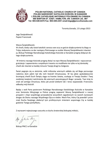 POLISH NATIONAL CATHOLIC CHURCH OF CANADA POLSKI NARODOWY KATOLICKI KOŚCIÓŁ W KANADZIE L’ÉGLISE CATHOLIQUE NATIONALE POLONAISE DU CANADA 880 BARTON ST. EAST, HAMILTON, ON. CANADA L8L 3B7 Tel: 905-549-0470 Fax: 905-549-2351 email:[email protected] Toronto,Kanada, 13 Lutego 2013 Jego Świątobliwość Papież Franciszek Wasza Świątobliwość, W chwili, kiedy cały świat katolicki zwraca swe oczy w geście dziękczynienia ku Bogu w Trójcy Jedynemu za dar następcy Piotrowego w osobie Waszej Świątobliwości również ja, Biskup Polskiego Narodowego Katolickiego Kościoła w Kanadzie pragnę dołączyć do tego dziękczynienia. W imieniu naszego Kościoła pragnę złożyć na ręce Waszej Świątobliwości najszczersze gratulacje i zapewnienie o wspólnym trwaniu na modlitwie nie tylko w tej doniosłej chwili ale również w każdej minucie Twojej drogi ku Golgocie. Świat pogrąża się w ateizmie, setki milionów wiernych oddala się od Boga porzucając rodzinny dom jakim był dla nich Kościół Chrystusowy. W tej jakże apokaliptycznie brzmiącej chwili Duch Święty sięga na kraniec świata, szukając w Twojej Osobie i Twej osobistej świętości natchnienia dla wiernych poszukujących Boga i prawdy. Twe imię to znak od samego Chrystusa, który jak przed wiekami tak i teraz wypowiada :Franciszku odbuduj mój Kościół. Będąc z woli Pana pasterzem Polskiego Narodowego Katolickiego Kościoła w Kanadzie oraz Senioratu Misyjnego w Polsce pragnę zapewnić Waszą Świątobliwość o naszej przyjaźni i chęci wspólnego prowadzenia wszystkich zagubionych na swoich życiowych drogac do Domu naszego Wspólnego Ojca w niebie. Niech Pan, który Cię powołał i przez znak Ducha Świętego obdarzył tym profetycznym imieniem wspomaga Cię w każdej godzinie Twego pontyfikatu. Z wyrazami najwyższego szacunku w duchu braterskiej biskupiej miłości, Biskup PNCC w Kanadzie