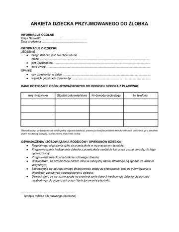 ANKIETA DZIECKA PRZYJMOWANEGO DO ŻŁOBKA