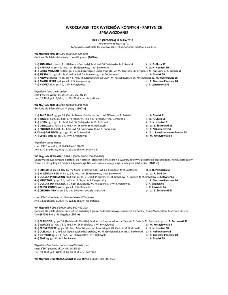 WROCŁAWSKI TOR WYŚCIGÓW KONNYCH - PARTYNICE SPRAWOZDANIE DZIEŃ 1 (NIEDZIELA) 12 MAJA 2013 r. Pochmurno, temp. + 15 oC, tor płaski l. elast (3,0), tor płotowy elast. (3,7), tor przeszkodowy elast (3,4) W1 Nagroda 7000 zł (4000-1600-800-400-200) Gonitwa dla 4-letnich i starszych koni III grupy. (1600 m) 1 (-) SOMALIA kl. kaszt. 4 l., (Belenus – Sun Lady), hod. i wł. SK Golejewko, tr R. Światek k. dż. P. Gluza 57 2 (-) HABANA kl. gn. 4 l., hod. i wł. SK Golejewko, tr M. Borkowski k. dż. N. Hendzel 60 3 (-) LUCKY MOMENT (GB) kl. gn. 6 l., hod. Northgate Lodge Stud Ltd, wł. M. Krzyśków i K. Brygier, tr M. Krzyśków u. K. Brygier 56 4 (-) RIKSZA kl. c. gn. 4 l., hod. i wł. A. i M. Suchorzewscy, tr A. Suchorzewski dż. A. Stasiak 58 5 (-) KREWETKA (GB) kl. sk. gn. 4 l., hod. M. Kaszubowski, wł. „MK” M. Kaszubowski, tr W. Kryszyłowicz dż. M. Kryszyłowicz 58 6 (-) ANGOL SPIRIT wał. gn. 4 l., tr S. Zawgorodny dż. R. Ganczew-Panczew 60 7 (-) NIEMKA kl. c. gn. 4 l., tr W. Kryszyłowicz u. P. Lenartowicz 56 Wycofany Keep the Promise czas 1’45”; w walce; dł. nos-2¼-3½-szy.-2¾-14 zwc. 12,40 zł; pdk. 6,10 zł; trj. 101,70 zł; czw. nie trafiona W2 Nagroda 7000 zł (4000-1600-800-400-200) Gonitwa dla 3-letnich koni III grupy. (1600 m) 1 (-) SANG JANG og. gn. 3 l. (Sorbie Tower - Sorbona), hod. i wł. SK Iwno, tr R. Światek 2 (-) TOLA kl. c. gn. 3 l., hod. E. Porębna, wł. Pejon-E. Porębna, tr inż. E. Porębna 3 (-) NISAN og. c. gn. 3 l., hod. i wł. SK Golejewko, tr M. Borkowski 4 (-) OBIEKCJA kl. kaszt. 3 l., hod. i wł. SK Iwno, tr M. Borkowski 5 (-) POLONIA kl. kaszt. 3 l., hod. i wł. SK Golejewko, tr inż. S. Borkowski 6 (W-wa) GARRISON og. c. gn. 3 l., tr G. Kowalski 7 (-) SEVEN SINS og. gn. 3 l., tr W. Kryszyłowicz dż. A. Stasiak 61 k. dż. P. Gluza 56 k. dż. N. Hendzel 61 pr. dż. B. Żechowski 59 dż. P. Nakonieczny 57 k. dż. L. Reznikowa-Wróblewska 58 dż. M. Kryszyłowicz 59 Wycofany Speed Dance czas: 1’42”, w walce, dł. ½-4¼-1-4¼-10¼-9½ zwc. 8,70 zł; pdk. 37,70 zł; trj. 131,10 zł; czw. 1490,40 zł W3 Nagroda SEXMANA 10 500 zł (6000-2400-1200-600-300) Międzynarodowa gonitwa z płotami dla 4-letnich i starszych koni, które nie wygrały gonitwy z płotami lub przeszkodami. Konie, które zajęły 2 miejsce niosą 3 kg a 3 miejsce 2 kg nadwagi. Nie jest stosowana ulga wagi za kategorie jeździeckie. (3000 m) 1 (-) CORELLI kl. gn. 4 l. (Fly To The Stars - Czarava), hod. i wł. J. i K. Dobosz, tr M. Jodłowski st. u. D. Pastuszka 65 2 (-) KSIĘŻNA ŚNIEGU kl. kaszt. 5 l., hod. i wł. SK Golejewko, tr M. Borkowski pr. dż. R. Benš 70 3 (-) GOLDEN PROFESSION (IRE) wał. sk. gn. 5 l., hod. P. Smyth, wł. M. Krzysków i K. Brygier, tr M. Krzysków u. K. Brygier 69 4 (-) MULTANO og. gn. 4 l., hod. i wł. R. Szpar, tr S. Zawgorodny dż. R. Ganczew-Panczew 66 5 (-) DOLLAR BOY og. kaszt. 5 l., hod. SK Moszna, wł. M. Sopański, tr W. Kryszyłowicz u. A. Chopyk 69 6 (-) TRIPLE CROWN wał. c. gn. 4 l., tr G. Kowalski u. G. Kowalski 66 0 (-) CHICHEN ITZA kl. gn. 5 l., tr R. Świątek - została na starcie pr. dż. B. Żechowski 67 czas: 3’34”, dowolnie, dł. 14-nos-daleko-13½-daleko zwc. 13,80 zł; pdk. 6,70 zł; trj. 128,30 zł; czw. nie trafiona W4 Nagroda 7 000 zł (4000-1600-800-400-200) Gonitwa dla 3-letnich koni czystej krwi arabskiej II grupy, hodowli krajowej, wpisanych do Polskiej Księgi Stadnej Koni Arabskich Czystej Krwi (PASB), które nie biegały. (1600 m) 1 (-) EL MUSZIR og. gn. 3 l. (Fedain – El Madżilis), hod. Artur Nicpoń, wł. Artur Nicpoń i B. Ćwik, tr M. Borkowski pr. dż. B. Żechowski 59 2 (-) WARDEZ og. kaszt. 3 l., hod. i wł. SK Michałów, tr W. Kryszyłowicz dż. M. Kryszyłowicz 58 3 (-) FROM FOREST og. gn. 3 l., hod. Artur Nicpoń, wł. Artur Nicpoń i B. Ćwik, tr M. Borkowski k. dż. N. Hendzel 58 4 (-) OLEK og. s. 3 l., hod. M. Gołębiowska GR Surchów, wł. M. Gołębiowska, tr inż. S. Borkowski dż. P. Nakonieczny 58 5 (-) GOTFRYD og. s. 3 l., hod. i wł. SK Michałów, tr T. Dębowski dż. R. Ganczew-Panczew 60 6 (-) ELAR og. gn. 3 l., tr J. Pochwatka dż. A. Stasiak 58 Wycofany Don Qarie i dodatkowo Piktawia (zw.) czas: 1’59”, pewnie, dł. 2¼-4½-1¼-5½-10 zwc. 10,10 zł; pdk. 48,90 zł; trj. 76,50 zł; czw. 649,90 zł W5 Nagroda OTWARCIA SEZONU 15 750 zł (9000-3600-1800-900-450) Międzynarodowa gonitwa z przeszkodami dla 4-letnich i starszych koni. Za każdą wygraną gonitwę przeszkodową konie niosą 2 kg nadwagi. Konie, które nie wygrały, a zajęły płatne miejsce w gonitwie przeszkodowej, niosą 1 kg nadwagi. Nie jest stosowana ulga wagi za kategorie jeździeckie. (3600 m) 1 (Włochy) DŻORDŻETA kl. kaszt. 4 l. (Roulette - Dżordżia), hod. SK Widzów-K. Tyszko, wł. SK Widzów-A. Tyszko, tr M. Jodłowski u. G. Kowalski 61 2 (-) KRAB (GB) wał. gn. 5 l., hod. M. Kaszubowski, wł. „MK” M. Kaszubowski, tr W. Kryszyłowicz u. A. Chopyk 69 3 (-) TEXEL wał. s. 5 l., hod. SK Iwno, wł. Equus Polska i G. Molska, tr R. Świątek u. P. Gogolewski 70 4 (-) NERONA kl. gn. 5 l., hod. i wł. SK Golejewko, tr M. Borkowski pr. dż. R. Benš 68 5 (-) CZAMARA kl. kaszt. 5 l., hod. G. Kogut, wł. G. Kogut i Ł. Such, tr M. Borkowski pr. dż. B. Żechowski 66 0 (-) PARETO wał. kaszt. 6 l., tr C. Olehla (Czechy) – nie ukończył gonitwy, jeździec spadł dż. J. Myška 70 0 (W-wa) SOPRAN BEST (ITY) og. gn. 4 l., tr K. Rogowski – nie ukończył gonitwy, jeździec spadł st. u. D. Pastuszka 65 Wycofany dodatkowo Hinton (zw.) czas: 4’27”, pewnie, dł. 4¾-13¾-1½-daleko zwc. 39,90 zł; pdk. 86,20 zł; trj. 503,70 zł; czw. i kwn. nie trafione W6 Nagroda 7000 zł (4000-1600-800-400-200) Gonitwa dla 4-letnich i starszych koni III grupy. (1600 m) 1 (-) BOMBONIERKA kl. gn. 6 l. (Tempelwächter – Be My), hod. i wł. A. i M. Suchorzewscy, tr A. Suchorzewski dż. A. Stasiak 58 2 (W-wa) SANTONINA kl. c. gn. 4 l., hod. SK Iwno, wł. A. Pastuszka, tr K. Rogowski k. dż. N. Hendzel 57 3 (W-wa) STA