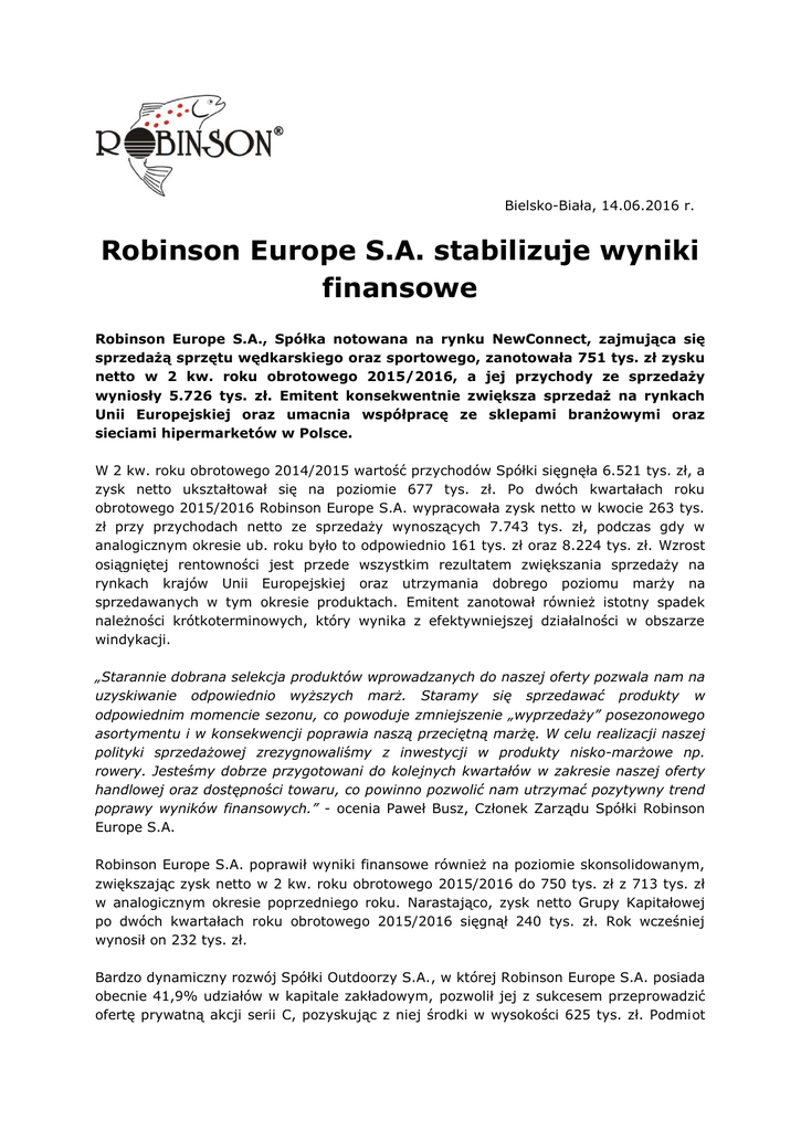 Bielsko-Biała, 14.06.2016 r. Robinson Europe S.A. stabilizuje wyniki finansowe Robinson Europe S.A., Spółka notowana na rynku NewConnect, zajmująca się sprzedażą sprzętu wędkarskiego oraz sportowego, zanotowała 751 tys. zł zysku netto w 2 kw. roku obrotowego 2015/2016, a jej przychody ze sprzedaży wyniosły 5.726 tys. zł. Emitent konsekwentnie zwiększa sprzedaż na rynkach Unii Europejskiej oraz umacnia współpracę ze sklepami branżowymi oraz sieciami hipermarketów w Polsce. W 2 kw. roku obrotowego 2014/2015 wartość przychodów Spółki sięgnęła 6.521 tys. zł, a zysk netto ukształtował się na poziomie 677 tys. zł. Po dwóch kwartałach roku obrotowego 2015/2016 Robinson Europe S.A. wypracowała zysk netto w kwocie 263 tys. zł przy przychodach netto ze sprzedaży wynoszących 7.743 tys. zł, podczas gdy w analogicznym okresie ub. roku było to odpowiednio 161 tys. zł oraz 8.224 tys. zł. Wzrost osiągniętej rentowności jest przede wszystkim rezultatem zwiększania sprzedaży na rynkach krajów Unii Europejskiej oraz utrzymania dobrego poziomu marży na sprzedawanych w tym okresie produktach. Emitent zanotował również istotny spadek należności krótkoterminowych, który wynika z efektywniejszej działalności w obszarze windykacji. „Starannie dobrana selekcja produktów wprowadzanych do naszej oferty pozwala nam na uzyskiwanie odpowiednio wyższych marż. Staramy się sprzedawać produkty w odpowiednim momencie sezonu, co powoduje zmniejszenie „wyprzedaży” posezonowego asortymentu i w konsekwencji poprawia naszą przeciętną marżę. W celu realizacji naszej polityki sprzedażowej zrezygnowaliśmy z inwestycji w produkty nisko-marżowe np. rowery. Jesteśmy dobrze przygotowani do kolejnych kwartałów w zakresie naszej oferty handlowej oraz dostępności towaru, co powinno pozwolić nam utrzymać pozytywny trend poprawy wyników finansowych.” - ocenia Paweł Busz, Członek Zarządu Spółki Robinson Europe S.A. Robinson Europe S.A. poprawił wyniki finansowe również na poziomie skonsolidowanym, zwiększając zysk netto w 2 kw. roku obrotowego 2015/2016 do 750 tys. zł z 713 tys. zł w analogicznym okresie poprzedniego roku. Narastająco, zysk netto Grupy Kapitałowej po dwóch kwartałach roku obrotowego 2015/2016 sięgnął 240 tys. zł. Rok wcześniej wynosił on 232 tys. zł. Bardzo dynamiczny rozwój Spółki Outdoorzy S.A., w której Robinson Europe S.A. posiada obecnie 41,9% udziałów w kapitale zakładowym, pozwolił jej z sukcesem przeprowadzić ofertę prywatną akcji serii C, pozyskując z niej środki w wysokości 625 tys. zł. Podmiot ten działa w branży e-commerce i prowadzi działalność handlową obejmującą sprzedaż odzieży oraz sprzętu sportowo-turystycznego w formie sklepu internetowego outdoorzy.pl. Pozyskany przez Spółkę kapitał zostanie przeznaczony m.in. na zwiększenie zapasów magazynowych, co pozwoli na dalszy wzrost obrotów oraz osiąganie wyższych rentowności, umacniając tym samym jego pozycję rynkową. Outdoorzy S.A. planują zadebiutować w tym roku na rynku NewConnect. „Bardzo dobrze oceniamy rozwój Spółki Outdoorzy S.A. i jesteśmy przekonani, że środki pozyskane przez nią z emisji akcji serii C pozwolą jej kontynuować realizację założeń strategii rozwoju. Branża e-commerce w Polsce notuje bardzo wysokie tempo wzrostu, więc otoczenie rynkowe stwarza Spółce bardzo duże szanse na odniesienie sukcesu. Debiut tego podmiotu na rynku NewConnect z pewnością przyczyni się również do zwiększenia rozpoznawalności sklepu internetowego, za pośrednictwem którego prowadzi on sprzedaż odzieży oraz sprzętu sportowego. Upublicznienie na alternatywnym rynku wpłynie także pozytywnie na wyniki finansowe Robinson Europe S.A.” - podsumowuje Paweł Busz. Łączna wartość obrotów akcjami Robinson Europe S.A. w okresie luty-kwiecień 2016 r. wyniosła blisko 586 tys. zł, a wolumen obrotu przekroczył 57 tys. szt. Prognoza finansowa Spółki przewiduje wypracowanie w roku obrotowym 2015/2016 zysku na poziomie EBITDA w wysokości 1,35 mln zł. W roku obrotowym 2016/2017 prognozowany przez Emitenta zysk na poziomie EBITDA ma wynieść 2,25 mln zł. Spółka Robinson Europe S.A. jest notowana na rynku NewConnect od czerwca 2011 r. Głównym przedmiotem jej działalności jest sprzedaż sprzętu wędkarskiego oraz sportowego. Historia przedsiębiorstwa sięga 1991 r., kiedy to obecni Członkowie Zarządu założyli firmę „BIS”, która była znanym podmiotem w branży wędkarskiej. *** Kontakt: Artur Górski Relacje Inwestorskie/Media [email protected] tel. +48 501-215-243