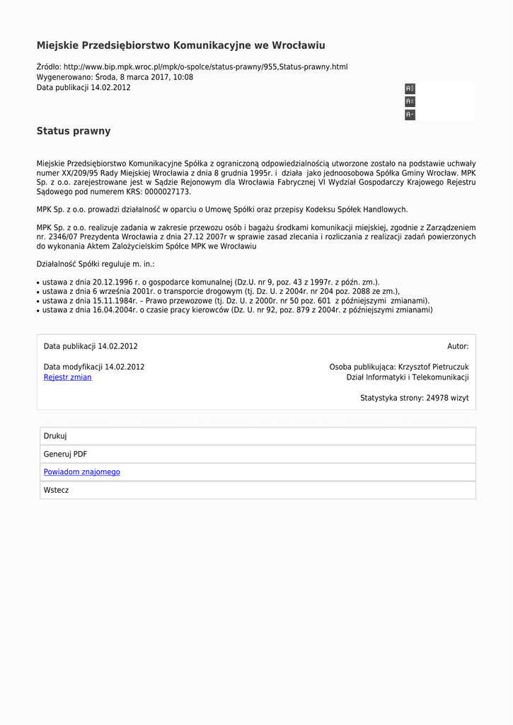 Miejskie Przedsiębiorstwo Komunikacyjne we Wrocławiu Status