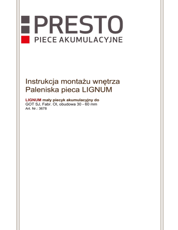 Instrukcja montażu wnętrza Paleniska pieca LIGNUM LIGNUM mały piecyk akumulacyjny do GOT SJ, Fabr. OI, obudowa 30 - 60 mm Art. Nr.: 3678 LIGNUM Mały piecyk akumulacyjny Wymagania Przy zakładaniu paleniska należy zwrócić uwagę na: - odpowiednie zarządzenia, - zalecenia pożarnicze, - przepisy miejscowe, - narodowe i europejskie normy. Znamionowa moc cieplna pieca powinna być według normy DIN EN 12831 odpowiednio dopasowana do zapotrzebowania na ciepło służące do ogrzania pomieszczenia mieszkalnego. Przed postawieniem pieca potrzeba wpierw ustalić z odpowiednim kominiarzem warunki panujące w zakładanym pomieszczeniu, zaopatrzenie w powietrze niezbędne do spalania i odprowadzenie spalin. Przy podłączaniu pieca do komina następuje wyśrednicowanie urządzenia spalinowego według DIN EN 13384. Temperatura spalin: Strumień spalin: Konieczne ciśnienie: CO2-zawartość: 220 °C 18,4 g/s 13 Pa 6,34 % Producent urządzenia jak i użytkownik jest odpowiedzialny za dostarczenie do paleniska wystarczającej ilości powietrza potrzebnego do spalania. Zapotrzebowanie na powietrze do spalania: 47 m³/h. Należy zauważyć, że wejście powietrza służącego do spalania nie jest zamknięte. W miejscu instalacji pieca szczególnie trzeba zwrócić uwagę na okap oraz inne urządzenia odbierającego powietrze. Wytwarza ono podciśnienie w pomieszczeniu gdzie odbywa się instalacja pieca. Może to prowadzić do zaburzeń w spalaniu. Przez wchodzące spaliny powstaje zagrożenie dla życia i zdrowia mieszkańców. Zwróć uwagę na podłogę czy jest wystarczająca mocna aby udźwignąć stawiany piec, Jeżeli podłoga jest zbyt słaba trzeba przed postawieniem pieca koniecznie jest dodanie płyty rozkładającej ciężar. Waga: ·ca. 500 kg Pojedyncze paleniska akumulacyjne niezależne od powietrza w pomieszczeniu mieszkalnym musi być usadowione na podłożu bezwietrznym i stabilnym. Nie może stać na podłodze z ogrzewaniem podłogowym lub pływającym jastrychu. Po postawieniu paleniska akumulacyjnego w niezależnym od powietrza pomieszczeniu mieszkalnym (palenisko szamotowe i obudowa) należy przeprowadzić próbę szczelności przy nadciśnieniu 10 Pa. Przy mechanicznym obciążeniu drzwiczek paleniskowych 5 ciężkimi polanami należy powtórzyć próbę szczelności. Wyciek nie może przekroczyć 1,22 m³/h. W przeciwnym wypadku należy zlokalizować wyciek i usunąć. www.presto-kominy.pl Strona 2 z 11 LIGNUM Mały piecyk akumulacyjny Numer art.: 3678 LIGNUM OI / 60 / F / P www.presto-kominy.pl Strona 3 z 11 LIGNUM Mały piecyk akumulacyjny www.presto-kominy.pl Strona 4 z 11 LIGNUM Mały piecyk akumulacyjny Art. Nr.: 3678 LIGNUM OI / 60 / F / P Lista elementów: przyciety materiał Poz. Nr. Ilość sztuk Funkcja Oznaczenie Wymiar w mm 50 1 Cokół – płyta izolacyjna Płyta izolacyjna Vermiculite 450x480x 60 51 2 Nakład 1 warstwy ze szczeliną Płyta z podwójnym wpustem 370x124x 60 3 1 Ściana tylnia warstwa 1 Płyta podwójnego wpustu 322x124x 60 52 1 Podłoga paleniska a Płyta izolacyjna Vermiculite 314x320x 60 53 1 Podłoga paleniska b Płyta szamotowa HBO+ 320x130x 30 6 1 Podłoga paleniska c Płyta szamotowa HBO+ 320x150x 30 29 1 Próg drzwiowy Płyta szamotowa HBO+ 320x 90x 30 54 2 Ściana boczna warstwa 2 Płyta z podwójnym wpustem 306x250x 60 8 1 Ściana tylnia warstwa 2 Płyta z podwójnym wpustem 450x250x 60 55 2 Ąciana boczna warstwa 3 Płyta z podwójnym wpustem 370x200x 60 10 1 Ściana tylnia warstwa 3 Płyta z podwójnym wpustem 322x200x 60 56 2 Nakładka od góry warstwa 4 Płyta z podwójnym wpustem 306x124x 60 12 1 Ściana tylnia warstwa 4 Płyta z podwójnym wpustem 450x124x 60 33 1 Przykrycie paleniska Płyta paleniskowa Vermiculite 325x 68x 25 34 1 Przykrycie paleniska Płyta szamotowa HBO+ 325x 92x 30 35 1 Nośnik ciągu z przodu z wycięciem Płyta szamotowa HBO+ 450x157x 40 36 2 Nośnik ciągu z boku z wycięciem Płyta z podwójnym wpustem 450x157x 60 37 1 Nośnik ciągu z tyłu Płyta szamotowa HBO+ 322x157x 40 38 2 Ściana odcinająca ciąg Płyta szamotowa HBO+ 322x187x 40 39 1 Pustak ciągu OI 4 Pustak ciągu OI 4 HSM 410x220x170 40 2 Pustak ciągu OI 1+3 Pustak ciągu OI 1+3 HSM 357x220x170 41 1 Pustak ciągu OI 2 Pustak ciągu OI 2 HSM 357x220x170 42 2 Ściana boczna pierwszego ciągu Płyta z podwójnym wpustem 357x100x 60 18 1 Ściana działowa ciąg Płyta szamotowa HBO+ 180x114x 40 19 1 Przykrycie ciągu Płyta szamotowa HBO+ 180x157x 40 20a 1 Częściowa przykrywka Płyta szamotowa HBO+ 450x223x 50 20b 1 Częściowa przykrywka Płyta szamotowa HBO+ 275x223x 50 21 2 Ściana do przykrywania ciągu Płyta szamotowa HSM 450x160x 30 22 1 Ściana do przykrywania ciągu Płyta szamotowa HSM 382x160x 30 23 2 Obudowa Płyta szamotowa HSM 300x160x 30 24 2 Ściana do przykrywania ciągu od tyłu Płyta szamotowa HSM 108x160x 30 25 2 Przykrywka od wyczystki Płyta szamotowa HSM 450x223x 30 60 1 Przykrywka wyczystkowa HBO+ Ø120 11 Pióro Pióro 250x 20x 15 www.presto-kominy.pl Strona 5 z 11 LIGNUM Mały piecyk akumulacyjny Palenisko buduje się w środku wewnętrznej zabudowy piecyka akumulacyjnego. Zabudowa ta jest składową częścią z drzwiczkami paleniska SJ, Fabr. Ofen Innovativ z lub bez sterowania powietrza dostarczanego do paleniska i obudowy o grubości max. 60 mm. Płyty szamotowe są docięte na wymiar. Wymiary płyt są przewidziane do fugi o grubości 4 mm. Przy budowie obudowy dookoła zabudowy wewnętrznej trzeba zwrócić szczególną uwagę na szczelność pomiędzy obudową a drzwiczkami paleniska co gwarantuje zachowanie funkcjonalność piecyka akumulacyjnego. Przy tym też powinny być zamknięte okrągłe otwarcia w drzwiczkach frontowych. Polecamy Wolfshöher Biolösliches Fasermaterial. Szczególnie przy wyprowadzeniu paleniska niezależnego od powietrza w pomieszczeniu mieszkalnym powinno się zwrócić uwagę na szczelność przy budowie obudowy tak, aby były zachowane wymagania co do szczelności. Następnie zalec
