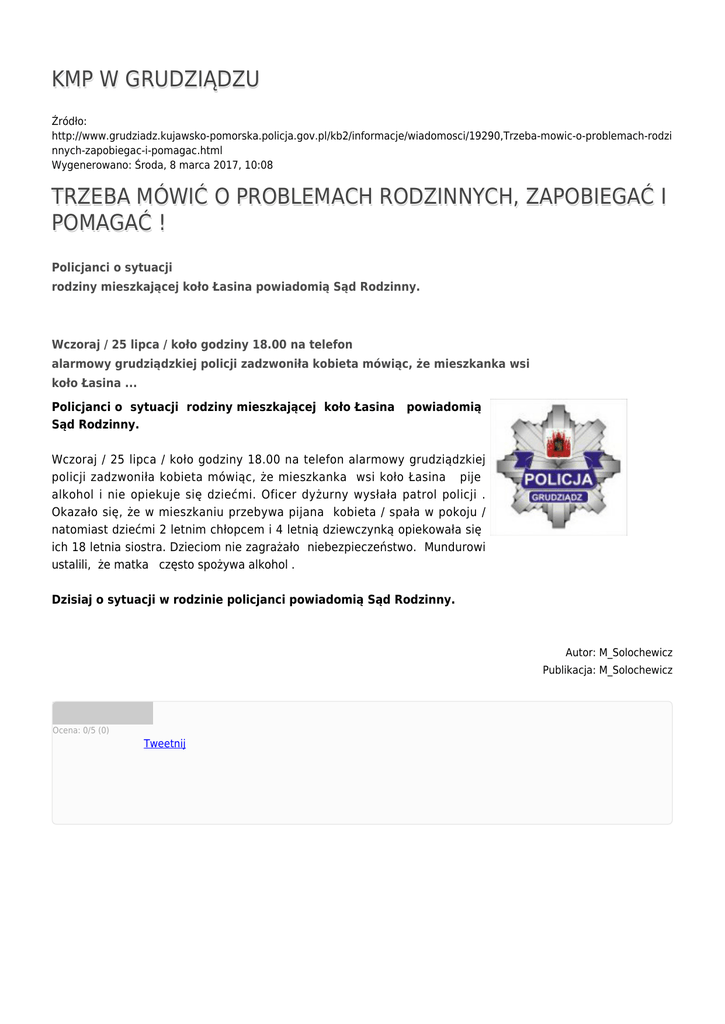 KMP W GRUDZIĄDZU Źródło: http://www.grudziadz.kujawsko-pomorska.policja.gov.pl/kb2/informacje/wiadomosci/19290,Trzeba-mowic-o-problemach-rodzi nnych-zapobiegac-i-pomagac.html Wygenerowano: Środa, 8 marca 2017, 10:08 TRZEBA MÓWIĆ O PROBLEMACH RODZINNYCH, ZAPOBIEGAĆ I POMAGAĆ ! Policjanci o sytuacji rodziny mieszkającej koło Łasina powiadomią Sąd Rodzinny. Wczoraj / 25 lipca / koło godziny 18.00 na telefon alarmowy grudziądzkiej policji zadzwoniła kobieta mówiąc, że mieszkanka wsi koło Łasina ... Policjanci o sytuacji rodziny mieszkającej koło Łasina powiadomią Sąd Rodzinny. Wczoraj / 25 lipca / koło godziny 18.00 na telefon alarmowy grudziądzkiej policji zadzwoniła kobieta mówiąc, że mieszkanka wsi koło Łasina pije alkohol i nie opiekuje się dziećmi. Oficer dyżurny wysłała patrol policji . Okazało się, że w mieszkaniu przebywa pijana kobieta / spała w pokoju / natomiast dziećmi 2 letnim chłopcem i 4 letnią dziewczynką opiekowała się ich 18 letnia siostra. Dzieciom nie zagrażało niebezpieczeństwo. Mundurowi ustalili, że matka często spożywa alkohol . Dzisiaj o sytuacji w rodzinie policjanci powiadomią Sąd Rodzinny. Autor: M_Solochewicz Publikacja: M_Solochewicz Ocena: 0/5 (0) Tweetnij