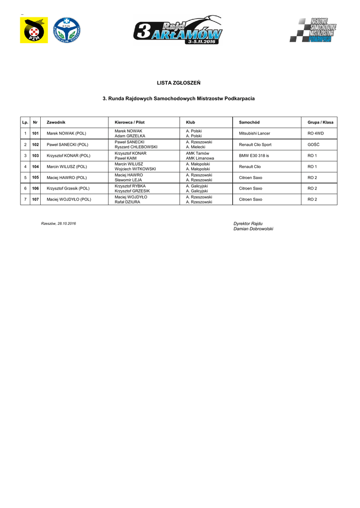 lista zgłoszeń - 3. Rajd Arłamów