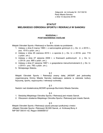 Załącznik do Uchwały Nr XV/130/16 Rady Miasta Sanoka z dnia 12 stycznia 2016r. STATUT MIEJSKIEGO OŚRODKA SPORTU I REKRACJI W SANOKU ROZDZIAŁ I POSTANOWIENIA OGÓLNE §1 Miejski Ośrodek Sportu i Rekreacji w Sanoku działa na podstawie: 1. Ustawy z dnia 8 marca 1990 r. o samorządzie gminnym (t. j. Dz. U. z 2015 r., poz. 1515 z późn. zm.). 2. Ustawy z dnia 25 czerwca 2010 r. o sporcie (t. j. Dz. U. z 2014r. poz. 715 z późn. zm.) 3. Ustawy z dnia 27 sierpnia 2009 r. o finansach publicznych (t. j. Dz. U. z 2013r. poz. 885 z późn. zm.). 4. Ustawy z dnia 21 sierpnia 1997 r. o gospodarce nieruchomościami (t. j. Dz. U. z 2015 r. poz. 782 z późn. zm.). 5. Niniejszego Statutu. §2 Miejski Ośrodek Sportu i Rekreacji zwany dalej „MOSiR” jest jednostkę organizacyjną Gminy Miasta Sanoka realizująca zadania w zakresie kultury fizycznej, sportu, wypoczynku i rekreacji ruchowej. §3 Nadzór nad działalnością MOSiR sprawuje Burmistrz Miasta Sanoka. §4 1. Siedzibą Miejskiego Ośrodka Sportu i Rekreacji jest miasto Sanok. 2. Obszarem działania Miejskiego Ośrodka Sportu i Rekreacji jest miasto Sanok. §5 Miejski Ośrodek Sportu i Rekreacji używa pieczęci podłużnej o treści: „Miejski Ośrodek Sportu i Rekreacji 38-500 Sanok, ul. Królowej Bony 4 NIP 687 000 61 42, Regon 000659012” ROZDZIAŁ II CELE I ZADANIA MOSIR §6 1. Przedmiotem działalności MOSiR jest: a) organizowanie oraz świadczenie usług w dziedzinie kultury fizycznej, sportu, turystyki i wypoczynku ze szczególnym uwzględnieniem udziału dzieci i młodzieży szkolnej, b) organizowanie zajęć i imprez sportowo-rekreacyjnych, c) propagowanie i realizacja wszelkich usług z zakresu sportu i masowej kultury fizycznej przy współpracy z klubami sportowymi i innymi organizacjami kultury fizycznej i sportu, d) gospodarowanie placami miejskimi poza drogami publicznymi przekazanymi przez Gminę w celu zabezpieczenia miejsc postojowych dla szlaków turystyczno-rekreacyjnych, tras spacerowych i masowych imprez sportowo – rekreacyjnych. 2. W szczególności do zadań MOSiR należy: a) prowadzenie działalności w zakresie sportu i rekreacji ruchowej, b) tworzenie warunków do uprawiania sportu i rekreacji ruchowej, c) organizowanie imprez rekreacyjnych, sportowych i kulturalnych, d) prowadzenie działalności wychowawczej i popularyzatorskiej w zakresie kultury fizycznej i rekreacji ruchowej, e) organizowanie i prowadzenie działalności sportowo-rekreacyjnej dla dzieci i młodzieży szkolnej, f) prowadzenie działalności marketingowej i reklamowej, g) administrowanie i eksploatacja obiektami sportowymi, h) oddawanie w najem, dzierżawę obiektów oraz pomieszczeń MOSiR w celu pozyskania środków na działalność statutową, i) zapewnienie kadry trenersko – instruktorskiej do prowadzenia zajęć sportowych i rekreacyjnych ze szczególnym uwzględnieniem nauki i doskonalenia pływania, j) prowadzenie zajęć sportowych i rekreacyjnych oraz z zakresu rehabilitacji ruchowej stosownie do potrzeb i zainteresowania mieszkańców, k) zapewnienie właściwej eksploatacji i konserwacji obiektów sportowych i rekreacyjno – wypoczynkowych oraz unowocześnianie i rozbudowa własnej bazy sportowo – rekreacyjnej. 3. MOSiR może świadczyć usługi (prowadzić działalność gospodarczą) w zakresie zgodnym z jego działalnością statutową, nie wykraczającą poza zadania o charakterze użyteczności publicznej. ROZDZIAŁ III ORGANIZACJA I ZARZĄDZANIE §7 1. W skład Miejskiego Ośrodka Sportu i Rekreacji wchodzą: a) hala widowiskowo-sportowa, ul. Królowej Bony 4, Sanok 38-500, b) kompleks basenów, ul. Królowej Bony 4, Sanok 38-500, c) tor lodowy, ul. Królowej Bony 4, Sanok 38-500, d) dom Sportowca, ul. Królowej Bony 4, Sanok 38-500, e) stadion sportowy, ul. Żwirki i Wigury 10, Sanok 38-500, f) kompleks kortów tenisowych, ul Mickiewicza 17, Sanok 38-500, g) kompleks kortów tenisowych, ul. Królowej Bony 4, Sanok 38-500. 2. Wszystkie obiekty usytuowane przy ul. Królowej Bony 4, tworzą ściśle ze sobą powiązany kompleks obiektów sportowych. Dom Sportowca świadczy usługi między innymi gastronomiczne, noclegowe oraz odnowy biologicznej dla osób korzystających z ww. obiektów sportowych. §8 1. MOSiR kieruje Dyrektor. 2. Dyrektora zatrudnia Burmistrz Miasta Sanoka. 3. Czynności w sprawach z zakresu prawa pracy wobec Dyrektora dokonuje Burmistrz Miasta Sanoka. §9 1. Dyrektor upoważniony jest do składania oświadczeń woli jednoosobowo w zakresie statutowej działalności MOSiR na podstawie udzielonego pełnomocnictwa przez Burmistrza Miasta Sanoka. 2. Do podstawowych zadań Dyrektora należy w szczególności: a) reprezentowanie MOSiR na zewnątrz, b) zarządzanie MOSiR-em, c) wykonywanie czynności w sprawach prawa pracy w stosunku do pracowników zatrudnionych w MOSiR. 3. Wewnętrzną strukturę organizacyjną Miejskiego Ośrodka Sportu i Rekreacji, schemat organizacyjny, zadania poszczególnych komórek określa regulamin organizacyjny sporządzony przez Dyrektora MOSiR i zatwierdzony przez Burmistrza Miasta Sanoka. ROZDZIAŁ IV MAJĄTEK I GOSPODARKA FINANSOWA § 10 Miejski Ośrodek Sportu i Rekreacji gospodaruje samodzielnie przekazywanymi w zarząd nieruchomościami i majątkiem Gminy Miasta Sanoka. § 11 1. Podstawą gospodarki finansowej MOSiR-u jest plan dochodów i wydatków, zwany dalej „planem finansowym jednostki budżetowej”. 2. Plan finansowy opracowywany jest zgodnie z ustawą o finansach publicznych. 3. MOSiR prowadzi rachunkowość i przechowuje dokumentację zgodnie z zasadami określonymi w odrębnych przepisach. § 12 Zasady wynagradzania pracowników MOSiR określa Rozporządzenie Rady Ministrów z dnia 18 marca 2009 r. w sprawie wynagradzania pracowników samorządowych zatrudnionych w jednostkach organizacyjnych jednostek samorządu terytorialnego (t. j. - Dz. U. z 2014r. poz. 1786). 1. 2. 3. 4. § 13 MOSiR jest jednostką budżetową Gminy Miasta Sanoka, która pokrywa s