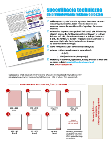 specyfikacja techniczna do przygotowania reklam/ogłoszeń reklamy muszą mieć rozmiar zgodny z formatem zarezerwowanej powierzchni. Jeżeli reklama zawiera się w ramce to rozmiar ramki musi być zgodny z formatem modułu; minimalna dopuszczalna grubość linii to 0,3 pkt. Minimalny stopień pisma, dla fontów jednoelementowych w jednym kolorze to 7 pkt., dwuelementowych w jednym kolorze – 8 pkt., dla fontów w dwóch i więcej kolorach wartości te wynoszą: 8 pkt. dla fontu jednoelementowego i 9 dla dwuelementowego; użyte fonty muszą być zamienione na krzywe; gotowe reklamy przyjmowane są w plikach: o cdr (X3), o JPG (z minimalną kompresją) materiały reklamowe/ogłoszenia, należy przesłać (e-mail’em) na adres redakcji: [email protected] max. do 30 listopada br. Ogłoszenia drobne (niekomercyjne) o charakterze sąsiedzkim publikujemy nieodpłatnie. Maksymalna długość tekstu – 100 znaków (ze spacjami). POWIERZCHNIE REKLAMOWE/OGŁOSZENIOWE 3 2 190 x 140 (mm) 190 x 270 (mm) 5 6 4 60 x 270 (mm) 7 125 x 125 (mm) 8 Artykuł sponsorowany /na całą stronę/ 190 x 40 (mm) 60 x 100 (mm) 90 x 30 (mm) możliwość przedstawienia swojej firmy, przedsiębiorstwa, zaprezentowania oferowane usługi czy produktu. Naprawdę dobre ceny zapraszamy do bezpośrednich uzgodnień 1