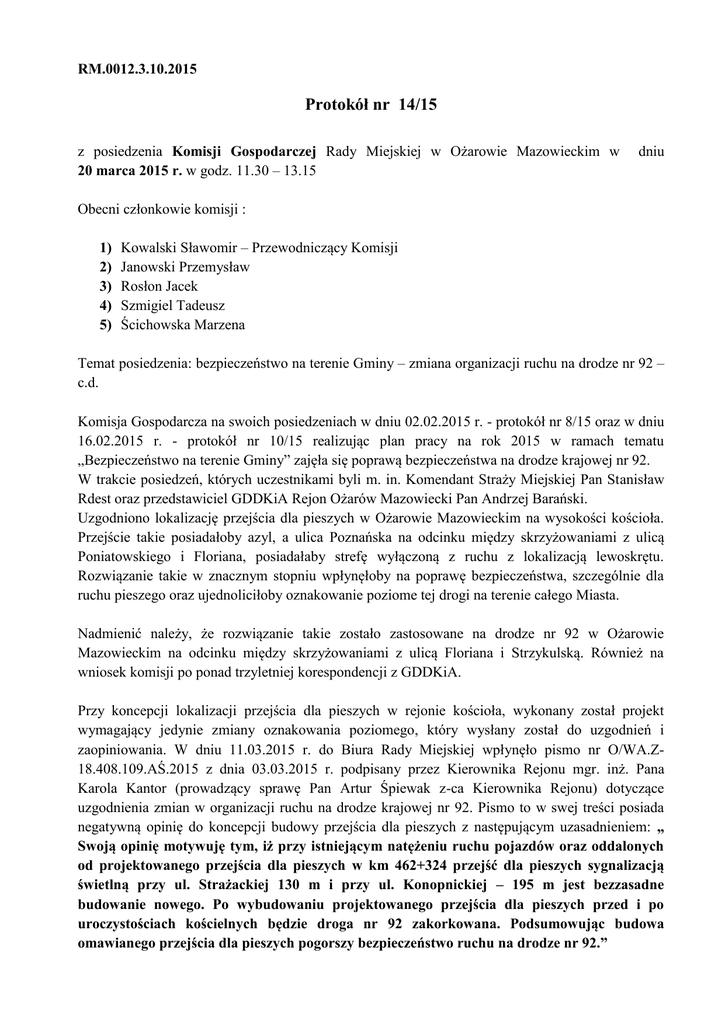 RM.0012.3.10.2015 Protokół nr 14/15 z posiedzenia Komisji Gospodarczej Rady Miejskiej w Ożarowie Mazowieckim w 20 marca 2015 r. w godz. 11.30 – 13.15 dniu Obecni członkowie komisji : 1) 2) 3) 4) 5) Kowalski Sławomir – Przewodniczący Komisji Janowski Przemysław Rosłon Jacek Szmigiel Tadeusz Ścichowska Marzena Temat posiedzenia: bezpieczeństwo na terenie Gminy – zmiana organizacji ruchu na drodze nr 92 – c.d. Komisja Gospodarcza na swoich posiedzeniach w dniu 02.02.2015 r. - protokół nr 8/15 oraz w dniu 16.02.2015 r. - protokół nr 10/15 realizując plan pracy na rok 2015 w ramach tematu „Bezpieczeństwo na terenie Gminy” zajęła się poprawą bezpieczeństwa na drodze krajowej nr 92. W trakcie posiedzeń, których uczestnikami byli m. in. Komendant Straży Miejskiej Pan Stanisław Rdest oraz przedstawiciel GDDKiA Rejon Ożarów Mazowiecki Pan Andrzej Barański. Uzgodniono lokalizację przejścia dla pieszych w Ożarowie Mazowieckim na wysokości kościoła. Przejście takie posiadałoby azyl, a ulica Poznańska na odcinku między skrzyżowaniami z ulicą Poniatowskiego i Floriana, posiadałaby strefę wyłączoną z ruchu z lokalizacją lewoskrętu. Rozwiązanie takie w znacznym stopniu wpłynęłoby na poprawę bezpieczeństwa, szczególnie dla ruchu pieszego oraz ujednoliciłoby oznakowanie poziome tej drogi na terenie całego Miasta. Nadmienić należy, że rozwiązanie takie zostało zastosowane na drodze nr 92 w Ożarowie Mazowieckim na odcinku między skrzyżowaniami z ulicą Floriana i Strzykulską. Również na wniosek komisji po ponad trzyletniej korespondencji z GDDKiA. Przy koncepcji lokalizacji przejścia dla pieszych w rejonie kościoła, wykonany został projekt wymagający jedynie zmiany oznakowania poziomego, który wysłany został do uzgodnień i zaopiniowania. W dniu 11.03.2015 r. do Biura Rady Miejskiej wpłynęło pismo nr O/WA.Z18.408.109.AŚ.2015 z dnia 03.03.2015 r. podpisany przez Kierownika Rejonu mgr. inż. Pana Karola Kantor (prowadzący sprawę Pan Artur Śpiewak z-ca Kierownika Rejonu) dotyczące uzgodnienia zmian w organizacji ruchu na drodze krajowej nr 92. Pismo to w swej treści posiada negatywną opinię do koncepcji budowy przejścia dla pieszych z następującym uzasadnieniem: „ Swoją opinię motywuję tym, iż przy istniejącym natężeniu ruchu pojazdów oraz oddalonych od projektowanego przejścia dla pieszych w km 462+324 przejść dla pieszych sygnalizacją świetlną przy ul. Strażackiej 130 m i przy ul. Konopnickiej – 195 m jest bezzasadne budowanie nowego. Po wybudowaniu projektowanego przejścia dla pieszych przed i po uroczystościach kościelnych będzie droga nr 92 zakorkowana. Podsumowując budowa omawianego przejścia dla pieszych pogorszy bezpieczeństwo ruchu na drodze nr 92.” Zdaniem komisji argumenty podane w treści uzasadnienia odmowy są niezrozumiałe i co najmniej mijające się z prawdą. Jeżeli zdaniem autora pisma, lokalizacja przejścia dla pieszych pogorszy bezpieczeństwo ruchu doprowadzając do zakorkowania drogi krajowej, to może przestańmy budować przejścia, argumentując tę decyzję utrudnieniem w ruchu kołowym. Miejsce proponowane do lokalizacji przejścia jest między kościołem a dużym osiedlem mieszkaniowym wielorodzinnym. Większość zamieszkujących tam osób jest w podeszłym wieku albo posiada małe dzieci i to właśnie w trosce o ich bezpieczeństwo, w odpowiedzi na ich liczne wnioski oraz wnioski zarządów osiedli, komisja wystąpiła z taką propozycją. We wspomnianym miejscu piesi przechodzili, przechodzą i przechodzić będą narażając się na niebezpieczeństwo. W miejscu tym brak jest barierek zabezpieczających z uwagi na bezpośrednie sąsiedztwo lokalizacji zatoki autobusowej. W oparciu o ustawę prawo o ruchu drogowym, piesi mogą w tym miejscu swobodnie przechodzić nie łąmiąc przepisów, gdyż jak słusznie nadmienił autor pisma, najbliższe przejścia oznakowane sygnalizacją świetlną znajdują się w odległościach 130 m od ul. Strażackiej i 195 m od ul. Konopnickiej, a więc w odległości powyżej 100 m. Błędny również zdaniem komisji jest argument zakorkowania drogi przy uroczystościach kościelnych. Należy w tym miejscu zadać pytanie jakie uroczystości kościelne autor miał na myśli, jeśli te organizowane w niedziele i święta, to akurat w tych dniach natężenie ruchu kołowego jest o wiele mniejsze niż w dni powszednie. Jeżeli wybudowanie przejścia dla pieszych z azylem pogorszy bezpieczeństwo, to może należy rozważyć budowę w tym miejscu przejścia z sygnalizacją świetlną tworząc tzw. „zieloną falę”, która usprawni ruch kołowy jak i pieszy na tym odcinku. Członkowie komisji przypominają, że proponowana lokalizacja przejścia kierowana jest potrzebą zapewnienia bezpieczeństwa lokalnej społeczności, której interesy reprezentowane są przez Radę Miejską za pośrednictwem odpowiednich komisji przy udziale Burmistrza. Dlatego po raz kolejny komisja występuje do Burmistrza o podjęcie zdecydowanych działań skutkujących uzyskaniem pozytywnych uzgodnień z GDDKiA i pozytywnej opinii WRD KSP (Wydział Ruchu Drogowego Komendy Stołecznej Policji) w sprawie budowie nowego przejścia dla pieszych we wspomnianym przez komisję miejscu. Załącznikiem do protokołu jest lista radnych Rady Miejskiej w Ożarowie Mazowieckim popierających inicjatywę budowy przejścia dla pieszych. Inicjatywa posiada również ogromne poparcie lokalnej społeczności. Na tym protokół zakończono i po przeczytaniu podpisano. Członkowie Komisji Gospodarczej: 1) Kowalski Sławomir ………………………………………………. 2) Janowski Przemysław …………………………………………….. 3) Rosłon Jacek ……………………………………………………… 4) Szmigiel Tadeusz…...…………………………………………….. 5) Ścichowska Marzena………………………