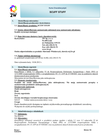 Karta Charakterystyki SCUFF STUFF 1. Identyfikacja mieszaniny: Identyfikacja producenta i dystrybutora 1.1. Identyfikator produktu: SCUFF STUFF 1.2. Istotne zidentyfikowane zastosowanie substancji oraz zastosowanie odradzane: Środek czyszcząco-matujący 1.3. Dane dotyczące dostawcy karty charakterystyki: Dystrybutor: 2W Sp. z o. o. 93-490 Łódź ul. Pabianicka 119/131 Tel. (42) 250-53-76 Fax: (42) 250-53-79 www.2w.pl Osoba odpowiedzialna za produkt: Sławomir Włodarczyk, [email protected] 1.4. Numer telefonu alarmowego (w godzinach urzędowania od 8.00 do 16.00): (42) 250-53-76 Data wykonania karty: 18.06.2012 r. 2. Identyfikacja zagrożeń 2.1. Klasyfikacja mieszaniny: Klasyfikacja z tabelą 3.2 załącznika VI do Rozporządzenia Parlamentu Europejskiego i Rady (WE) nr 1272/2008 (rozporządzenie GHS) z uwzględnieniem 30 i 31 ATP do 67/548/EEC oraz na podstawie danych dostarczonych przez producenta: Mieszanina nie jest klasyfikowana jako niebezpieczna 2.2. Elementy oznakowania: Produkt nie został zaklasyfikowany, jako niebezpieczny. Nie mają zastosowanie przepisy o etykietowaniu produktów niebezpiecznych. Oznakowanie opakowań: Znaki ostrzegawcze: Brak Zwroty zagrożenia: Brak Zwroty określające warunki bezpiecznego stosowania: S24/25 Unikać zanieczyszczenia skóry i oczy Uwagi: Karta charakterystyki dostępna na żądanie użytkownika prowadzącego działalność zawodową. Wyłącznie do użytku profesjonalnego. 3. Skład/informacja o składnikach 3.1. Substancje: Nie dotyczy. 3.2. Mieszaniny: Klasyfikację substancji zawartych w produkcie podano zgodnie z tabelą 3.1 oraz 3.2 załącznika VI do Rozporządzenia Parlamentu Europejskiego i Rady (WE) nr 1272/2008 (rozporządzenie GHS) z uwzględnieniem 30 i 31 ATP do 67/548/EEC oraz na podstawie danych dostarczonych przez producenta. Wersja I 18.06.2012 Strona 1/8 Karta Charakterystyki SCUFF STUFF Nie zawiera substancji klasyfikowanych jako niebezpieczne. 4. Środki pierwszej pomocy 4.1. Opis środków pierwszej pomocy: 4.1.1 Wytyczne dotyczące pierwszej pomocy wg istotnych dróg narażenia: Kartę Charakterystyki okazać lekarzowi udzielającemu pomocy. W przypadku narażenia na pary i aerozole produktu osobę poszkodowaną przenieść do dobrze wentylowanego pomieszczenia zwrócić się o pomoc lekarską a) drogi oddechowe: osobę poszkodowaną natychmiast przenieść do dobrze wentylowanego pomieszczenia; osobę poszkodowaną umieścić w pozycji półleżącej, rozluźnić ubranie, upewnić się czy w ustach osoby poszkodowanej nie zalegają przedmioty lub wydzielina utrudniające oddychanie; jeżeli poszkodowany nie oddycha – wykonać sztuczne oddychanie; niezwłocznie zwrócić się o pomoc lekarską. b) skóra: zdjąć zanieczyszczone ubranie; zabrudzoną skórę przemyć dużą ilością wody z mydłem; do mycia skóry nie używać żadnych rozpuszczalników ani rozcieńczalników; na oparzenia położyć jałowy opatrunek; niezwłocznie skonsultować z lekarzem, jeżeli wystąpi podrażnienie c) oczy: zanieczyszczone oczy płukać, przy otwartych powiekach, ciągłym strumieniem bieżącej wody przez 10 ÷ 15 minut; unikać silnego strumienia wody, który może stworzyć ryzyko uszkodzenia rogówki; w przypadku utrzymującego się pieczenia lub podrażnienia skonsultować się z lekarzem; nie używać żadnych płynów do przemywania oczu ani żadnych maści przed konsultacją lekarską; w przypadku, gdy osoba poszkodowana nosi szkła kontaktowe zdjąć je, jeżeli to możliwe; niezwłocznie skonsultować z lekarzem, jeżeli wystąpi podrażnienie d) przewód pokarmowy: wypłukać usta dużą ilością bieżącej wody; nie wywoływać wymiotów, niezwłocznie skonsultować z lekarzem - pokazać lekarzowi Etykietę lub Kartę Charakterystyki 4.1.2. Inne: Brak. 4.2. Najważniejsze ostre i opóźnione objawy oraz skutki narażenia: Objawy ostre: Produkt może powodować podrażnienie dróg oddechowych w efekcie inhalacji (kichanie, kaszel). Działa szkodliwie przez drogi oddechowe Objawy opóźnione: Brak. 4.3. Wskazania dotyczące wszelkiej natychmiastowej pomocy lekarskiej i szczególnego postępowania z poszkodowanym: W przypadku spożycia lub dostania się produktu do oczu należy niezwłocznie skonsultować się z lekarzem. 5. Postępowanie w przypadku pożaru 5.1. Środki gaśnicze: a) Zalecane środki gaśnicze: Rozproszone prądy wodne, gaśnice proszkowe, piana odporna na alkohol. b) Niezalecane środki gaśnicze: Unikać silnych prądów wodnych, które mogą rozprzestrzenić ogień. 5.2. Szczególne zagrożenia związane z substancją: Wydziela toksyczne gazy w warunkach pożaru. 5.3. Informacje dla straży pożarnej: Należy nosić niezależny aparat do oddychania i odpowiednią odzież ochronną. 6. Postępowanie w przypadku niezamierzonego uwolnienia do środowiska 6.1. Indywidualne środki ostrożności, wyposażenie ochronne i procedury w sytuacjach awaryjnych: Wersja I 18.06.2012 Strona 2/8 Karta Charakterystyki SCUFF STUFF 6.1.1. Dla osób nienależących do personelu udzielającego pomocy: - podczas usuwania materiału należy używać ubrania ochronnego, rękawic ochronnych, okularów ochronnych oraz maski przeciwpyłowej 6.1.2. Dla osób udzielających pomocy: - podczas usuwania unikać tworzenia się i wdychania par i aerozoli produktu - używać dobrze dopasowanych i przylegających okularów ochronnych, rękawic ochronnych oraz ubrania ochronnego 6.2. Środki ostrożności w zakresie ochrony środowiska: - w przypadku uwolnienia dużych ilości do wód lub gleby zawiadomić o awarii odpowiednie służby 6.3. Metody i materiały zapobiegające rozprzestrzenianiu się skażenia i służące do usuwania skażenia: 6.3.1. Zalecenia dotyczące zapobiegania rozprzestrzeniania się wycieku: - przechowywać i transportować w szczelnych opakowaniach - niezwłocznie usunąć produkt - nie dopuścić, aby produkt przedostał się do systemu wodnego lub odwadniającego - miejsce po usunięciu produktu i s