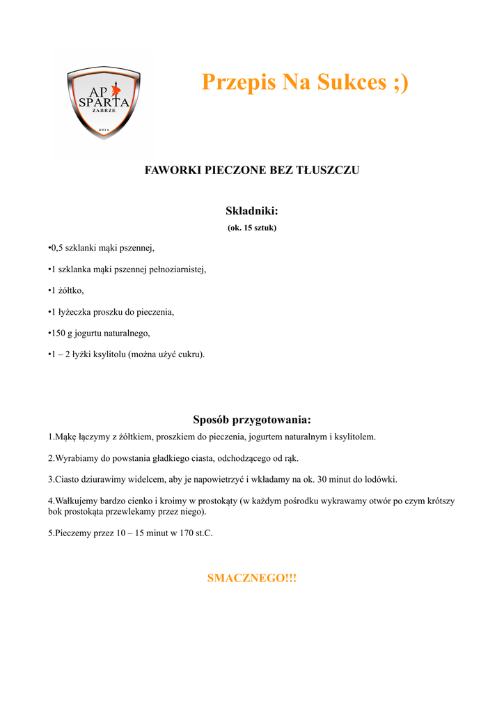 Przepis Na Sukces ;) FAWORKI PIECZONE BEZ TŁUSZCZU Składniki: (ok. 15 sztuk) •0,5 szklanki mąki pszennej, •1 szklanka mąki pszennej pełnoziarnistej, •1 żółtko, •1 łyżeczka proszku do pieczenia, •150 g jogurtu naturalnego, •1 – 2 łyżki ksylitolu (można użyć cukru). Sposób przygotowania: 1.Mąkę łączymy z żółtkiem, proszkiem do pieczenia, jogurtem naturalnym i ksylitolem. 2.Wyrabiamy do powstania gładkiego ciasta, odchodzącego od rąk. 3.Ciasto dziurawimy widelcem, aby je napowietrzyć i wkładamy na ok. 30 minut do lodówki. 4.Wałkujemy bardzo cienko i kroimy w prostokąty (w każdym pośrodku wykrawamy otwór po czym krótszy bok prostokąta przewlekamy przez niego). 5.Pieczemy przez 10 – 15 minut w 170 st.C. SMACZNEGO!!!