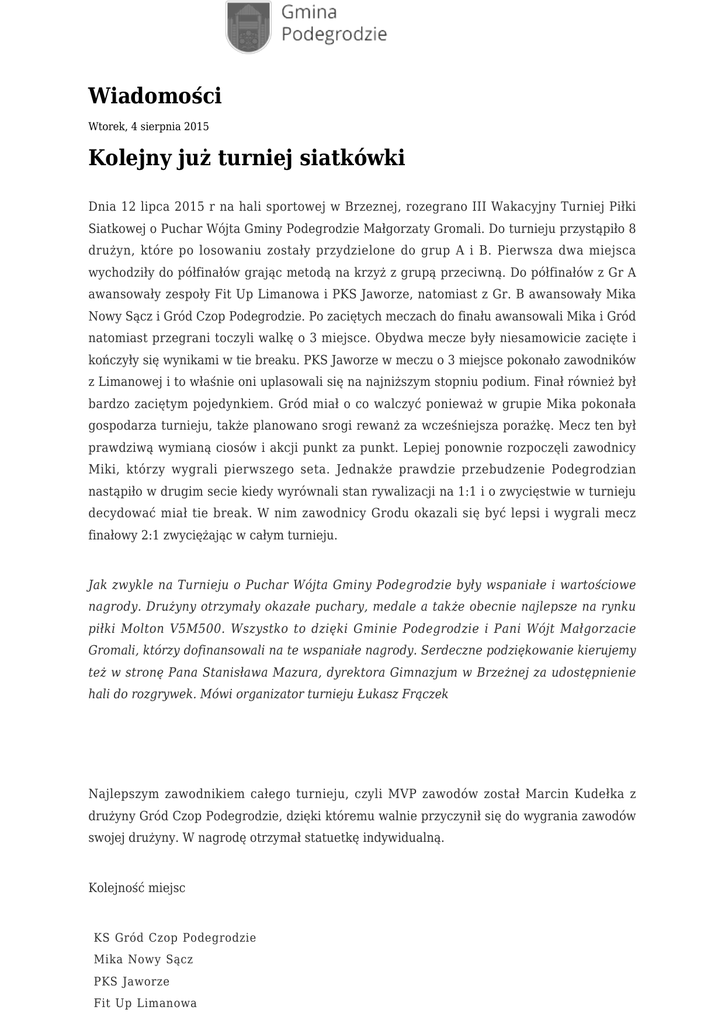 Wiadomości Wtorek, 4 sierpnia 2015 Kolejny już turniej siatkówki Dnia 12 lipca 2015 r na hali sportowej w Brzeznej, rozegrano III Wakacyjny Turniej Piłki Siatkowej o Puchar Wójta Gminy Podegrodzie Małgorzaty Gromali. Do turnieju przystąpiło 8 drużyn, które po losowaniu zostały przydzielone do grup A i B. Pierwsza dwa miejsca wychodziły do półfinałów grając metodą na krzyż z grupą przeciwną. Do półfinałów z Gr A awansowały zespoły Fit Up Limanowa i PKS Jaworze, natomiast z Gr. B awansowały Mika Nowy Sącz i Gród Czop Podegrodzie. Po zaciętych meczach do finału awansowali Mika i Gród natomiast przegrani toczyli walkę o 3 miejsce. Obydwa mecze były niesamowicie zacięte i kończyły się wynikami w tie breaku. PKS Jaworze w meczu o 3 miejsce pokonało zawodników z Limanowej i to właśnie oni uplasowali się na najniższym stopniu podium. Finał również był bardzo zaciętym pojedynkiem. Gród miał o co walczyć ponieważ w grupie Mika pokonała gospodarza turnieju, także planowano srogi rewanż za wcześniejsza porażkę. Mecz ten był prawdziwą wymianą ciosów i akcji punkt za punkt. Lepiej ponownie rozpoczęli zawodnicy Miki, którzy wygrali pierwszego seta. Jednakże prawdzie przebudzenie Podegrodzian nastąpiło w drugim secie kiedy wyrównali stan rywalizacji na 1:1 i o zwycięstwie w turnieju decydować miał tie break. W nim zawodnicy Grodu okazali się być lepsi i wygrali mecz finałowy 2:1 zwyciężając w całym turnieju. Jak zwykle na Turnieju o Puchar Wójta Gminy Podegrodzie były wspaniałe i wartościowe nagrody. Drużyny otrzymały okazałe puchary, medale a także obecnie najlepsze na rynku piłki Molton V5M500. Wszystko to dzięki Gminie Podegrodzie i Pani Wójt Małgorzacie Gromali, którzy dofinansowali na te wspaniałe nagrody. Serdeczne podziękowanie kierujemy też w stronę Pana Stanisława Mazura, dyrektora Gimnazjum w Brzeżnej za udostępnienie hali do rozgrywek. Mówi organizator turnieju Łukasz Frączek Najlepszym zawodnikiem całego turnieju, czyli MVP zawodów został Marcin Kudełka z drużyny Gród Czop Podegrodzie, dzięki któremu walnie przyczynił się do wygrania zawodów swojej drużyny. W nagrodę otrzymał statuetkę indywidualną. Kolejność miejsc KS Gród Czop Podegrodzie Mika Nowy Sącz PKS Jaworze Fit Up Limanowa 5-6 RKS Huwdu, Relax Czchów 7-8 Gród Czop Podegrodzie 2, KMP Nowy Sącz III Wakacyjny Turniej Piłki Siatkowej był realizowany przez Stowarzyszenie KS „Gród Czop Podegrodzie” przy współpracy z Gminą Podegrodzie oraz dofinansowany ze środków Gminnych dla organizacji pozarządowych Patronat medialny nad tą imprezą sprawował Sądeczanin