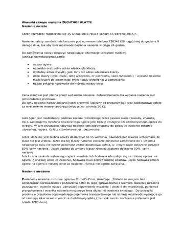 Warunki zakupu nasienia ZUCHTHOF KLATTE Nasienie świeże Sezon rozrodczy rozpoczyna się 15 lutego 2015 roku a kończy 15 sierpnia 2015 r. Nasienie należy zamówić telefonicznie pod numerem telefonu 728341120 najpóźniej do godziny 9 danego dnia, tak aby była możliwość dosłania nasienia w ciągu 24 godzin Do zamówienia należy dołączyć następujące informacje przesłane mailowo ([email protected]): nazwa ogiera nazwę związku hodowców do którego należy klacz nazwisko oraz pełny adres właściciela klaczy dokładny adres wysyłki, jeśli inny niż adres właściciela klaczy dane klaczy (imię, maść, datę urodzenia, nr paszportu, skan rodowodu) - wysłane nasienie może służyć do inseminacji tylko klaczy określonej w zamówieniu Cena stanówki jest płatna przed wydaniem nasienia. Potwierdzeniem dla wydania nasienia jest potwierdzenie przelewu. Do ceny nasienia należy doliczyć koszt przesyłki (zależny od przewoźnika) oraz każdorazowo opłatę za wystawienie weterynaryjnego świadectwa zdrowia(20 €). Jeśli ogier jest niedostępny podczas sezonu rozrodczego przez pewien okres (zawody, choroba, itp.), zaoferujemy mrożone nasienie tego ogiera jeśli będzie dostępne lub alternatywnego ogiera do wyboru. W tym przypadku nabywca nasienia jest zobowiązany do opłaty za nasienie ostatnio używanego ogiera. Opłata stanówkowa jest bezzwrotna. Jeżeli klacz nie jest źrebna należy dostarczyć do 15 września oświadczenie lekarza weterynarii, że klacz nie jest źrebna. Jeżeli dla tej klaczy nasienie zostanie ponownie zamówione do 1 kwietnia następnego roku nie będzie pobierana żadna dodatkowa opłata, w innym razie doliczone zostanie 50% ceny nasienia . Jeżeli dojdzie do zmiany klaczy również zostanie doliczone 50% ceny nasienia. Jeżeli cena nasienia wybranego ogiera wzrośnie lub hodowca zdecyduje się na zmianę ogiera na ogiera o wyższej cenie za nasienie, hodowca musi pokryć różnicę kosztów. Jeżeli hodowca zmieni ogiera na ogiera o niższej cenie za nasienie, różnica nie będzie zwracana. Nasienie mrożone Posiadamy nasienie mrożone ogierów Cornet’s Prinz, Armitage , Collado na miejscu bez konieczności sprowadzania i ponoszenia opłat za jego sprowadzenie z Niemiec. Nasienie mrożone pozostałych ogierów należy zamawiać odpowiednio wcześnie ( około 5 dni wcześniej), ponieważ przygotowanie i wysyłka nasienia mrożonego trwa dłużej niż nasienia świeżego. Do przesyłki prosimy o przesłanie odpowiedniego pojemnika transportowego lub istnieje możliwość wynajęcia go od naszego lekarza weterynarii za dodatkową opłatą ( za brak zwrotu kontenera pobierana jest opłata 1200 euro).