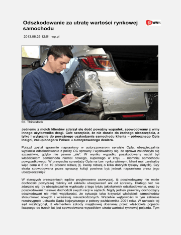 Odszkodowanie za utratę wartości rynkowej samochodu 2013.06.26 12:51 wp.pl fot. Thinkstock Jednemu z moich klientów zdarzył się dość poważny wypadek, spowodowany z winy innego użytkownika drogi. Całe szczęście, że nie doszło do żadnego nieszczęścia, a tylko i wyłącznie do poważnego uszkodzenia samochodu klienta – półrocznego Opla Insigni, zakupionego w Polsce u autoryzowanego dealera. Pojazd został sprawnie naprawiony w autoryzowanym serwisie Opla, ubezpieczalnia wypłaciła odszkodowanie z polisy OC sprawcy i wydawałoby się, że sprawa zakończyła się szczęśliwie, gdyby nie pewne „ale”. W wyniku wypadku poszkodowany nadal był właścicielem samochodu niemal nowego, kupionego w kraju – niemniej samochodu powypadkowego. W przypadku sprzedaży Opla na tzw. rynku wtórnym, klient mój uzyskałby więc cenę o 5 do 10 procent niższą (tj. kwotę niższą o kilka dobrych tysięcy złotych). Czy strata spowodowana przez sprawcę kolizji powinna być jednak naprawiona przez jego ubezpieczalnię? W starszych orzeczeniach sądów przyjmowano zazwyczaj, iż poszkodowany nie może dochodzić powyższej różnicy od zakładu ubezpieczeń ani od sprawcy. Dlatego też nie zdarzało się, by ubezpieczalnie wypłacały z tego tytułu jakiekolwiek odszkodowania, oraz by poszkodowani masowo dochodzili swych racji w sądach. Nigdy jednak prawnicy dochodzący odszkodowań nie mieli wątpliwości, że sytuacja taka krzywdzi właścicieli samochodów stosunkowo nowych i wcześniej nieuszkodzonych. Wszelkie wątpliwości w tym zakresie rozstrzygnęła uchwała Sądu Najwyższego z połowy października 2001 roku. W uchwale tej sąd rozstrzygnął, iż elementem szkody majątkowej doznanej przez właściciela pojazdu liczącego do trzech lat jest spowodowana wypadkiem utrata wartości rynkowej pojazdu. Tym samym poszkodowani w wypadkach, mogą obok zwrotu kosztów naprawy, dochodzić wyrównania utraty tej wartości. Ubezpieczalnie do wyroku tego stosują się niezwykle rzadko. Zwykle na zgłoszone roszczenie grzecznie, acz niezgodnie z prawem, odpowiadają, iż do szkody po stronie właściciela dochodzi wyłącznie wtedy, gdy samochód po wykonaniu naprawy zostanie ze stratą sprzedany. Stanowczo radzę wtedy dochodzić należnych pieniędzy w sądzie. Tego rodzaju sprawy są stosunkowo łatwe do wygrania i relatywnie szybko rozstrzygane. Należy jednak pamiętać, by do sądu występować dopiero po miarodajnym stwierdzeniu o ile spadła wartość rynkowa samochodu. W tym celu najlepiej zwrócić się do biegłego rzeczoznawcy z dziedziny mechaniki pojazdów - zwrotu kosztów opinii wydanej przez biegłego można potem dochodzić w sprawie sądowej. Zainteresowanym podaję, że wskazana przeze mnie uchwała Sądu Najwyższego wydana została w dniu 12 października 2001 roku, a jej sygnatura to: III CZP 57/01. W przypadku, gdyby jakakolwiek ubezpieczalnia kwestionowała swoją odpowiedzialność za utratę wartości rynkowej pojazdu, w piśmie zawierającym odpowiednie roszczenie należałoby powołać się na tą uchwałę. Marcin Woźniak, radca prawny z Poznania