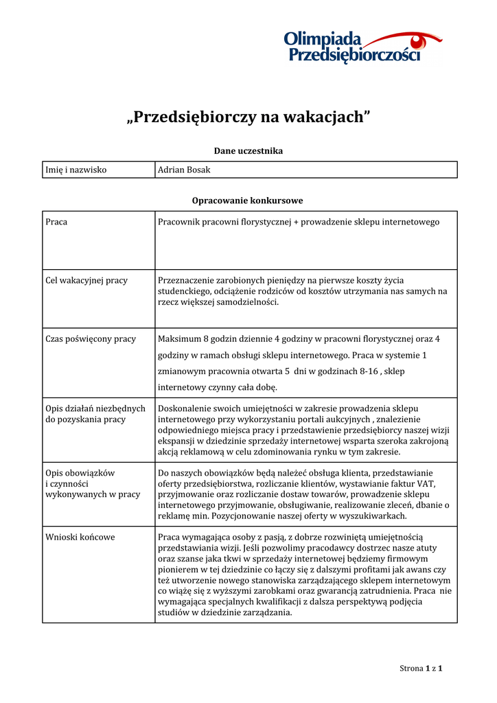 „Przedsiębiorczy na wakacjach” Dane uczestnika Imię i nazwisko Adrian Bosak Opracowanie konkursowe Praca Pracownik pracowni florystycznej + prowadzenie sklepu internetowego Cel wakacyjnej pracy Przeznaczenie zarobionych pieniędzy na pierwsze koszty życia studenckiego, odciążenie rodziców od kosztów utrzymania nas samych na rzecz większej samodzielności. Czas poświęcony pracy Maksimum 8 godzin dziennie 4 godziny w pracowni florystycznej oraz 4 godziny w ramach obsługi sklepu internetowego. Praca w systemie 1 zmianowym pracownia otwarta 5 dni w godzinach 8-16 , sklep internetowy czynny cała dobę. Opis działań niezbędnych do pozyskania pracy Doskonalenie swoich umiejętności w zakresie prowadzenia sklepu internetowego przy wykorzystaniu portali aukcyjnych , znalezienie odpowiedniego miejsca pracy i przedstawienie przedsiębiorcy naszej wizji ekspansji w dziedzinie sprzedaży internetowej wsparta szeroka zakrojoną akcją reklamową w celu zdominowania rynku w tym zakresie. Opis obowiązków i czynności wykonywanych w pracy Do naszych obowiązków będą należeć obsługa klienta, przedstawianie oferty przedsiębiorstwa, rozliczanie klientów, wystawianie faktur VAT, przyjmowanie oraz rozliczanie dostaw towarów, prowadzenie sklepu internetowego przyjmowanie, obsługiwanie, realizowanie zleceń, dbanie o reklamę min. Pozycjonowanie naszej oferty w wyszukiwarkach. Wnioski końcowe Praca wymagająca osoby z pasją, z dobrze rozwiniętą umiejętnością przedstawiania wizji. Jeśli pozwolimy pracodawcy dostrzec nasze atuty oraz szanse jaka tkwi w sprzedaży internetowej będziemy firmowym pionierem w tej dziedzinie co łączy się z dalszymi profitami jak awans czy też utworzenie nowego stanowiska zarządzającego sklepem internetowym co wiążę się z wyższymi zarobkami oraz gwarancją zatrudnienia. Praca nie wymagająca specjalnych kwalifikacji z dalsza perspektywą podjęcia studiów w dziedzinie zarządzania. Strona 1 z 1