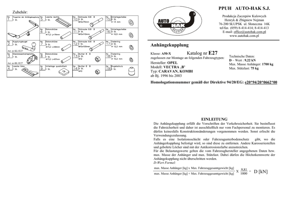 Anhängekupplung Katalog nr E27 = D [kN] PPUH AUTO