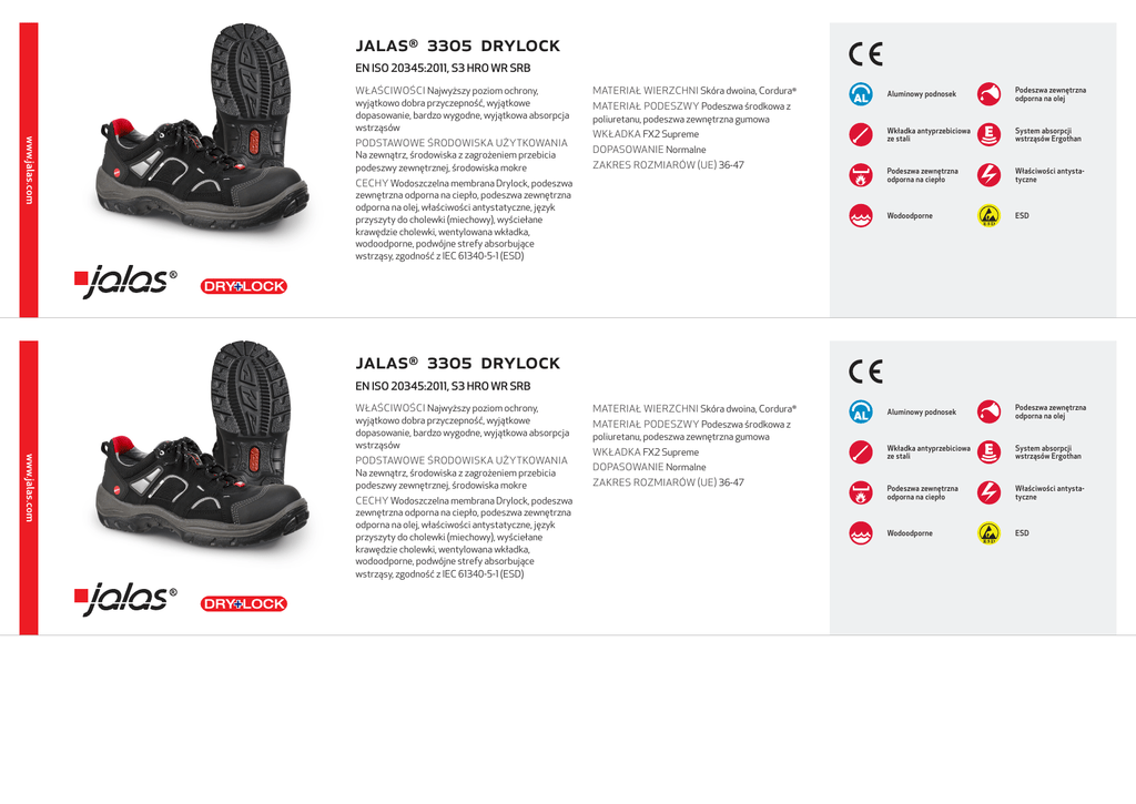 JALAS® 3305 Drylock EN ISO 20345:2011, S3 HRO WR SRB WŁAŚCIWOŚCI Najwyższy poziom ochrony, wyjątkowo dobra przyczepność, wyjątkowe dopasowanie, bardzo wygodne, wyjątkowa absorpcja wstrząsów PODSTAWOWE ŚRODOWISKA UŻYTKOWANIA Na zewnątrz, środowiska z zagrożeniem przebicia podeszwy zewnętrznej, środowiska mokre MATERIAŁ WIERZCHNI Skóra dwoina, Cordura® Aluminowy podnosek Podeszwa zewnętrzna odporna na olej Wkładka antyprzebiciowa ze stali System absorpcji wstrząsów Ergothan Podeszwa zewnętrzna odporna na ciepło Właściwości antystatyczne Wodoodporne ESD Aluminowy podnosek Podeszwa zewnętrzna odporna na olej Wkładka antyprzebiciowa ze stali System absorpcji wstrząsów Ergothan Podeszwa zewnętrzna odporna na ciepło Właściwości antystatyczne Wodoodporne ESD MATERIAŁ PODESZWY Podeszwa środkowa z poliuretanu, podeszwa zewnętrzna gumowa WKŁADKA FX2 Supreme DOPASOWANIE Normalne ZAKRES ROZMIARÓW (UE) 36-47 CECHY Wodoszczelna membrana Drylock, podeszwa zewnętrzna odporna na ciepło, podeszwa zewnętrzna odporna na olej, właściwości antystatyczne, język przyszyty do cholewki (miechowy), wyściełane krawędzie cholewki, wentylowana wkładka, wodoodporne, podwójne strefy absorbujące wstrząsy, zgodność z IEC 61340-5-1 (ESD) JALAS® 3305 Drylock EN ISO 20345:2011, S3 HRO WR SRB WŁAŚCIWOŚCI Najwyższy poziom ochrony, wyjątkowo dobra przyczepność, wyjątkowe dopasowanie, bardzo wygodne, wyjątkowa absorpcja wstrząsów PODSTAWOWE ŚRODOWISKA UŻYTKOWANIA Na zewnątrz, środowiska z zagrożeniem przebicia podeszwy zewnętrznej, środowiska mokre CECHY Wodoszczelna membrana Drylock, podeszwa zewnętrzna odporna na ciepło, podeszwa zewnętrzna odporna na olej, właściwości antystatyczne, język przyszyty do cholewki (miechowy), wyściełane krawędzie cholewki, wentylowana wkładka, wodoodporne, podwójne strefy absorbujące wstrząsy, zgodność z IEC 61340-5-1 (ESD) MATERIAŁ WIERZCHNI Skóra dwoina, Cordura® MATERIAŁ PODESZWY Podeszwa środkowa z poliuretanu, podeszwa zewnętrzna gumowa WKŁADKA FX2 Supreme DOPASOWANIE Normalne ZAKRES ROZMIARÓW (UE) 36-47