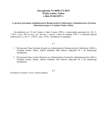 Zarządzenie Nr 0050.171.2015 Wójta Gminy Nędza z dnia 01.06.2015 r. w sprawie powołania Administratora Bezpieczeństwa Informacji i Administratora Systemu Informatycznego w Urzędzie Gminy Nędza Na podstawie art. 33 ust.3 ustawy z dnia 8 marca 1990 r. o samorządzie gminnym (t.j. Dz. U. z 2013 r. poz. 594 ze zm.), art. 36a ust. 1 ustawy z dnia 29 sierpnia 1997 r. o ochronie danych osobowych ( t.j. Dz. U. z 2014 r., poz. 1182), zarządzam co następuje: §1 1. Wyznaczam Pana Konrada Koguta na Administratora Bezpieczeństwa Informacji (ABI) w Urzędzie Gminy Nędza. Zakres działania ABI stanowi załącznik Nr 1 do niniejszego zarządzenia. 2. Wyznaczam Pana Leszka Pietrasza na Administratora Systemów Informatycznych (ASI) w Urzędzie Gminy Nędza. Zakres działania ASI stanowi załącznik Nr 2 do niniejszego zarządzenia. §2 Zarządzenie wchodzi w życie z dniem podjęcia. Załącznik nr 1 do Zarządzenia nr 0050.171.2015 Wójta Gminy Nędza z dnia 01.06.2015 r. Zakres działania Administratora Bezpieczeństwa Informacji (ABI) Do zadań Administratora Bezpieczeństwa Informacji należy : Stosowanie środków technicznych i organizacyjnych zapewniających ochronę przetwarzania danych odpowiednią do zagrożeń oraz kategorii danych objętych ochroną, a w szczególności zabezpieczenie danych przed ich udostępnianiem osobom nieupoważnionym, zabraniem przez osobę nieupoważnioną, przetwarzaniem z naruszeniem ustawy, utratą, uszkodzeniem lub zniszczeniem. 1. Zapewnianie przestrzegania przepisów o ochronie danych osobowych, w szczególności przez: a) sprawdzanie zgodności przetwarzania danych osobowych z przepisami o ochronie oraz opracowanie w tym zakresie sprawozdania dla administratora danych osobowych danych, b) nadzorowanie opracowania i aktualizowania dokumentacji, o której mowa w art. 36 ust. 2, oraz przestrzegania zasad w niej określonych, c) zapewnianie zapoznania osób upoważnionych do przetwarzania danych osobowych z przepisami o ochronie danych osobowych; 2. Prowadzenie rejestru zbiorów danych przetwarzanych przez administratora danych, z wyjątkiem zbiorów, o których mowa w art. 43 ust. 1, zawierającego nazwę zbioru oraz informacje, o których mowa w art. 41 ust. 1 pkt 2-4a i 7. 3. Nadzór nad fizycznym zabezpieczeniem pomieszczeń, w których przetwarzane są dane osobowe oraz kontrola przebywających w nich osób. 4. Nadzór nad naprawami, konserwacją oraz likwidacją urządzeń komputerowych na których zapisywane są dane osobowe. 5. Nadzór nad zarządzaniem hasłami użytkowników i przestrzeganiem procedur określających częstotliwość ich zmiany. 6. Nadzór nad czynnościami związanymi ze sprawdzaniem systemu pod kątem obecności wirusów komputerowych. 7. Przeciwdziałanie dostępowi osób niepowołanych do przetwarzania danych osobowych. 8. Kontrola nad danymi osobowymi wprowadzonymi do zbiorów (przez kogo zostały wprowadzone, komu są przekazywane). 9. Podejmowanie odpowiednich działań w przypadku wykrycia naruszeń lub podejrzenia naruszenia zabezpieczeń. 10. Nadzór nad obiegiem oraz przechowywaniem dokumentów zawierających dane osobowe. 11. Nadzór nad prawidłowością archiwizacji oraz usuwania danych osobowych. 12. Monitorowanie zabezpieczeń wdrożonych w celu ochrony danych osobowych. Załącznik nr 2 do Zarządzenia nr 0050.171.2015 Wójta Gminy Nędza z dnia 01.06.2015 r. Zakres działania Administratora Systemu Informatycznego (ASI) Administrator Systemu Informatycznego, w zakresie zadań wykonywanych dla zapewnienia systemom bezpieczeństwa, zgodnego z celami i metodologią wdrożonej polityki bezpieczeństwa informacji, współpracuje bezpośrednio z Administratorem Bezpieczeństwa Informacji (ABI). Do zadań Administratora Systemu Informatycznego należy: 1. Formułowanie, w uzgodnieniu z administratorem danych i/lub osobami, do których administrator delegował zarządzanie uprawnieniami oraz ABI, sposobu określania uprawnień w systemach informatycznych. 2. Realizacja decyzji Administratora Danych Osobowych ( innych) odnośnie nadania osobom uprawnień dostępu do danych i wybranych funkcji narzędzi służących do ich przetwarzania, w środowisku IT Urzędu tj.: a) tworzenie kont użytkowników w systemach informatycznych, b) przypisywanie, do kont, startowych haseł uwierzytelniających użytkowników tych kont, c) przypisywanie do założonych kont polityk odnośnie jakości haseł i częstotliwości ich zmiany, d) resetowanie utraconych haseł, e) usuwanie kont i uprawnień dla kont osób które zakończyły pracę w Urzędzie, f) dostarczanie ABI informacji potrzebnych do oceny prawidłowości funkcjonowania sprzętowo-programowych. 3. Planowanie inwestycji oraz dostaw i usług niezbędnych dla utrzymania i rozwoju środowiska IT w Urzędzie Gminy. 4. Planowanie i wykonywanie zadań związanych z tworzeniem kopii bezpieczeństwa systemów i danych. 5. Automatyzacja zadań konserwacyjnych w systemie – w tym wykonywania kopii zapasowych oprogramowania i danych. 6. Monitorowanie stanu środowiska IT, stanu sprzętu IT i wykorzystywanego oprogramowania oraz aktywności sieciowej użytkowników. 7. Monitorowanie legalności oprogramowania wykorzystywanego na stacjach roboczych. 8. Zapewnienie serwerom i stacjom roboczym niezbędnych licencji programowych. 9. Systematyczne aktualizowanie oprogramowania systemowego, aplikacyjnego i ochronnego. 10. Zapewnienie eksploatowanym systemom opieki serwisowej producenta – zawieranie umów regulujących formy tej opieki. 11. Rozwiązywanie, samodzielnie i we współpracy z pozostałym personelem IT, problemów towarzyszących eksploatacji systemów informatycznych. 12. Przygotowywanie, we współpracy z ABI instrukcji dla użytkowników systemów informatycznych zgodnych z celami i metodologią wdrożonej polityki bezpieczeństwa informacji. 13. Prowadzenie szkoleń na temat bezpiecznych zachowań użytkowników w środowisku systemów IT.