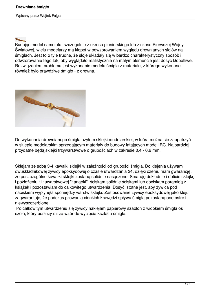 Drewniane śmigło Wpisany przez Wojtek Fajga Budując model samolotu, szczególnie z okresu pionierskiego lub z czasu Pierwszej Wojny Światowej, wielu modelarzy ma kłopot w odwzorowaniem wyglądu drewnianych słojów na śmigłach. Jest to o tyle trudne, że słoje układały się w bardzo charakterystyczny sposób i odwzorowanie tego tak, aby wyglądało realistycznie na małym elemencie jest dosyć kłopotliwe. Rozwiązaniem problemu jest wykonanie modelu śmigła z materiału, z którego wykonane również było prawdziwe śmigło - z drewna. Do wykonania drewnianego śmigła użyłem sklejki modelarskiej, w którą można się zaopatrzyć w sklepie modelarskim sprzedającym materiały do budowy latających modeli RC. Najbardziej przydatne będą sklejki trzywarstwowe o grubościach w zakresie 0,4 - 0,6 mm. Sklejam ze sobą 3-4 kawałki sklejki w zależności od grubości śmigła. Do klejenia używam dwuskładnikowej żywicy epoksydowej o czasie utwardzania 24, dzięki czemu mam gwarancję, że poszczególne kawałki sklejki zostaną solidnie nasączone. Smaruję dokładnie i obficie sklejkę i pożłożeniu kilkuwarstwowej "kanapki" ściskam solidnie ściskami lub dociskam poramidą z książek i pozostawiam do całkowitego utwardzenia. Dosyć istotne jest, aby żywica pod naciskiem wypłynęła spomiędzy warstw sklejki. Zastosowanie żywicy epoksydowej jako kleju zagwarantuje, że podczas piłowania cienkich krawędzi spływu śmigła pozostaną one ostre i niewyszczerbione. Po całkowitym utwardzeniu się żywicy naklejam papierowy szablon z widokiem śmigła os czoła, który posłuży mi za wzór do wycięcia kształtu śmigła. 1/3 Drewniane śmigło Wpisany przez Wojtek Fajga Do zgrubnego szablonu wykonuję wycięcia przykształtu pomocyśmigła pilników w używam iglaków. piłki włosowe, a dokładne dopasowanie do Do wyprofilowania wysokoobrotowej obrabianego cienkimi śmigle i starać warstwami, śmigła sięfrezarki tak łopaty będzie od zbierać czasu śmigła typu znacznie materiał, Dremel doużywam czasu większe. z aby odpowiednim przyglądać nożyka tenPodczas przebieg modelarskiego. sięfrezem, jak tych słojów rozkładają operacji jednak odwzorować. Można warto ryzyko sięteż słoje materiał skorzystać uszkodzenia na prawdziwym zdejmować z Po obróbce już przy pomocy nożykiem pilników modelarskim iglaków i kawałków dokładną papieru obróbkęściernego i wyprofilowanie o rosnącej łopaty gradacji. śmigła wykonuję W zależności może różnić się odwyglądem. grubości sklejki W rzeczywistości oraz od grubości śmigła warstw, były wykonywane z których wykonano z 9-11 warstw sklejkędrewna. śmigło Ostatnią smoke. transparentnymi delikatnie Wczynnością po zależności każdej pokrywam warstwie. jest od ilości pomalowanie śmigło dzięki warstw jeszcze temu można śmigła. powierzchnia kilkoma uzyskać Używam warstwami różny łopat do tego kolor śmigła lakieru farb śmigła.Poza jest transparentnych bezbarwnego gładka, farbami satynowa. szlifując orange i 2/3 Drewniane śmigło Wpisany przez Wojtek Fajga Tak prezentuje się śmigło zamontowane w gotowym modelu. Podyskutujmy o tym na forum ! 3/3