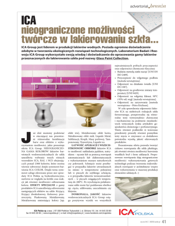 advertorialX branĝa ICA nieograniczone moĝliwoĂci twórcze wblakierowaniu szkïa... ICA Group jest liderem w produkcji lakierów wodnych. Posiada ogromne doświadczenie zdobyte w tworzeniu ekologicznych rozwiązań technologicznych. Laboratorium Badań i Rozwoju ICA Group wykorzystało swoją wiedzę i doświadczenie do opracowania gamy lakierów przeznaczonych do lakierowania szkła pod nazwą: Glass Paint Collection. J uż dziś możemy podziwiać w otaczającej nas przestrzeni różnorodne kombinacje barw oraz efektów z wykorzystaniem możliwości, jakie prezentuje oferta ICA Group. NIEOGRANICZONA GAMA KOLORÓW lakierów barwionych wodorozcieńczalnych do szkła umożliwia wybranie trzech różnych wzorników ICA, RAL i NCS obejmujących ponad 2300 kolorów, które można wiernie odtworzyć dzięki systemowi barwienia ICA COLOR. Dzięki temu systemowi usługi oferowane przez sieć sprzedaży ICA Polska są bezkonkurencyjne, zarówno ze względu na krótki czas reakcji jak również możliwości odtwarzania koloru. EFEKTY SPECJALNE z gamy produktów ICA umożliwiają odtworzenie następujących efektów na szkle: Kryjący, Kryjący dwukolorowy, Kolorowy przezroczysty, Piaskowany, Metalizowany, Metalizowany zmieniający kolory [np. efekt iris], Metalizowany efekt lustra, Metalizowany efekt stali, Liquide Metal, Sublimacji, Kropli, Masy perłowej, Tamponowany, Trawertynu, Liquide ice. ŁATWOŚĆ APLIKACJI I WSZECHSTRONNOŚĆ OBRÓBKI lakierów ICA to możliwość nakładania pędzlem, natryskiem – ręcznie lub za pomocą rozwiązań automatycznych lub elektrostatycznych z wykorzystaniem maszyn natryskowych czy polewarek. Schnięcie może przebiegać w przypadku lakierów utwardzanych na zimno w temperaturze pokojowej lub w piecach do szybkiego schnięcia, a w przypadku lakierów termoutwardzalnych – w piecach osiągających temperaturę do 200°C. Po wyschnięciu polakierowane szkło może być poddawane obróbce np. cięciu, szlifowaniu, uszczelnianiu czy klejeniu. DOSKONAŁA, JAKOŚĆ lakierów wodorozcieńczalnych ICA Group osiąga pozytywne wyniki we wszystkich najważniejszych próbach przyczepności oraz odporności chemiczno-fizycznej: • Badania metodą siatki nacięć [UNI EN ISO 2409]. • Przyczepność do wilgotnego podłoża [metoda wewnętrzna]. • Odporność na działanie światła [UNI EN 1587]. • Odporność na gwałtowne zmiany temperatury [UNI 9429]. • Odporność na wilgotny klimat, 50°C i 95% wil. wzgl. [metoda wewnętrzna]. • Odporność na zarysowania [metoda wewnętrzna – Pióro Erichsen]. W celu sprawdzenia odporności lakierów ICA na niektórych rodzajach szkła formowanego, przeprowadza się różnorodne testy wytrzymałości chemicznej i mechanicznej na podstawie standardowych wytycznych rynku artykułów gospodarstwa domowego i perfumeryjnego. Warto również podkreślić iż testowane przedmioty przeszły również pomyślnie testy mycia w zmywarce co dodatkowo potwierdza wysoką jakość oferowanych produktów. Prezentowana oferta pozwala tworzyć ciekawe rozwiązania dla szkła płaskiego, jak również otwiera możliwości barwienia wszelkich brył i form szklanych. Proponowane rozwiązania dają nieograniczone możliwości wykorzystywania gotowych technologii podczas tworzenia indywidualnych rozwiązań w architekturze wnętrz oraz wykorzystania w masowej produkcji elementów szklanych. d ICA Polska sp. zbo.o. | 97-300 Piotrków Trybunalski | ul. Gliniana 10 | tel. 44b645 30 80 fax 44b645 30 65 | www.icapolska.pl | e-mail: [email protected] | www.facebook.com/icapolska styczeñ 2017 [ BIZNES meble.pl 41