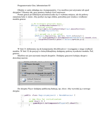 Programowanie Gier, laboratorium 03 Obiekty w unity składają się z komponentów. Czy możliwe jest używanie ich spod skryptów? Niestety tak, przy pomocy funkcji GetComponent. Postać gracza po kliknięciu przemieszczała się w wybrane miejsce, ale do połowy zanużona była w ziemi. Aby pozbyć się tego efektu, potrzebna jest wiedza o wielkości modelu gracza: W linii 31 dobieramy się do komponentu MeshRenderer i wyciągamy z niego wielkość modelu. W linii 32 do pozycji w którą kliknęliśmy dodajemy połowę wysokości modelu. Puf, gotowe. Możliwe też jest używanie innych skryptów. Dodajmy graczowi kolejny skrypt o dowolnej nazwie: Do skryptu Player dodajmy publiczną funkcję, np. shoot. Aby wywołać ją z nowego skryptu: Póki co, postać gracza może chodzić gdzie chce. Ograniczmy jej swobodę i wstawmy „Niewidzialne Ściany Chodzenia Na Łatwiznę”. Stwórzmy kostkę i powiększmy ją tak, żeby mogła uchodzić za ścianę, a potem przenieśmy do okna Assets – utworzymy prefabrykat (obiekt z niebieską nazwą w oknie Hierarchy). Wstawmy kilka na scenę w miejscach, w które nie chcemy wpuścić gracza. Kolejną rzeczą jaką trzeba zrobić jest ustawienie warstw obiektów: ścian oraz terenu. Rozwińmy listę „Layer”, stwórzmy dwie warstwy o nazwach np. „Teren” oraz „Przeszkoda” i ustawmy je obiektom: Pora na C# – włączmy skrypt postaci gracza i zmodyfikujmy ruch: Tak jak początkowo, sprawdzamy czy klawisz został wciśnięty oraz wystrzeliwujemy promień. Tym razem jednak, szukamy tylko obiektów znajdujących się na pewnej warstwie, a konkretnie na warstwie nazwanej „Teren”. Jeśli trafimy w teren, to sprawdzamy czy w promieniu 1.0 jednostki od trafionego punktu, na warstwie „Przeszkoda” znajduje się jakiś obiekt. Jeśli nie – postać może się tam ruszyć. Identyfikatory warstw są maskami bitowymi, aby możliwe było jednoczesne sprawdzanie kilku warstw. Funkcja Physics.CheckSphere sprawdza kolizję kuli z dowolnym obiektem (na podanej warstwie). W linii 31 przed Physics.CheckSphere(...) jest znak !. Postać się rusza, jednak dla testów chcemy, aby zaznaczony był punkt do którego idzie postać. Linia dodana, postać się rusza ale nic nie widać. Dlaczego? Bo nie kliknęliśmy magicznego przycisku „Gizmos” który powoduje, że rysowane są wszystkie debugowe cuda. Na koniec przydałoby się jeszcze sprawić, że nasze Niewidzialne Ściany Chodzenia Na Łatwiznę staną się rzeczywiście niewidzialne – wyłączmy im komponent Mesh Renderer.