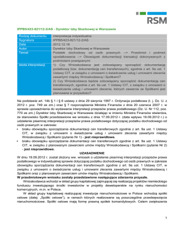 IPPB5/423-821/12-2/AS - Dyrektor Izby Skarbowej w Warszawie Rodzaj dokumentu Sygnatura Data Autor Temat Istota interpretacji interpretacja indywidualna IPPB5/423-821/12-2/AS 2012.12.18 Dyrektor Izby Skarbowej w Warszawie Podatek dochodowy od osób prawnych --> Przedmiot i podmiot opodatkowania --> Obowiązek dokumentacji transakcji dokonywanych z podmiotami powiązanymi 1) Czy Wnioskodawca jest zobowiązany sporządzić dokumentację podatkową (tzw. dokumentację cen transferowych), zgodnie z art. 9a ust. 1 Ustawy CIT, w związku z umowami o świadczenie usług i umowami zlecenia zawartymi między Wnioskodawcą i Spółkami? 2) Czy Wnioskodawca będzie zobowiązany sporządzić dokumentację cen transferowych, zgodnie z art. 9a ust. 1 Ustawy CIT, z związku z umowami o świadczenie usług i umowami zlecenia, których zawarcie ze Spółkami jest planowane w przyszłości? Na podstawie art. 14b § 1 i § 6 ustawy z dnia 29 sierpnia 1997 r. Ordynacja podatkowa (t. j. Dz. U. z 2012 r. poz. 749 ze zm.) oraz § 7 rozporządzenia Ministra Finansów z dnia 20 czerwca 2007 r. w sprawie upoważnienia do wydawania interpretacji przepisów prawa podatkowego (Dz. U. Nr 112, poz. 770 ze zm.) Dyrektor Izby Skarbowej w Warszawie działając w imieniu Ministra Finansów stwierdza, że stanowisko Spółki przedstawione we wniosku z dnia 17.09.2012 r. (data wpływu 19.09.2012 r.) o udzielenie pisemnej interpretacji przepisów prawa podatkowego dotyczącej podatku dochodowego od osób prawnych w zakresie: braku obowiązku sporządzania dokumentacji cen transferowych zgodnie z art. 9a ust. 1 Ustawy CIT, w związku z umowami o świadczenie usług i umowami zlecenia zawartymi między Wnioskodawcą i Spółkami (pytanie Nr 1) - jest nieprawidłowe. braku obowiązku sporządzania dokumentacji cen transferowych zgodnie z art. 9a ust. 1 Ustawy CIT, w związku z planowanym zawarciem umów między Wnioskodawcą i Spółkami (pytanie Nr 2) - jest nieprawidłowe. UZASADNIENIE W dniu 19.09.2012 r. został złożony ww. wniosek o udzielenie pisemnej interpretacji przepisów prawa podatkowego w indywidualnej sprawie dotyczącej podatku dochodowego od osób prawnych w zakresie obowiązku sporządzania dokumentacji cen transferowych zgodnie z art. 9a ust. 1 Ustawy CIT, w związku z umowami o świadczenie usług i umowami zlecenia zawartymi między Wnioskodawcą i Spółkami oraz z planowanym zawarciem umów między Wnioskodawcą i Spółkami. W przedmiotowym wniosku zostały przedstawione następujące zdarzenia przyszłe. Wnioskodawca wchodzi w skład grupy kapitałowej zajmującej się realizacją projektów niemieckiego funduszu inwestującego środki inwestorów w projekty deweloperskie na rynku nieruchomości komercyjnych, m.in. w Polsce. W skład grupy kapitałowej realizującej inwestycje nieruchomościowe w Polsce wchodzą spółki celowe (dalej: „Spółki celowe”), w ramach których realizowane są poszczególne przedsięwzięcia nieruchomościowe. Spółki celowe mają formę prawną spółek komandytowych. Celem zwiększenia 1 efektywności działania grupy w Polsce, we Wnioskodawcy skoncentrowane zostały funkcje związane z obsługą operacyjną poszczególnych Spółek celowych. W tym celu Wnioskodawca zawiera ze Spółkami celowymi umowy o świadczenie usług, obejmujących: a. Obserwację rynku; b. Poszukiwanie nieruchomości, na których możliwe jest wybudowanie obiektu; c. Przeprowadzenie badania prawnego, ekonomicznego i technicznego nieruchomości; d. Usługi tłumaczeniowe; e. Poszukiwania najemców obiektu lub jego części; f. Usługi marketingowe; g. Zarządzanie projektami, w tym nadzór nad prowadzonymi pracami budowlanymi; h. Usługi prawne; i. Doradztwo przy zakupie i sprzedaży nieruchomości; j. Pomoc przy uzgodnieniu i zapewnieniu warunków finansowania transakcji. Z tytułu świadczonych usług Wnioskodawca otrzymuje od Spółek celowych stosowne wynagrodzenie, zgodnie z postanowieniami zawartych umów. Komplementariuszami w Spółkach celowych są spółki z ograniczoną odpowiedzialnością wchodzące w skład grupy kapitałowej. Do reprezentowania Spółek celowych upoważnione są osoby reprezentujące komplementariusza. Zarówno w zarządzie Wnioskodawcy, jak i w zarządzie spółek z ograniczoną odpowiedzialnością będących komplementariuszami Spółek celowych stanowiska obejmują te same osoby fizyczne. Ponadto Wnioskodawca nie wyklucza zawierania ze Spółkami celowymi umów o świadczenie usług, na podstawie których będą świadczone usługi, jak opisano powyżej. W związku z powyższym zadano następujące pytania. 1. Czy Wnioskodawca jest zobowiązany sporządzić dokumentację podatkową (tzw. dokumentację cen transferowych), zgodnie z art. 9a ust. 1 Ustawy CIT, w związku z umowami o świadczenie usług i umowami zlecenia zawartymi między Wnioskodawcą i Spółkami... 2. Czy Wnioskodawca będzie zobowiązany sporządzić dokumentację cen transferowych, zgodnie z art. 9a ust. 1 Ustawy CIT, z związku z umowami o świadczenie usług i umowami zlecenia, których zawarcie ze Spółkami jest planowane w przyszłości... Zdaniem Wnioskodawcy, nie jest on zobowiązany do sporządzenia dokumentacji cen transferowych, o której mowa w art. 9a ust. 1 Ustawy CIT, w związku z umowami zawartymi między Wnioskodawcą i Spółkami. Podobnie nie będzie on zobowiązany do sporządzania dokumentacji cen transferowych, o której mowa w art. 9a ust. I Ustawy CIT, w związku z planowanym zawarciem umów między Wnioskodawcą i Spółkami. Zgodnie z art. 9a ust. 1 Ustawy CIT, podatnicy dokonujący transakcji z podmiotami powiązanymi z tymi podatnikami - w rozumieniu art. 11 ust. l i 4 Ustawy CIT - lub transakcji, w związku z którymi zapłata należności wynikających z takich transakcji dokonywana jest bezpośrednio lub pośrednio na rzecz podmiotu mającego miejsce zamieszkania, siedzibę lub zarząd na terytorium lub w kraju stosującym szkodliwą konkurencję podatkową są
