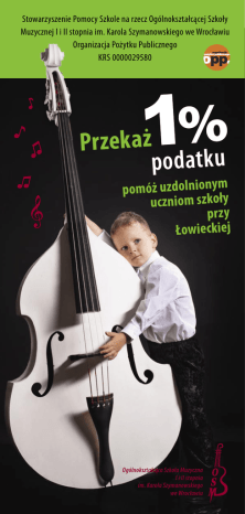 Stowarzyszenie Pomocy Szkole na rzecz Ogólnokształcącej Szkoły Muzycznej I i II stopnia im. Karola Szymanowskiego we Wrocławiu Organizacja Pożytku Publicznego KRS 0000029580 P r ze k a ż p o d at k u pomóż uzdolnionym uczniom szkoły przy Łowieckiej Ogólnokształcąca Szkoła Muzyczna I i II stopnia im. Karola Szymanowskiego we Wrocławiu Celem Stowarzyszenia jest wszechstronne propagowanie edukacji muzycznej, a w szczególności: ♫ wspieranie Ogólnokształcącej Szkoły Muzycznej I i II stopnia im. Karola Szymanowskiego we Wrocławiu, ♫ dbałość o rozwój życia muzycznego i doskonalenie umiejętności muzycznych wśród uczniów szkoły, ♫ popieranie i promocja różnych form edukacji muzycznej. Przekazując 1% podatku na rzecz naszego stowarzyszenia należy w formularzu PIT odnaleźć punkt: „Wniosek o przekazanie 1% podatku należnego na rzecz organizacji pożytku publicznego (OPP)” i wpisać: • w pozycji „Numer KRS”: 0000029580 • w pozycji „Wnioskowana kwota”: kwotę równą 1% podatku