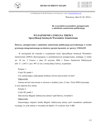 BIURO OCHRONY RZĄDU Tel. Tel. Tel. Fax (+48 22) 606 50 00 (+48 22) 606 51 01 (+48 22) 606 51 36 (+48 22) 606 51 07 ul. Podchorążych 38, 00-463 Warszawa, www.bor.gov.pl, e-mail: [email protected] Warszawa, dnia 24. 02. 2016 r. Do wszystkich uczestników postępowania o udzielenie zamówienia publicznego WYJAŚNIENIE I ZMIANA TREŚCI Specyfikacji Istotnych Warunków Zamówienia Dotyczy: postępowania o udzielenie zamówienia publicznego prowadzonego w trybie przetargu nieograniczonego na dostawę sprzętu łączności, nr sprawy 3/2016/ZP. W nawiązaniu do wniosku o wyjaśnienie treści Specyfikacji Istotnych Warunków Zamówienia (SIWZ) obowiązującej w przedmiotowym postępowaniu, działając w trybie art. 38 ust. 2 Ustawy z dnia 29 stycznia 2004 r. Prawo Zamówień Publicznych (Dz. U. z 2013 r. poz. 907 ze zm.) zwaną dalej Ustawą, wyjaśniam: Pytanie 1: Część III, punkt 1 Czy zamawiający zaakceptuje średnicę otworu mocowania 16 mm? Odpowiedź: Antena ma być mocowana w otworze o średnicy max 12 mm. Treść SIWZ pozostaje w tym zakresie bez zmian. Pytanie 2: Część III, punkt 1 Jaka ma być długość elektryczna anteny? (pół falowa, ćwiartka?) Odpowiedź: Zamawiający dopuści każdą długość elektryczną anteny pod warunkiem spełnienia wymogu, że zysk anteny w stosunku do dipola 1/4 wyniesie min. 0 dBi. 1/3 Pytanie 3: Część III, punkt 2 Jaka ma być długość elektryczna anteny? (pół falowa, ćwiartka?) Odpowiedź: Zamawiający dopuści każdą długość elektryczną anteny pod warunkiem spełnienia wymogu że zysk anteny w stosunku do dipola 1/4 wyniesie min. 0 dBi. Pytanie 4: Część III, punkt 2 Co zamawiający ma na myśli poprzez sformułowanie ,,podłączenie za pomocą złącza UC-1”?. Czy złącze UC-1 ma znajdować się na podstawie magnetycznej czy na przewodzie wychodzącym z podstawy? Odpowiedź: Złącze UC-1(Gniazdo UC-1) ma znajdować się w podstawie anteny. Zmiana treści Specyfikacji Istotnych Warunków Zamówienia. Załącznik nr 1 do SIWZ w części III pkt. 1 i 2 - otrzymuje brzmienie: 2/3 1. 2. Antena samochodowa VHF (możliwość dostrojenia do pracy w paśmie min. 146174MHz), mocowana w otworze o średnicy max. 12mm, podłączana za pomocą kabla RG-58, moc. max. min. 80W, zysk w stosunku do dipola 1/4 min. 0 dBi, część odbiorcza wykonana ze stali nierdzewnej, elastyczna, mocowana do podstawy za pośrednictwem elementu amortyzującego (sprężyny), z możliwością odłączenia promiennika od podstawy, mocowanie pręta do podstawy za pomocą nakrętki motylkowej, z możliwością pochylenia w zakresie ±90°. W skład zestawu wchodzi: pręt, podstawa, odłączalny konektor. Antena VHF magnetyczna (możliwość dostrojenia do pracy w paśmie min. 146174MHz), moc max. min. 60W, zysk w stosunku do dipola 1/4 min. 0 dBi, promiennik wykonany ze stali nierdzewnej, siła zrywająca podstawę od podłoża min. 180N (podłoże z materiału magnetycznego, średnica podstawy 80-110mm). Podłączenie za pomocą złącza UC-1(Gniazdo UC-1) ma znajdować się w podstawie anteny. Antena składająca się z: podstawy, pręta mocowanego do podstawy za pomocą nakrętki motylkowej. szt. 50 kpl. 50 Przedmiotowe wyjaśnienie treści SIWZ jest wiążące i należy je uwzględnić w składanej ofercie. 3/3